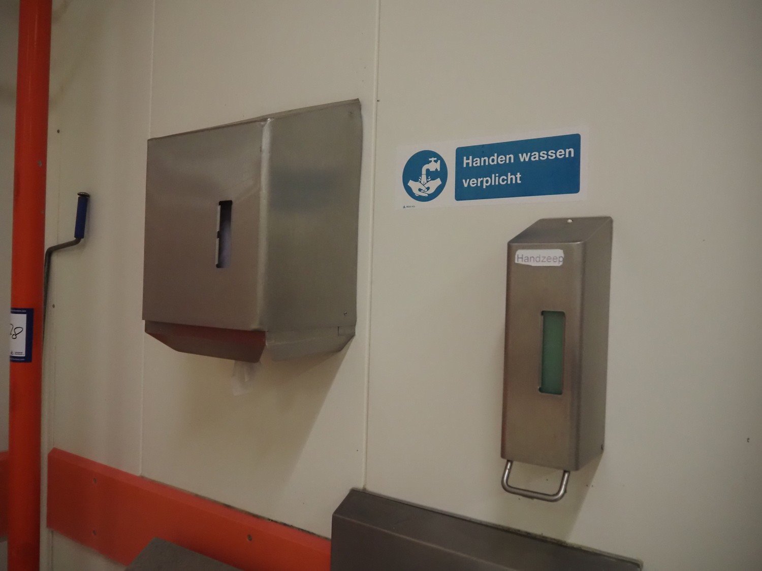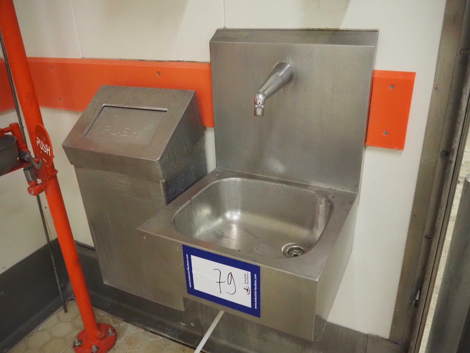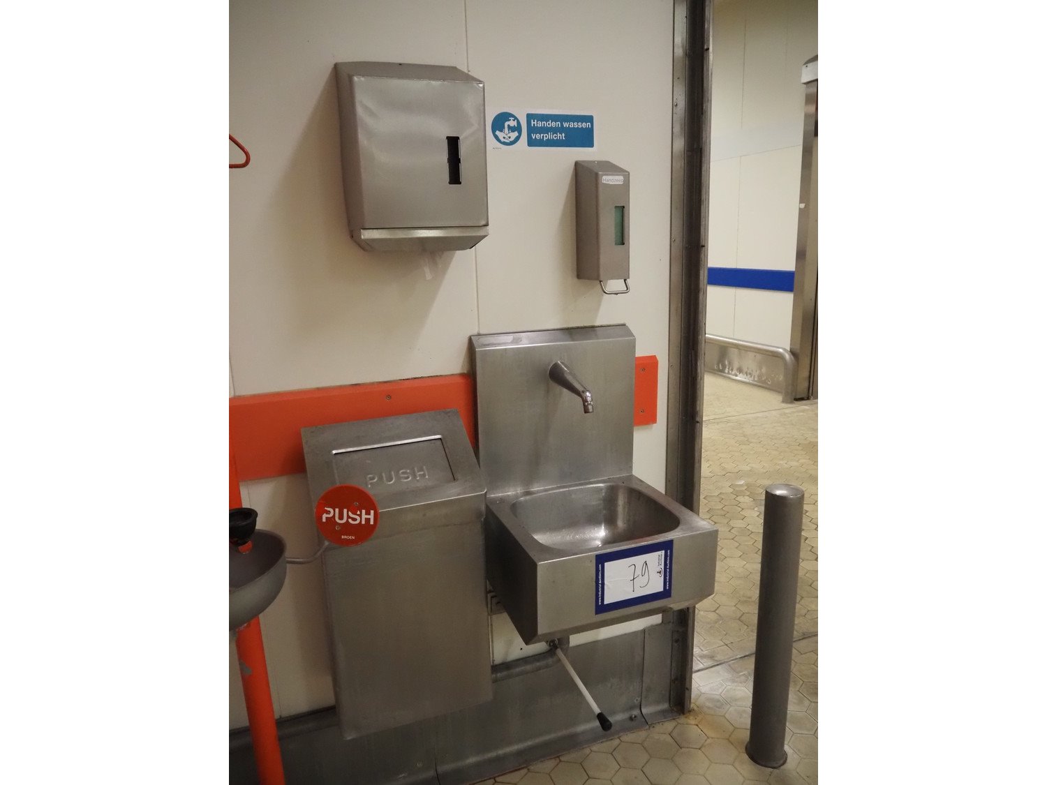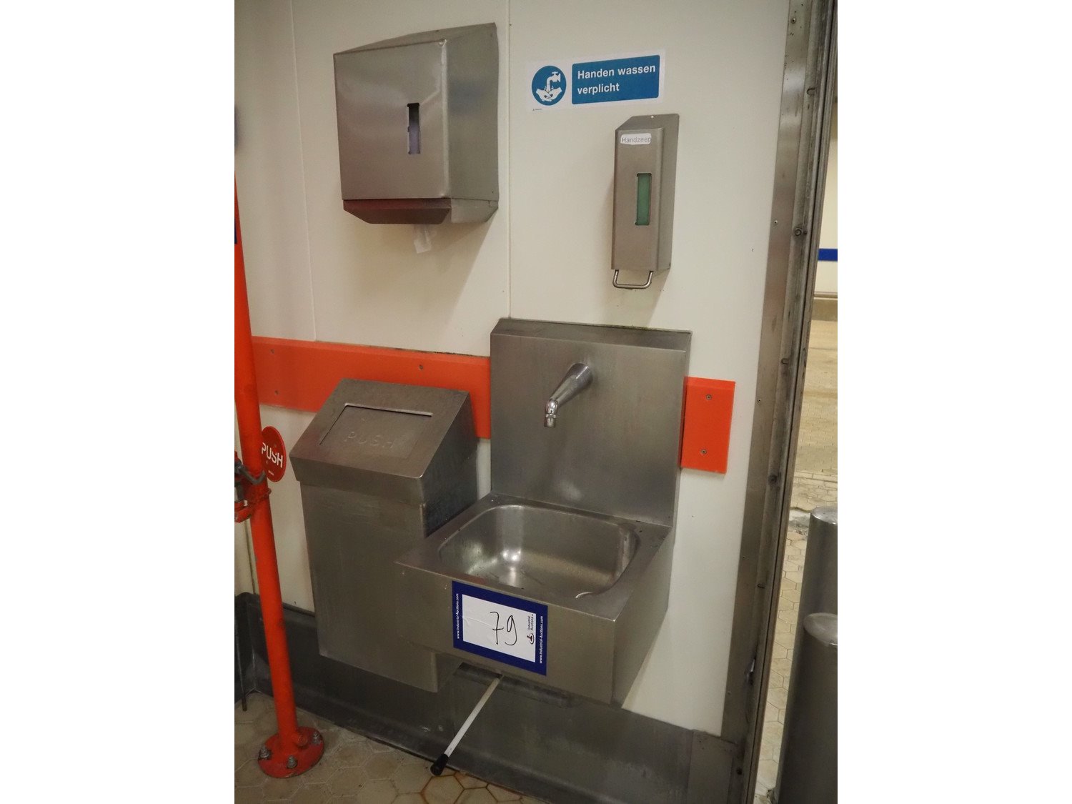 Nieros s/s sink, knee control, dimensions: 450 mm x 450 mm x 670 mm. Including s/s soap dispenser, s/s waste bag holder and s/s paper dispenser.
