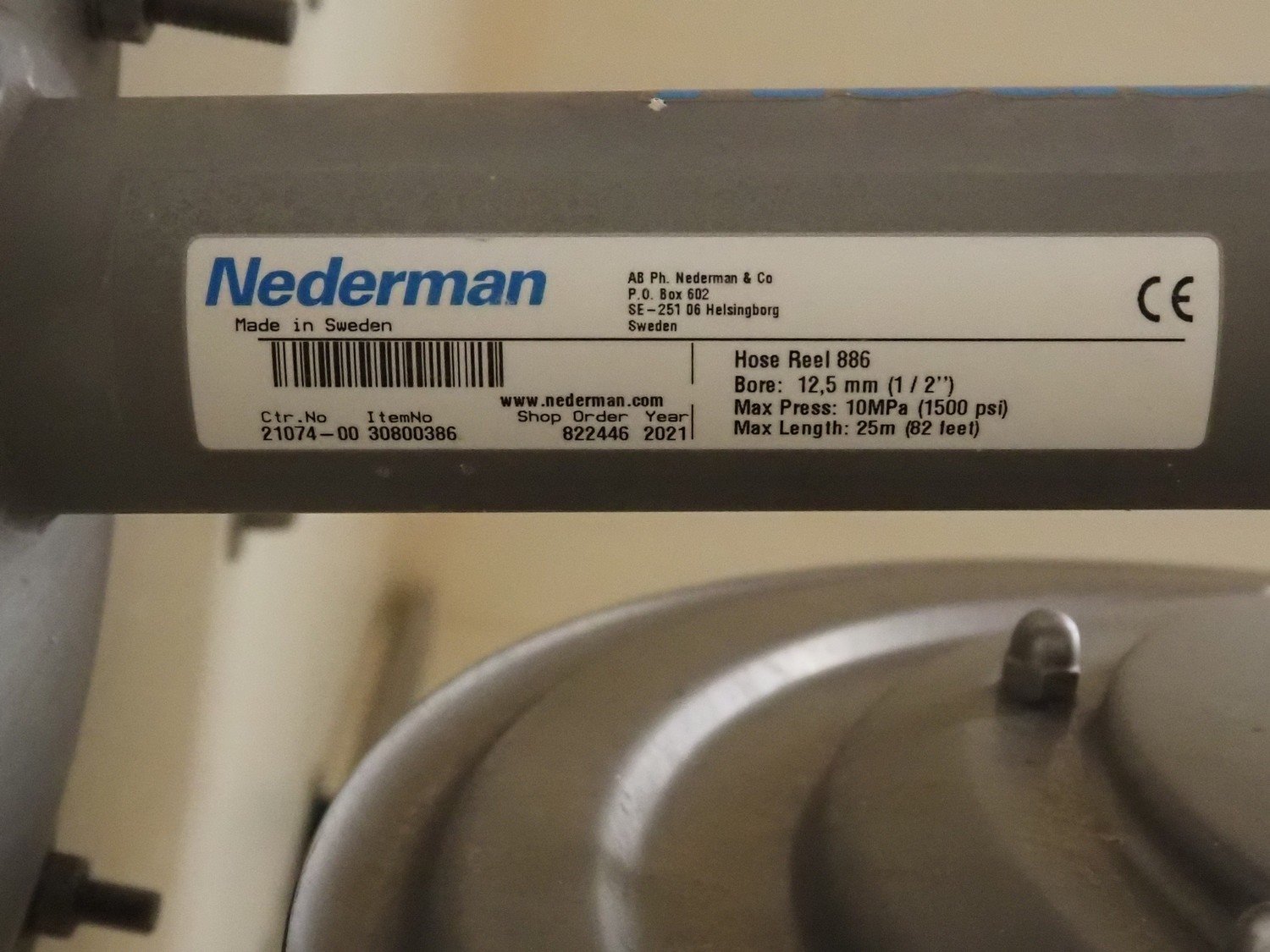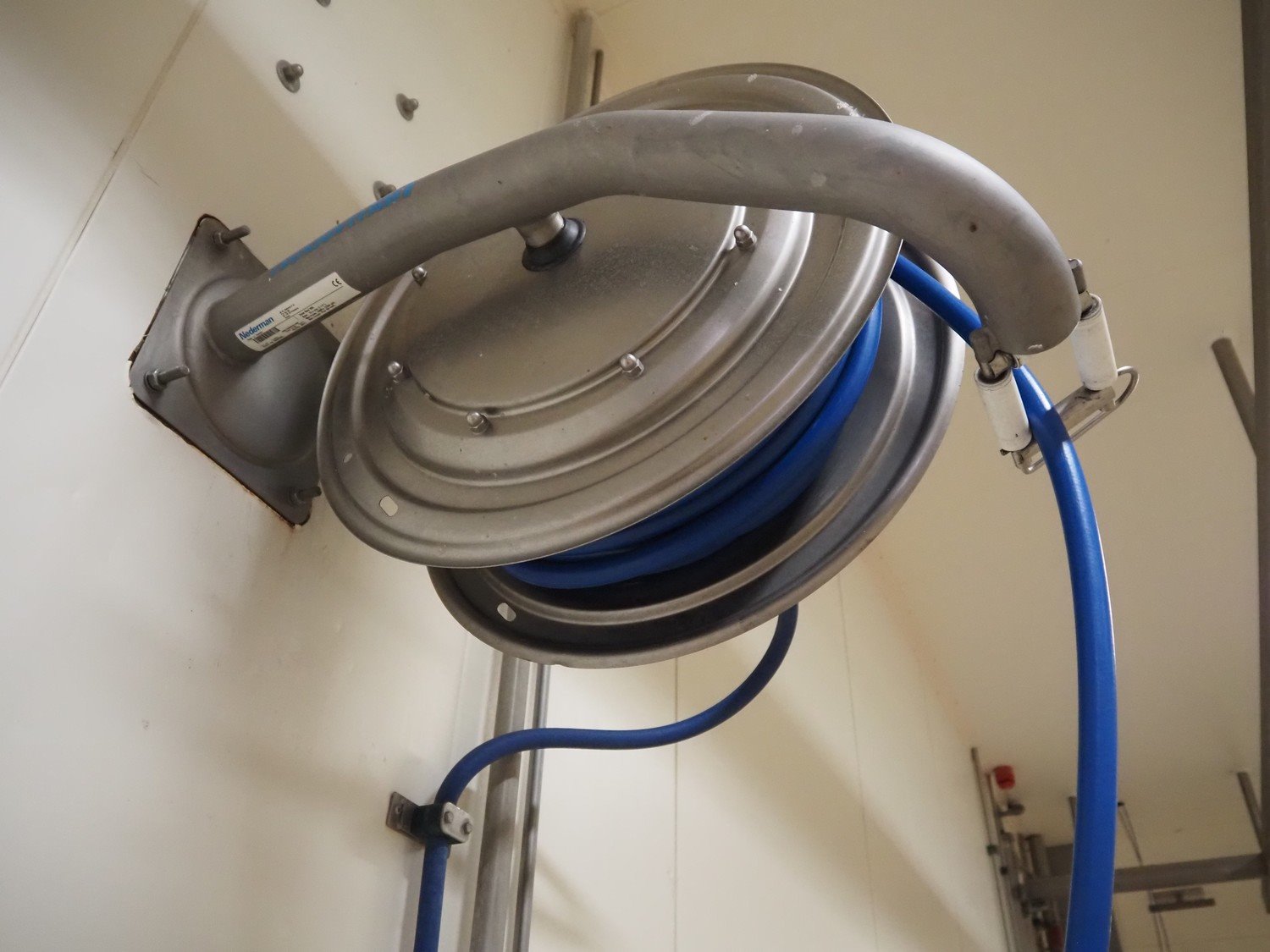 Nederman s/s hose reel, year of construction: 2021, bore: Ø 12.5 mm (1/2"), maximum pressure: 10 Mpa, maximum length: 25 meter, dimensions hose reel: 700 mm x 350 mm x 700 mm.