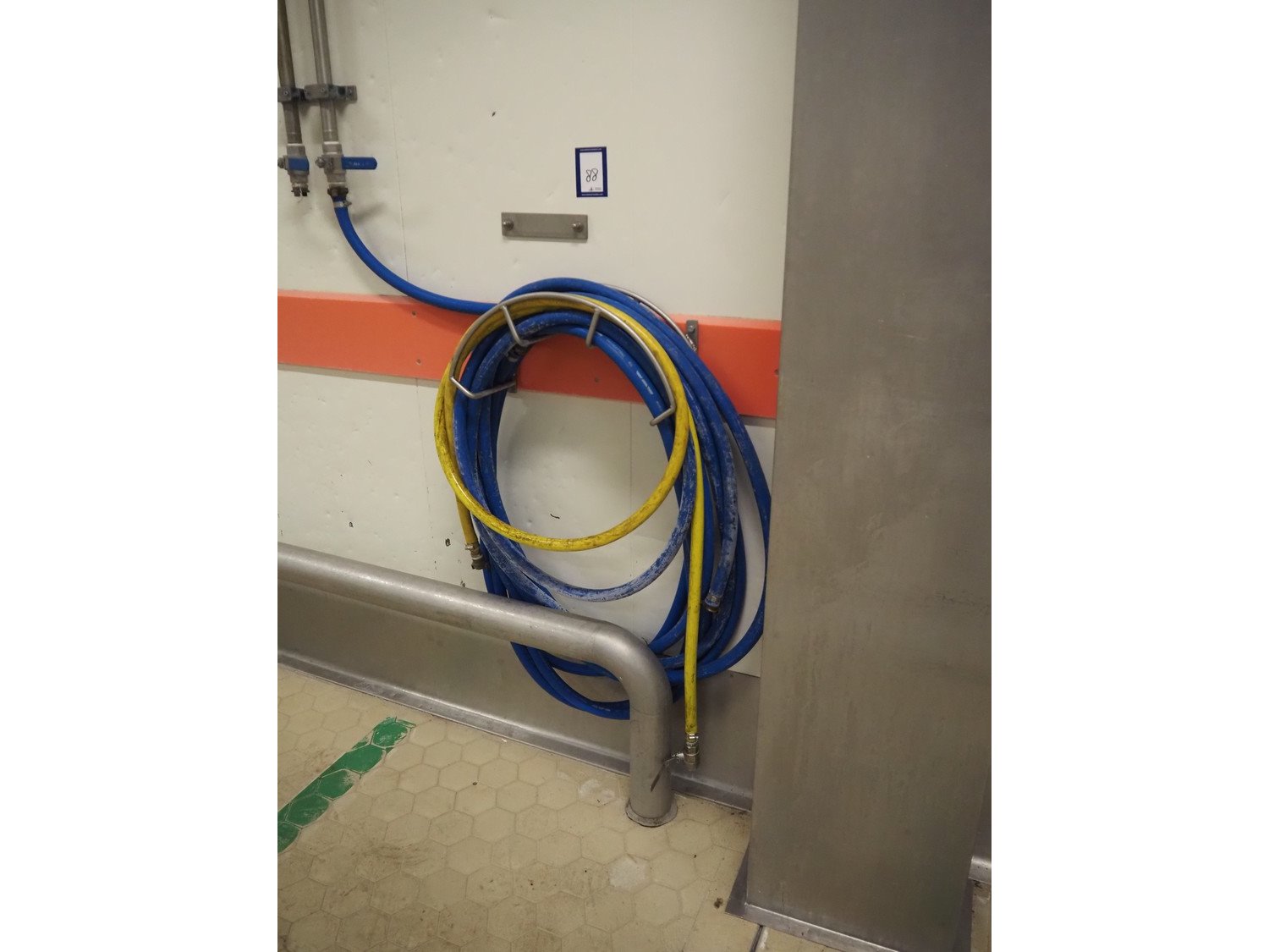 Steel hose reel with plastic hose, dimensions hose reel: 580 mm x 200 mm x 900 mm.
