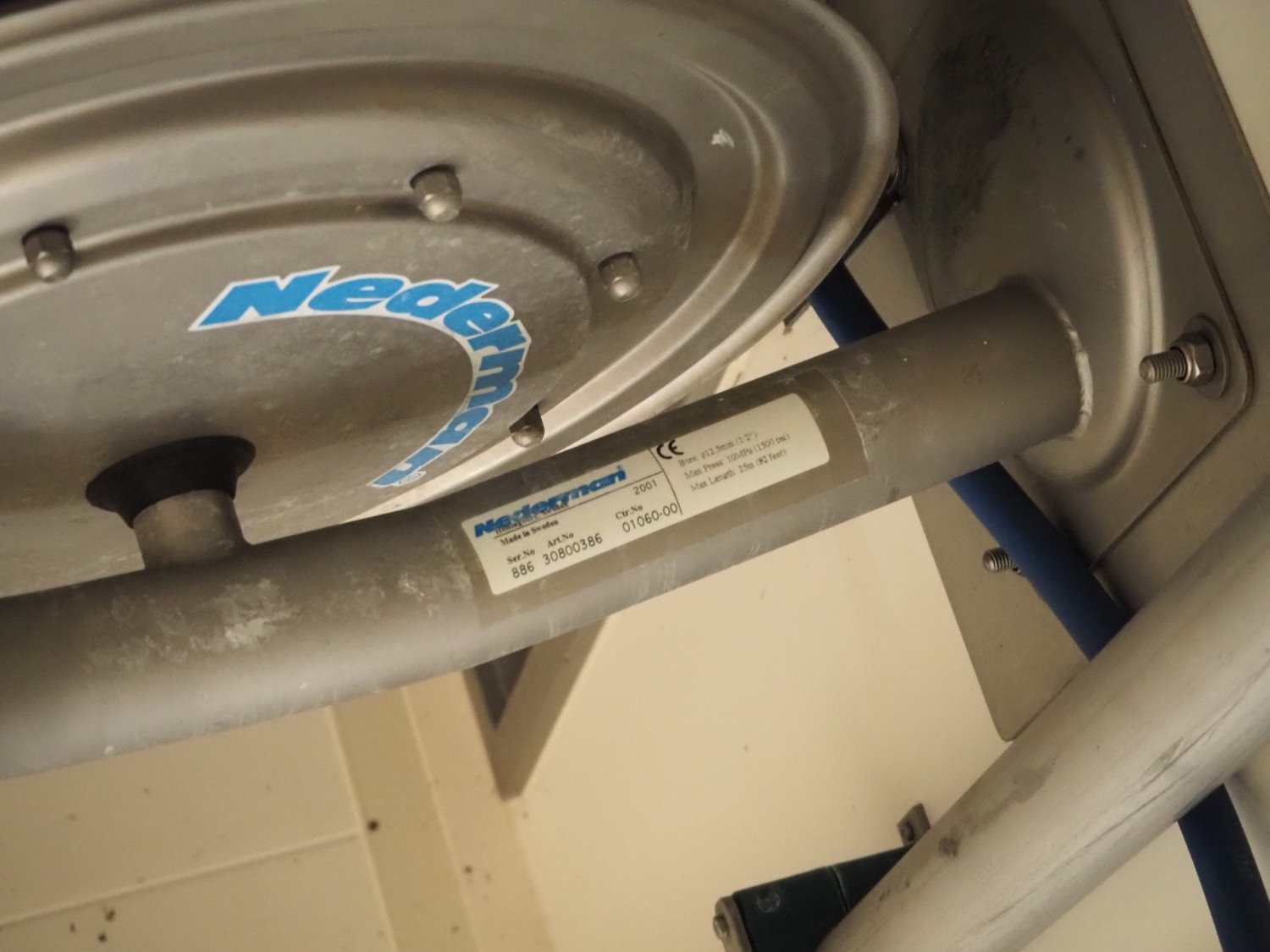 Nederman s/s hose reel, year of construction: 2001, bore: Ø 12.5 mm (1/2"), maximum pressure: 10 Mpa, maximum length: 25 meter, dimensions hose reel: 700 mm x 350 mm x 700 mm.