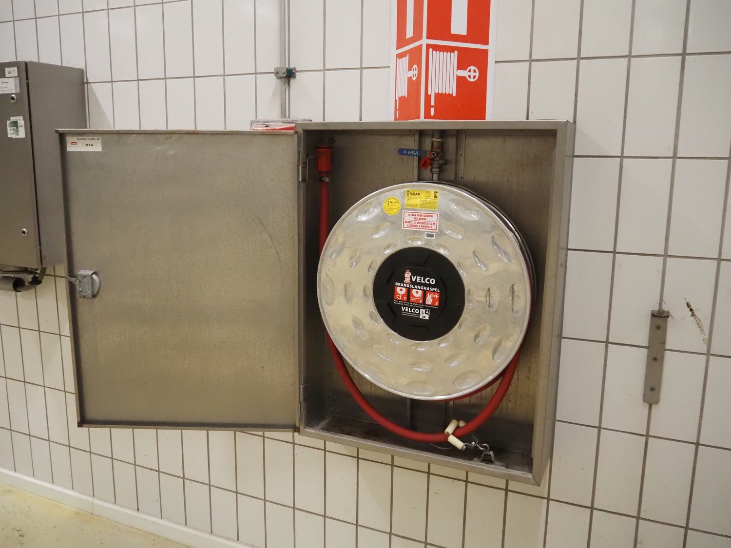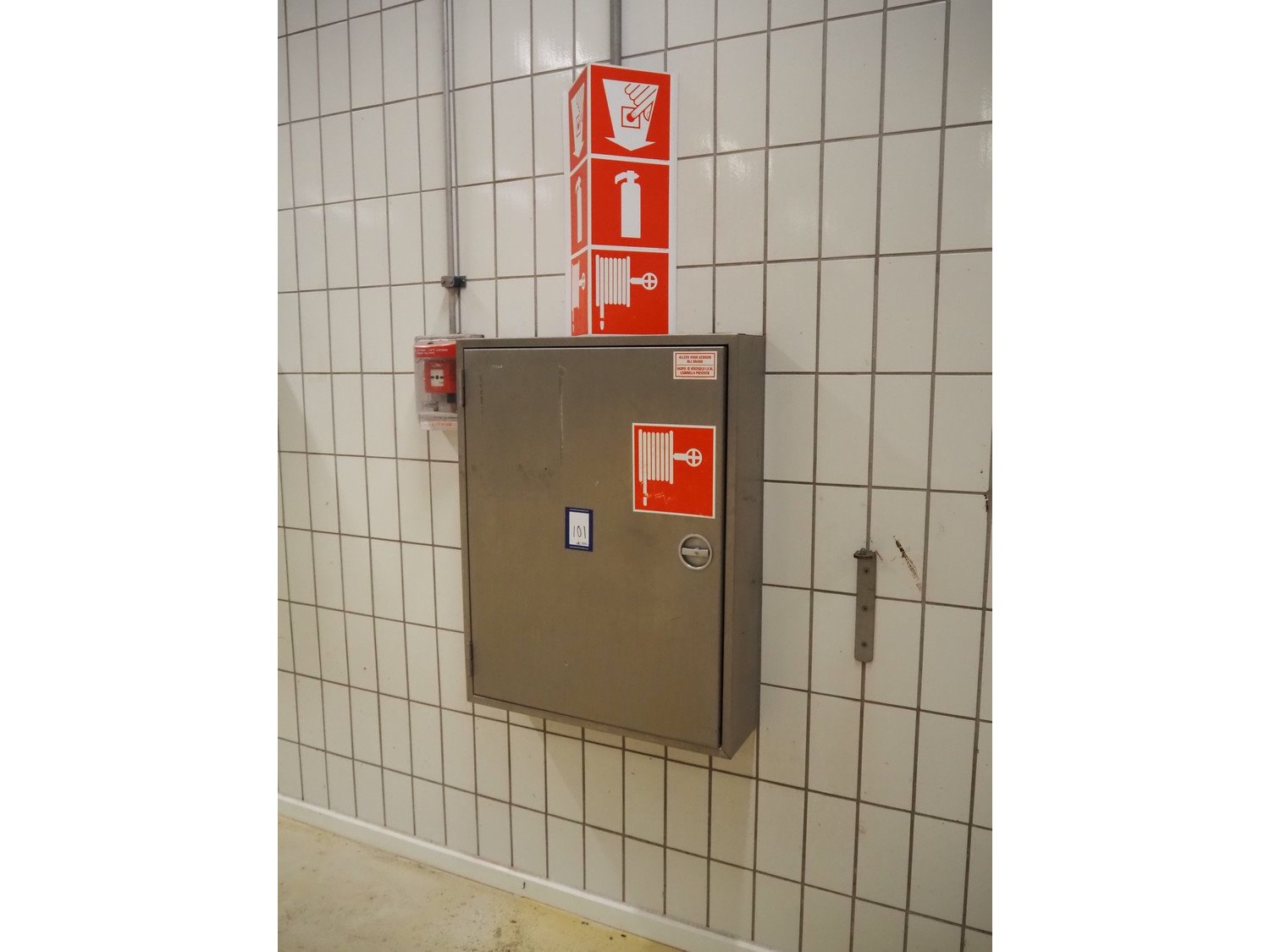S/s cabinet with Velco fire hose reel, dimensions: 730 mm x 180 mm x 940 mm.