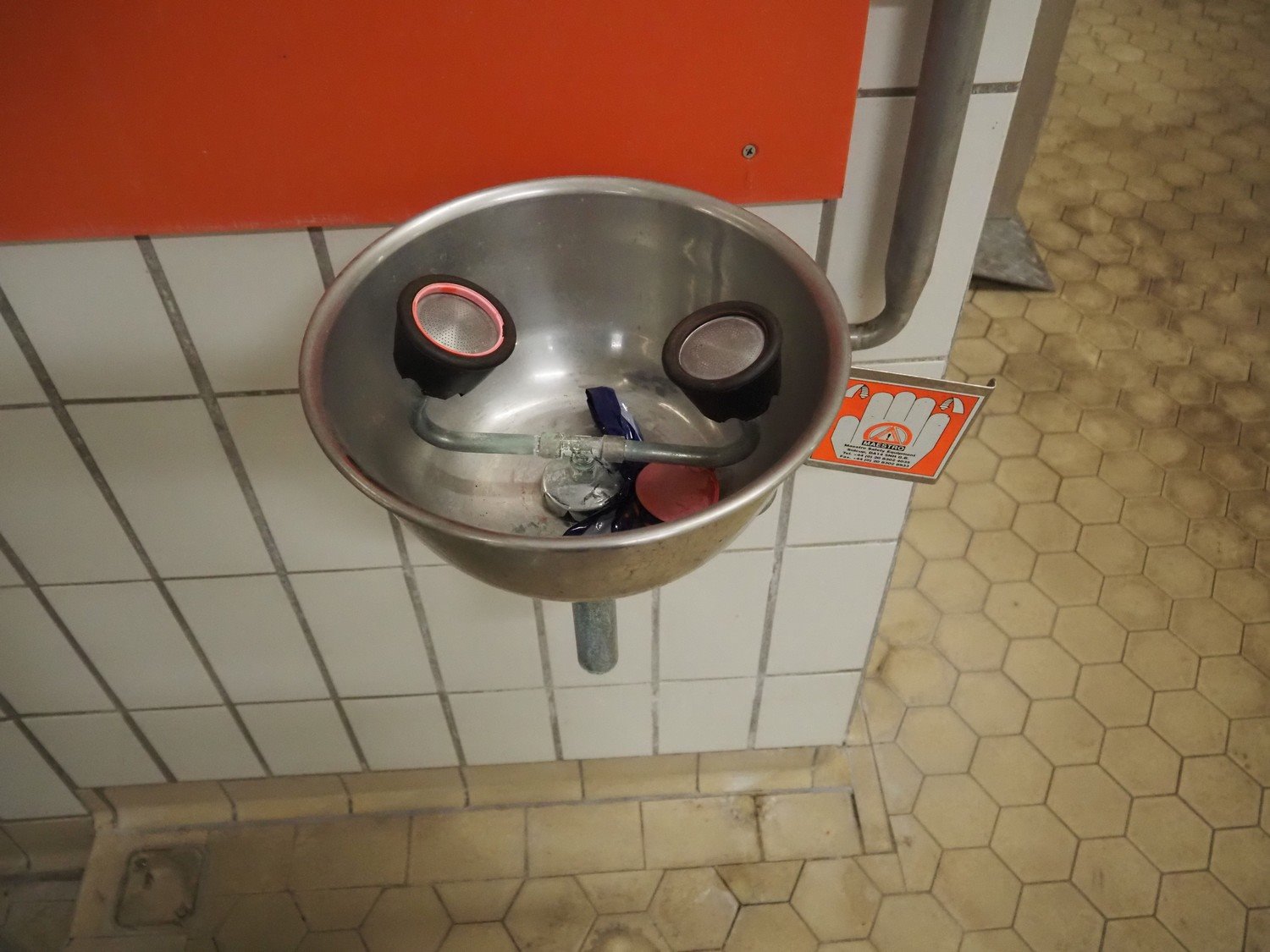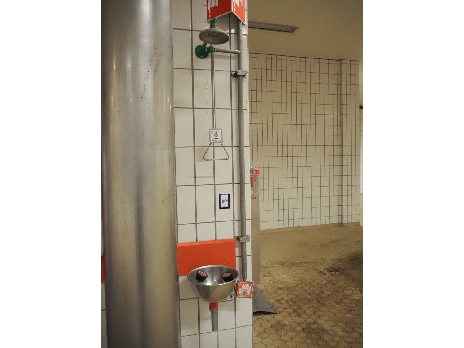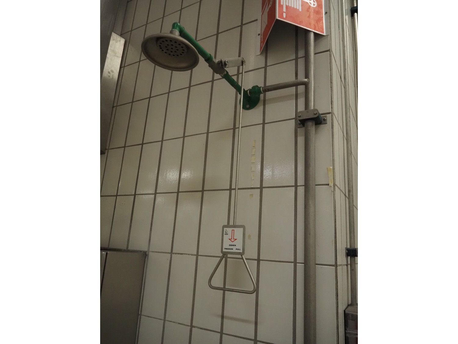 Safety shower, dimensions: 430 mm x 500 mm x 2350 mm.