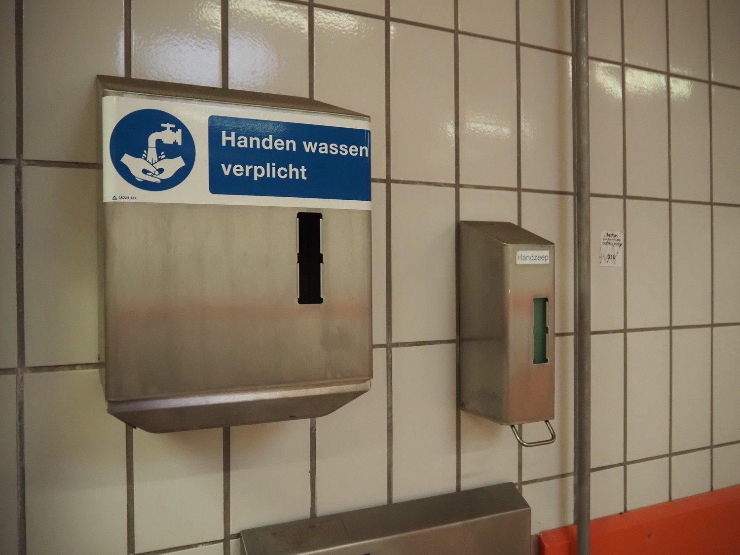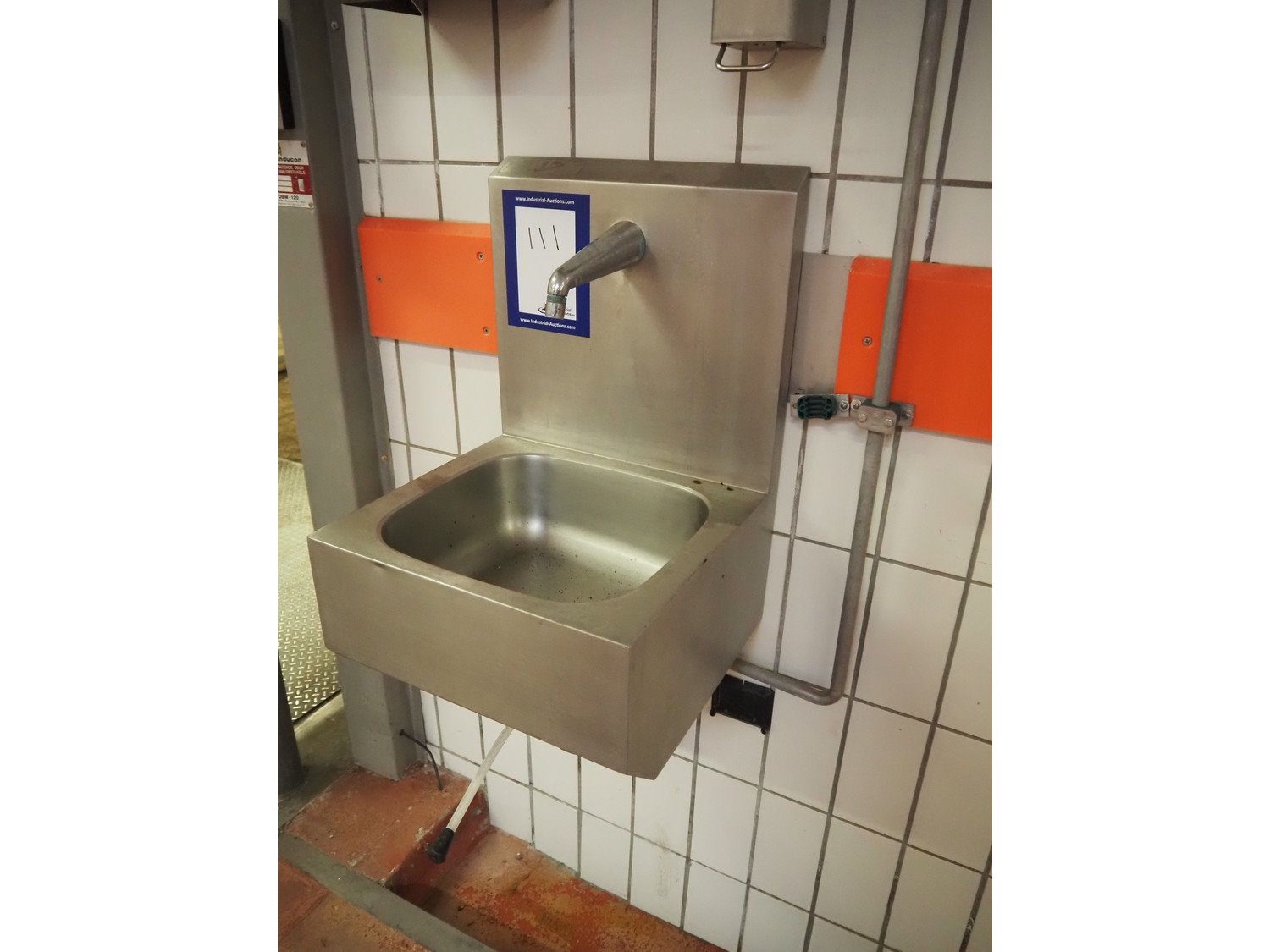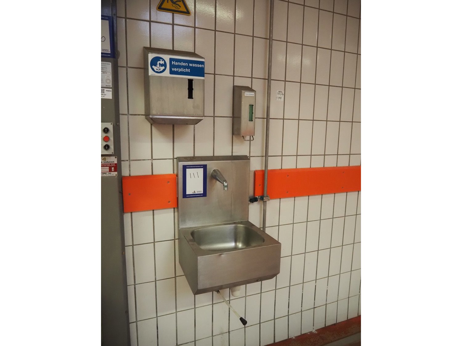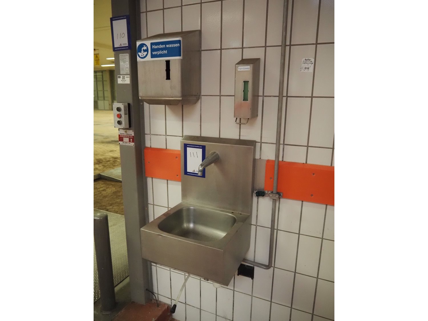 Nieros s/s sink, knee control, dimensions: 450 mm x 450 mm x 670 mm. Including s/s soap dispenser and s/s paper dispenser.