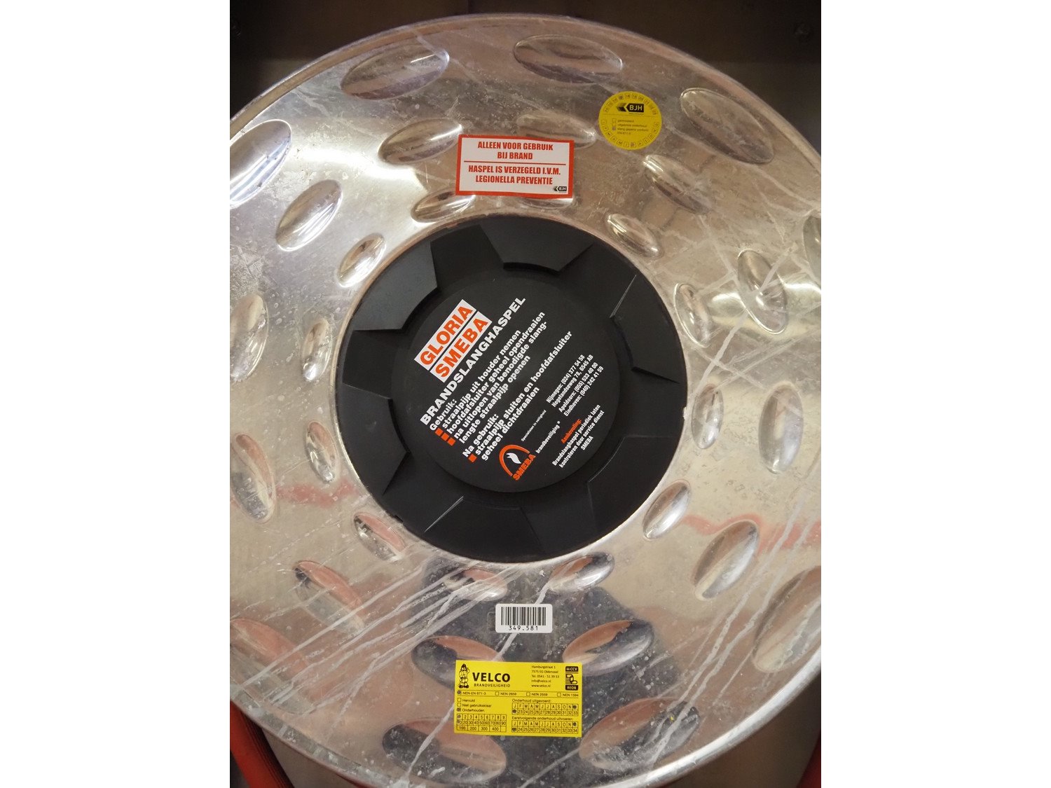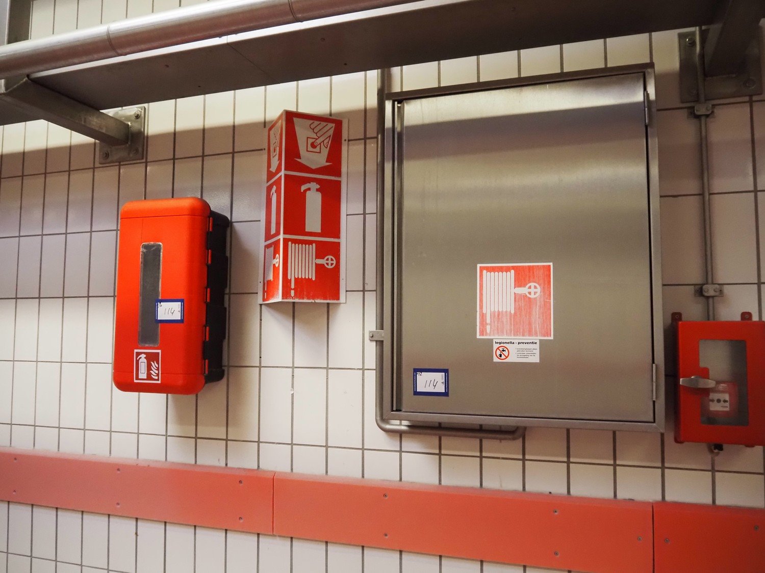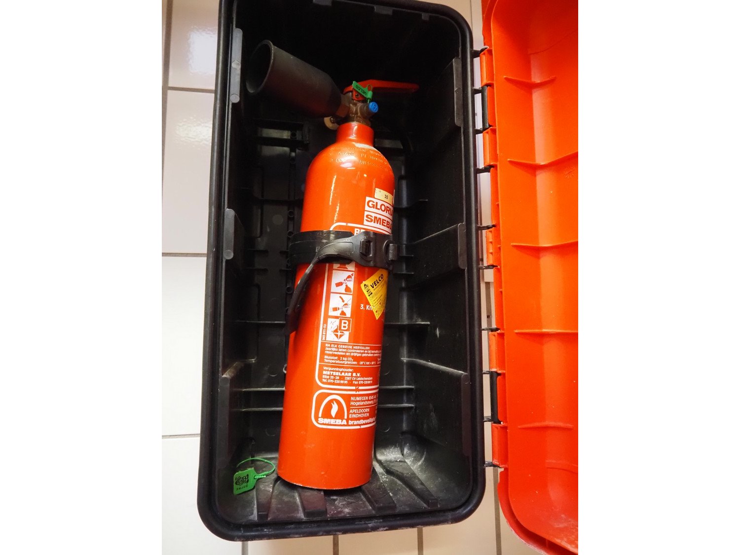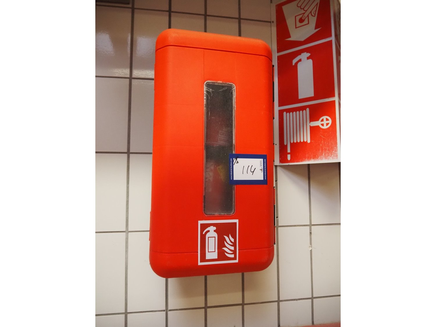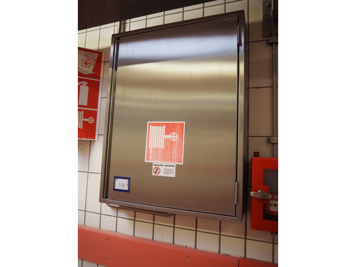 S/s cabinet with Gloria Smeba fire hose reel and plastic cabinet with Gloria Smeba fire extinguisher, dimensions fire hose reel: 730 mm x 180 mm x 940 mm, dimensions fire extinguisher cabinet: 320 mm x 270 mm x 830 mm.