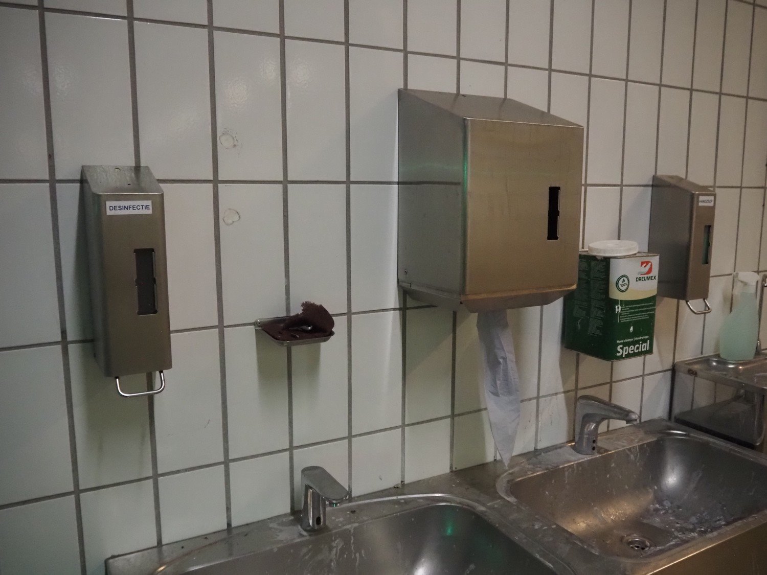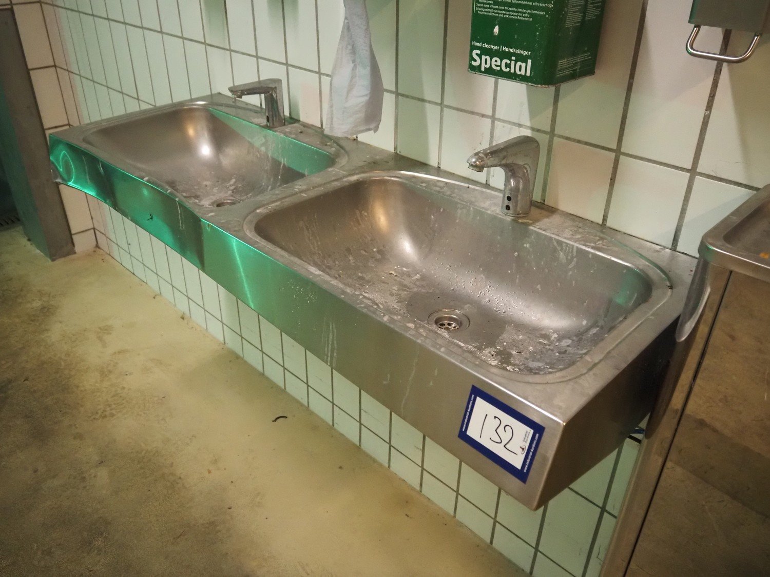 Franke s/s sink with 2 faucets, sensor control, dimensions: 1400 mm x 500 mm x 300 mm and water fountain, dimensions water fountain: 350 mm x 250 mm x 1200 mm. Including 2 s/s soap dispensers and s/s paper dispensers.
