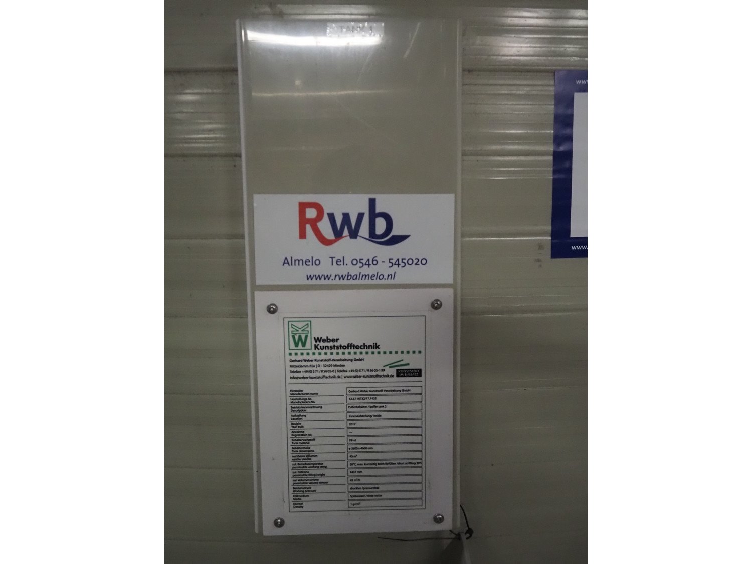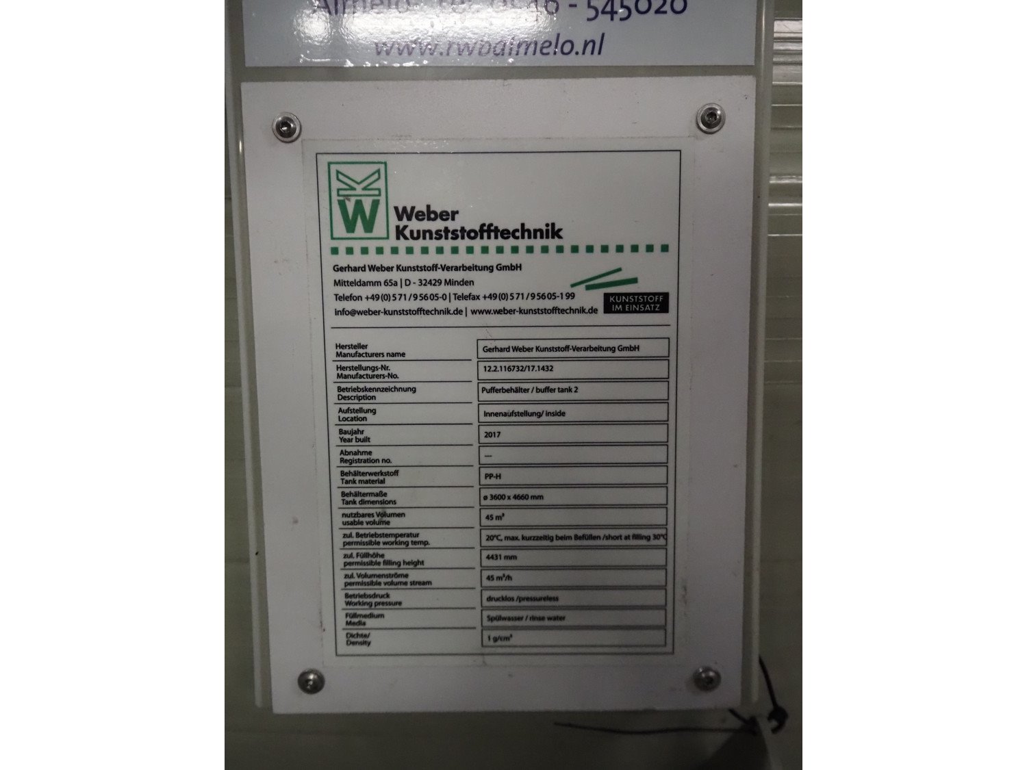 Gerhard Weber Kunststoff-Verarbeitung GmbH plastic buffer tank, serial number: 12.2.116732/17.1432, year of construction: 2017, volume: 45 m³, dimensions: ø 3600 mm x 4660 mm. Can be picked-up at a later date as soon as the building will be demolished next year, a date for this is yet unknown.