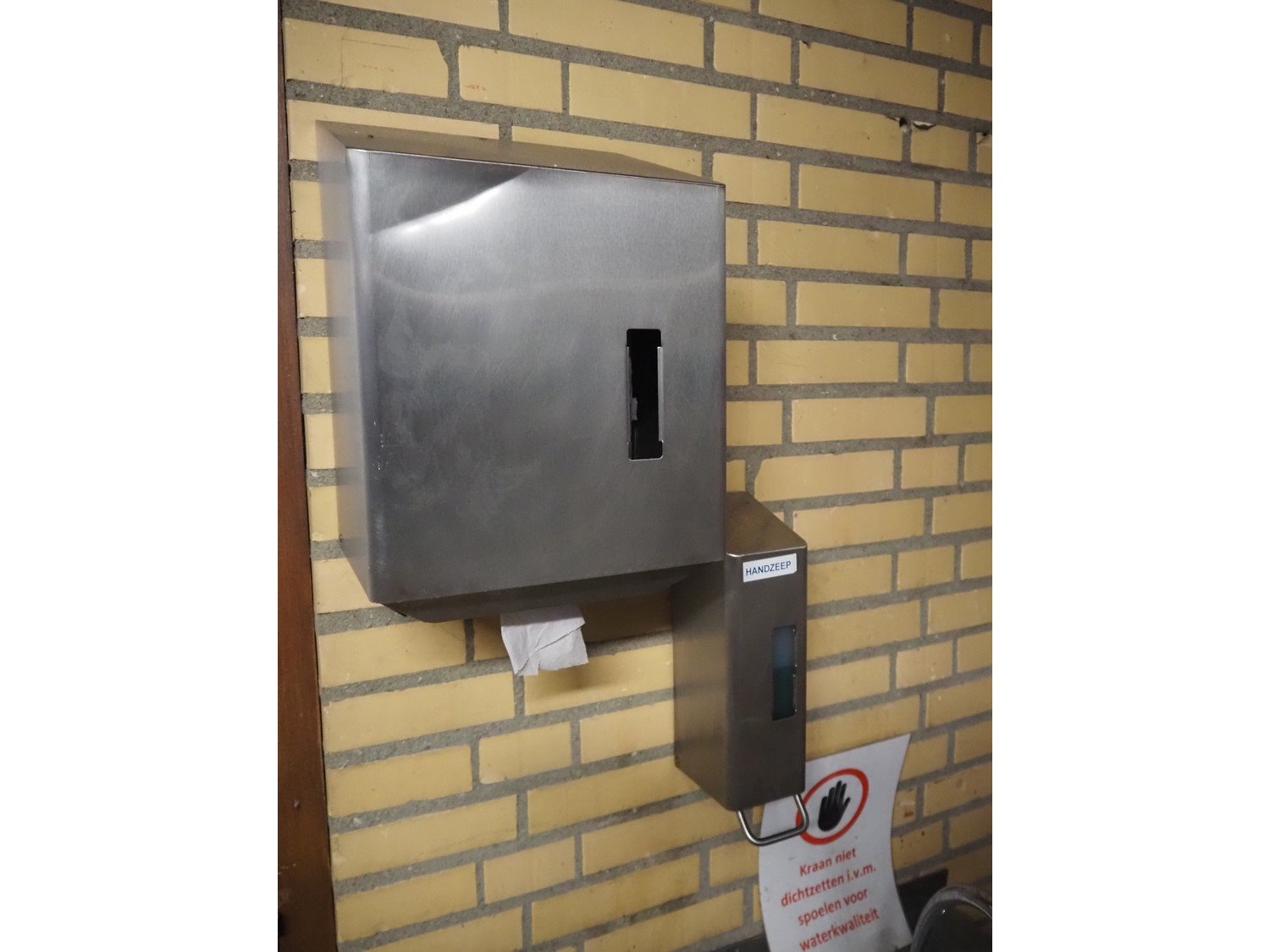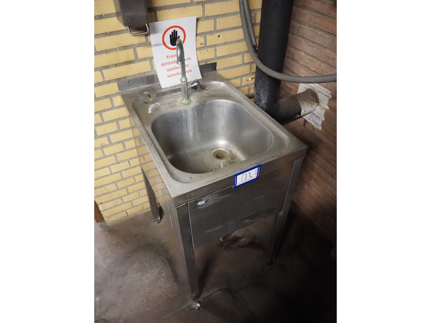 S/s sink, dimensions: 700 mm x 500 mm x 1200 mm. Including s/s soap dispenser and s/s paper dispenser.