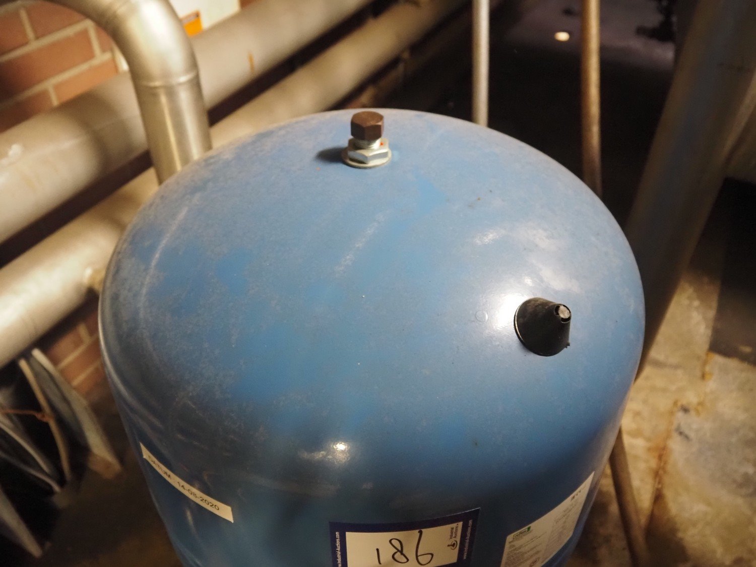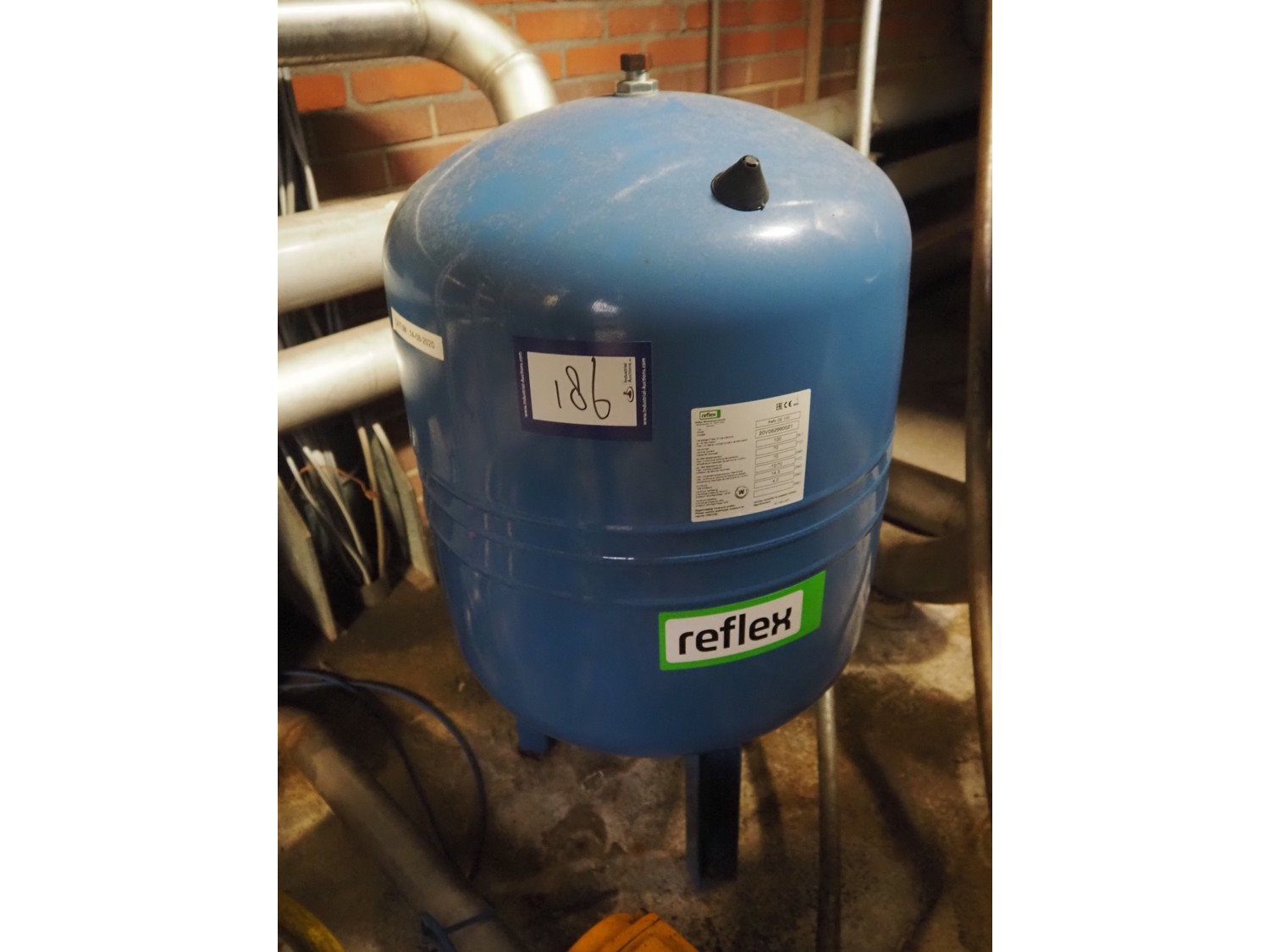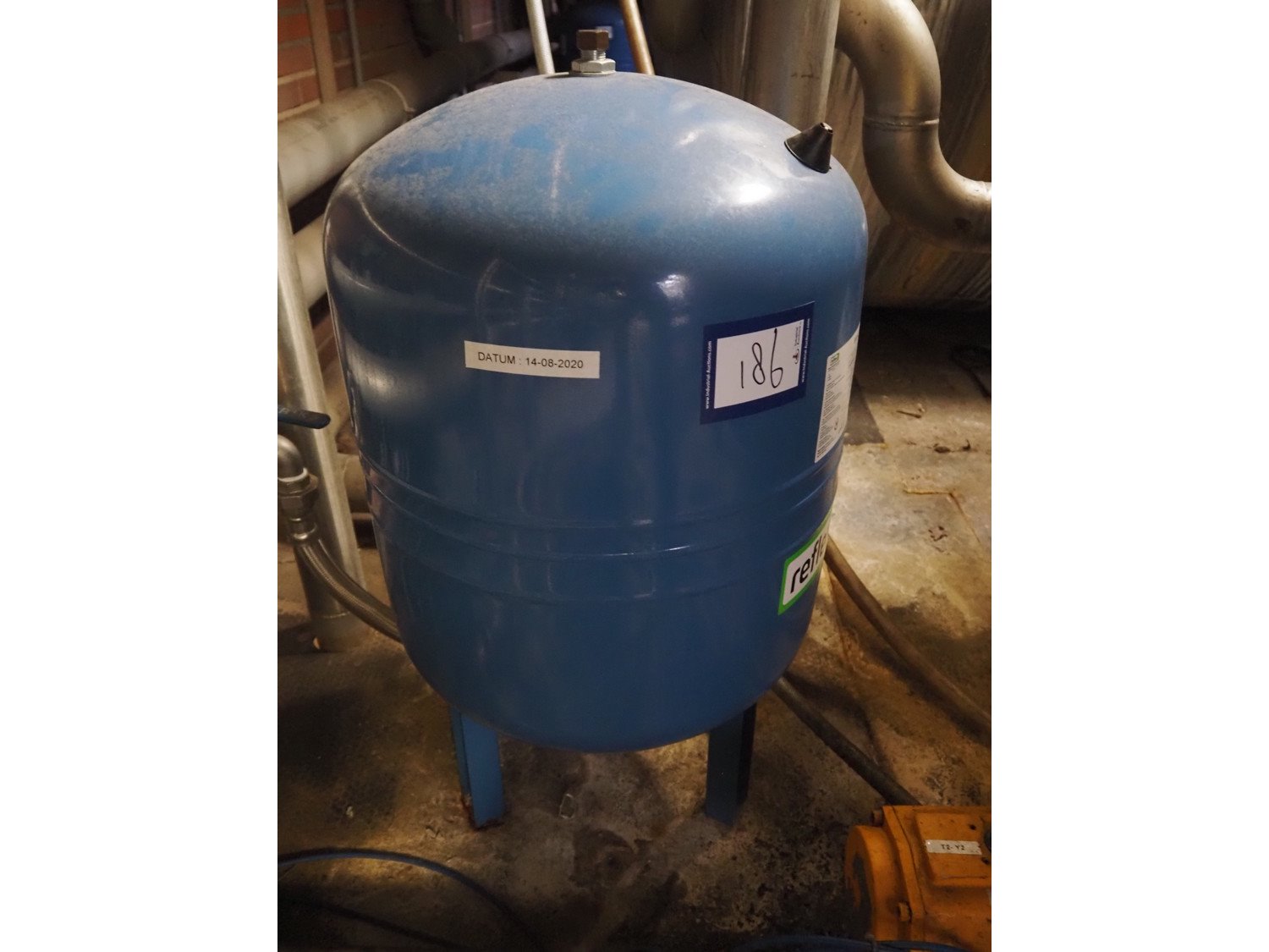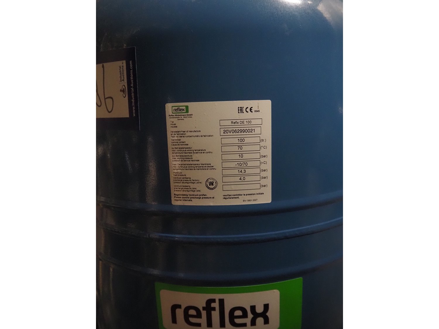Reflex steel pressure vessel, model: Refix DE 100, serial number: 20V062990021, volume: 100 litres, dimensions: Ø 480 mm x 850 mm.