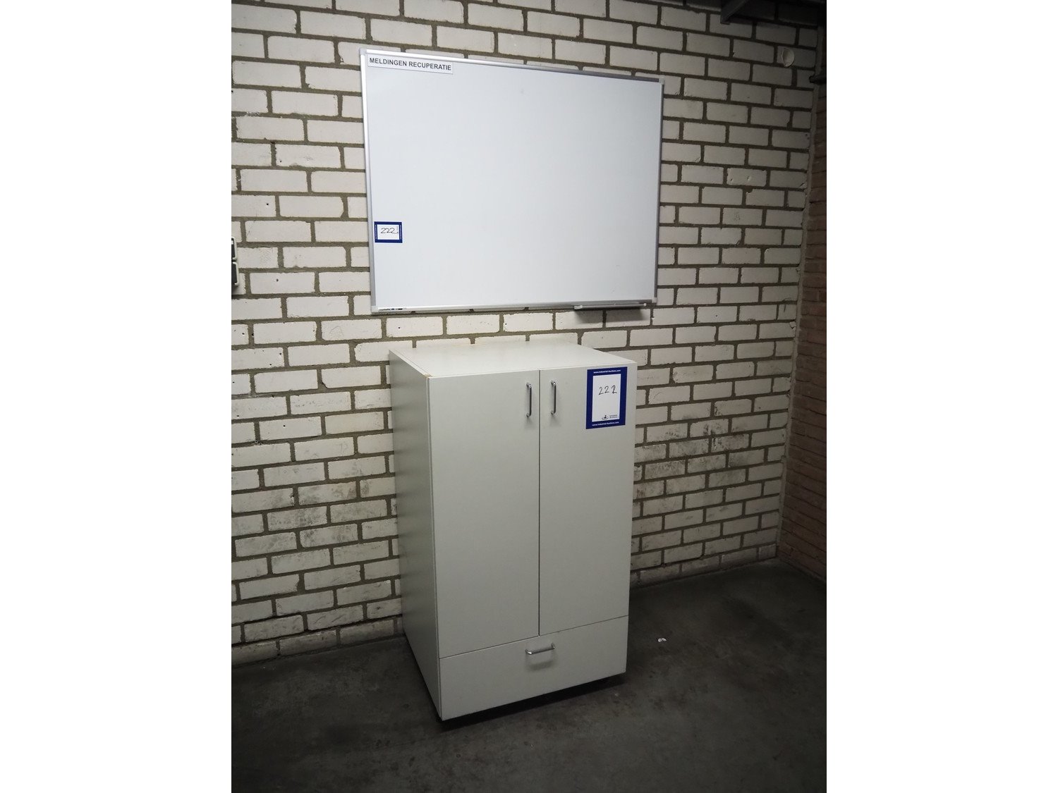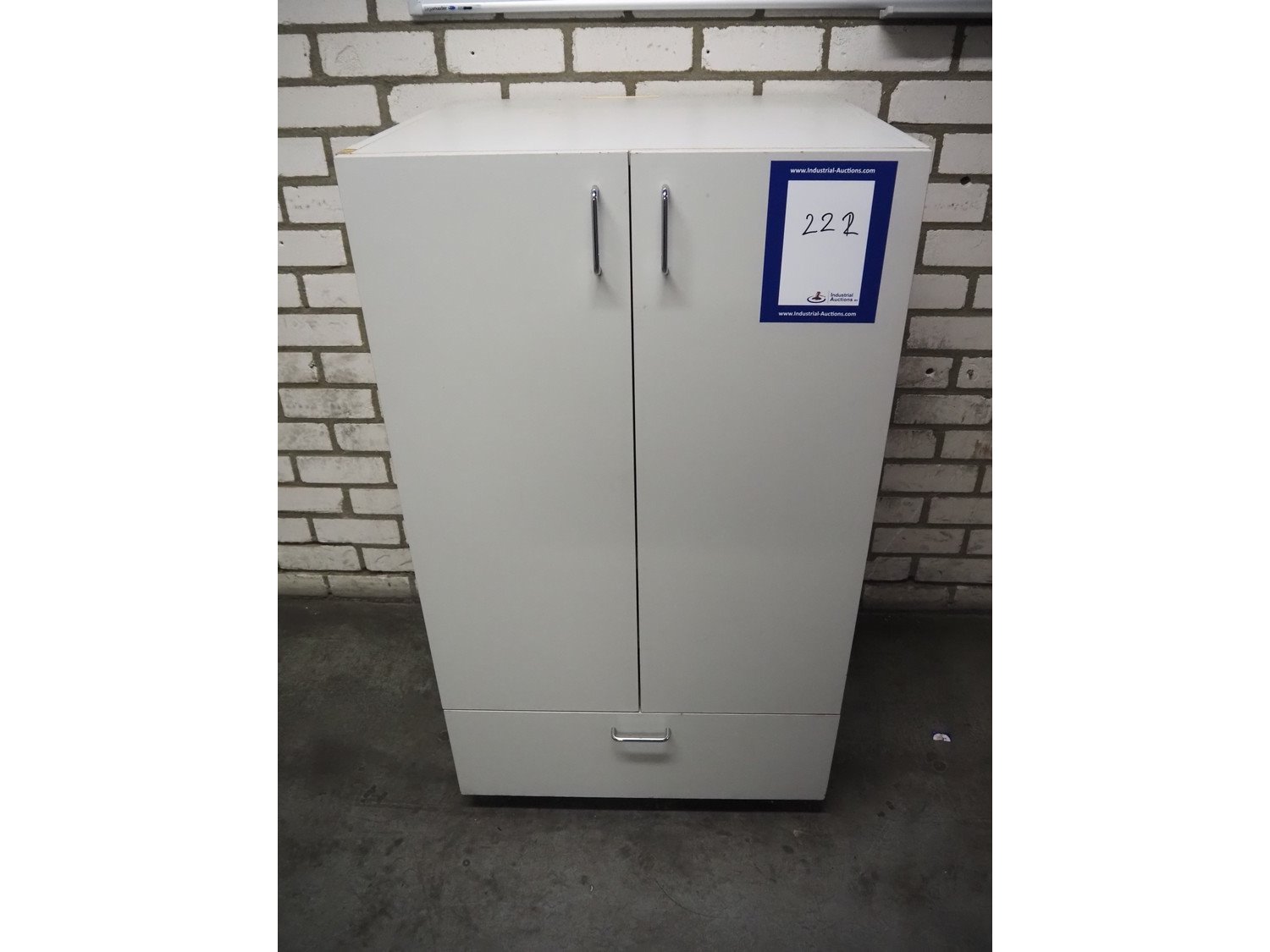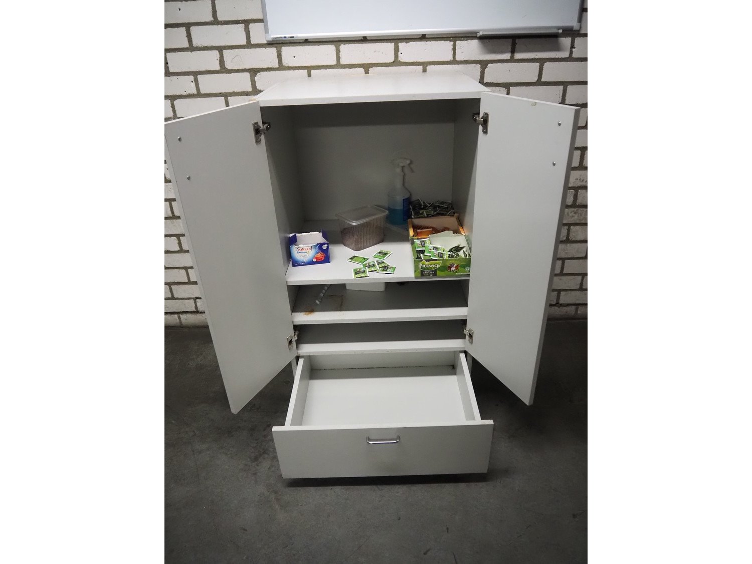 Legamaster whiteboard, dimensions: 1200 mm x 900 mm x 10 mm and wooden cabinet, dimensions: 700 mm x 600 mm x 1200 mm.