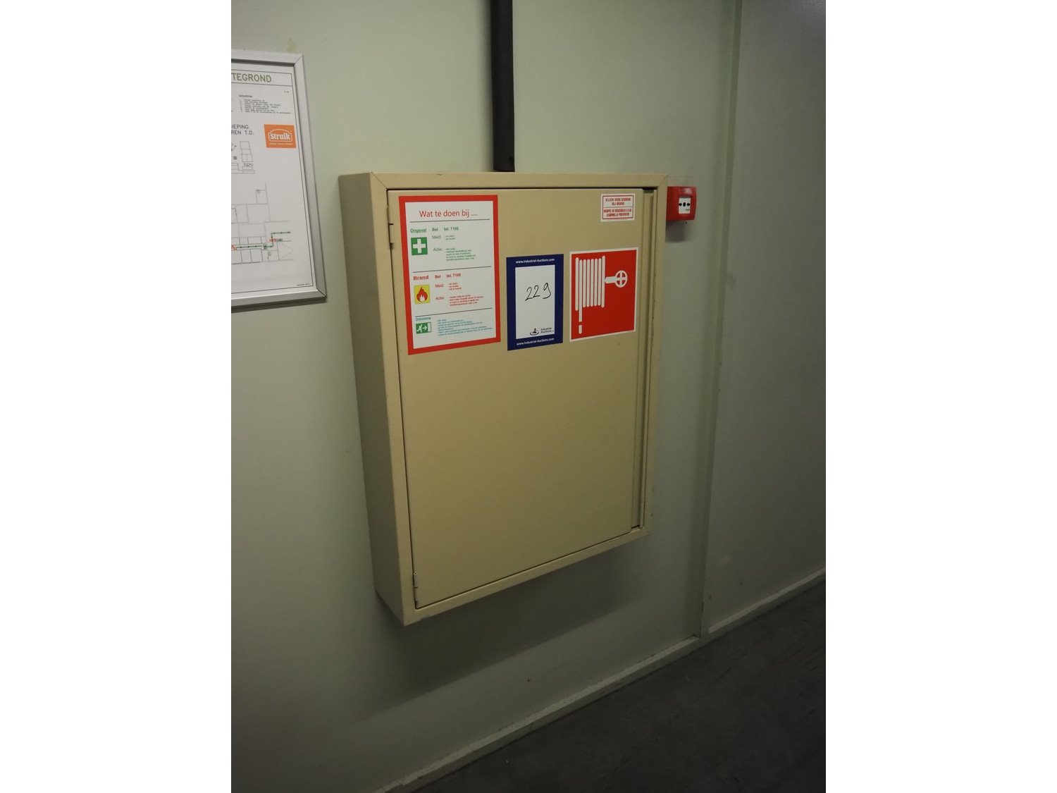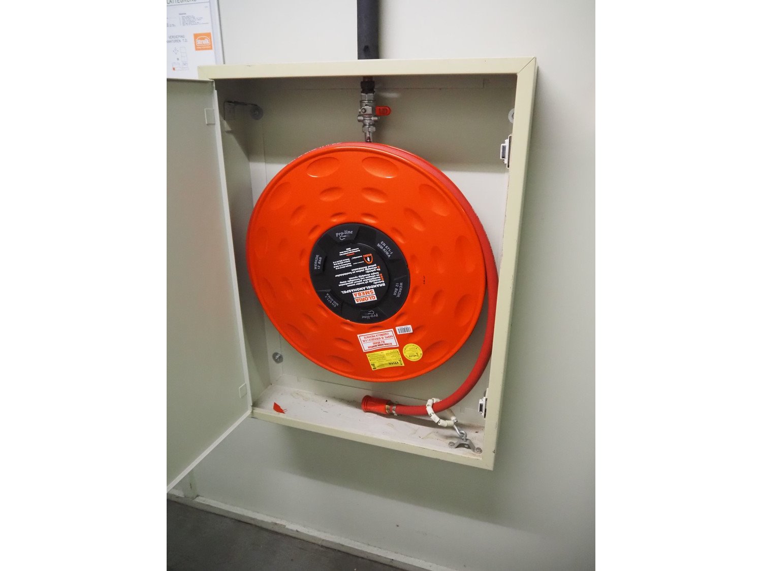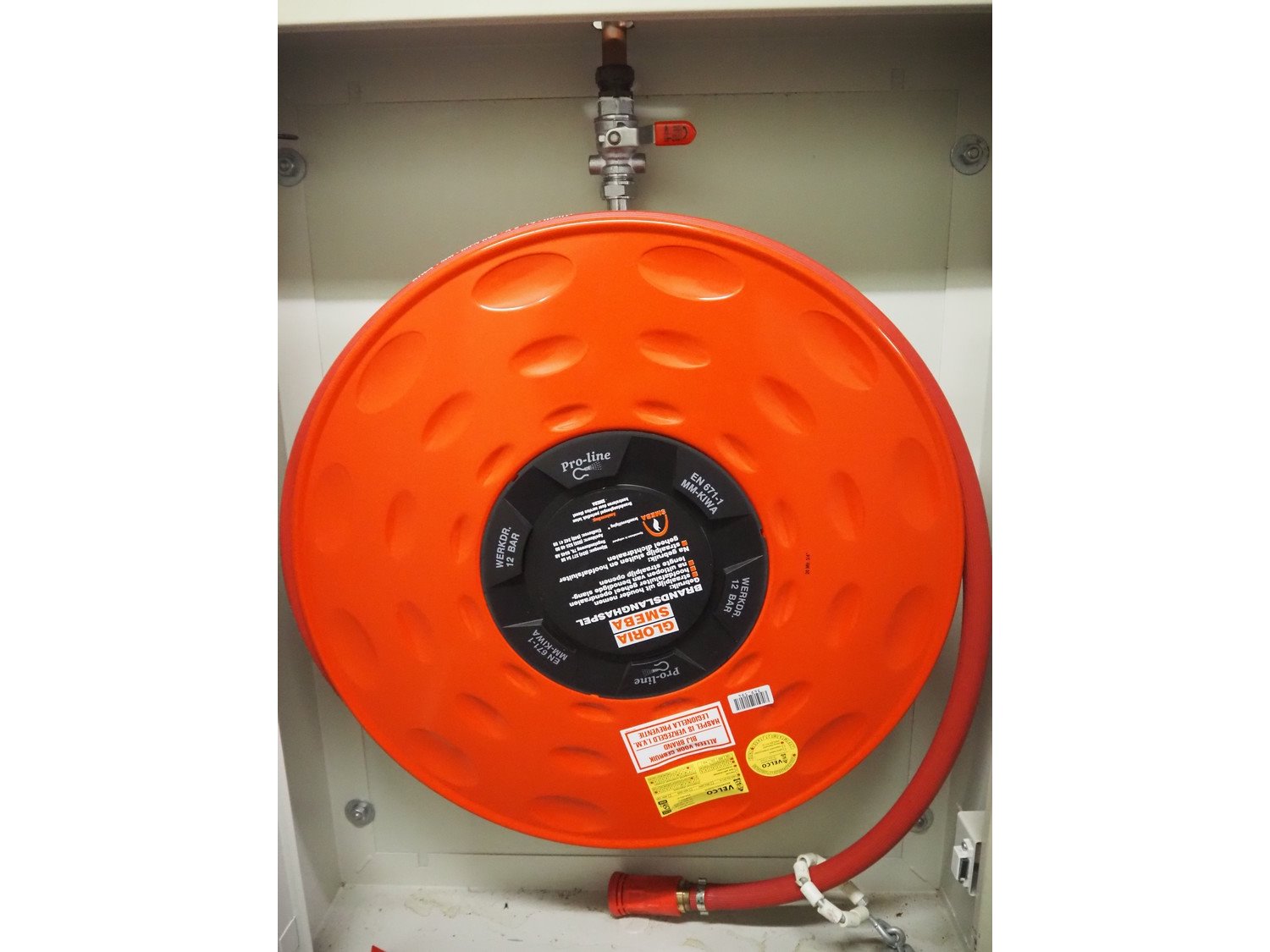 Steel cabinet with Gloria Smeba fire hose reel, dimensions: 730 mm x 180 mm x 940 mm.