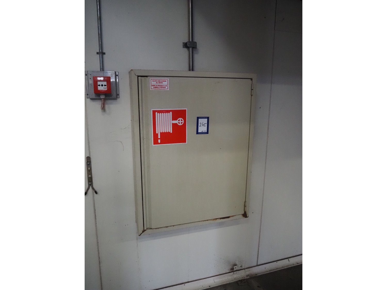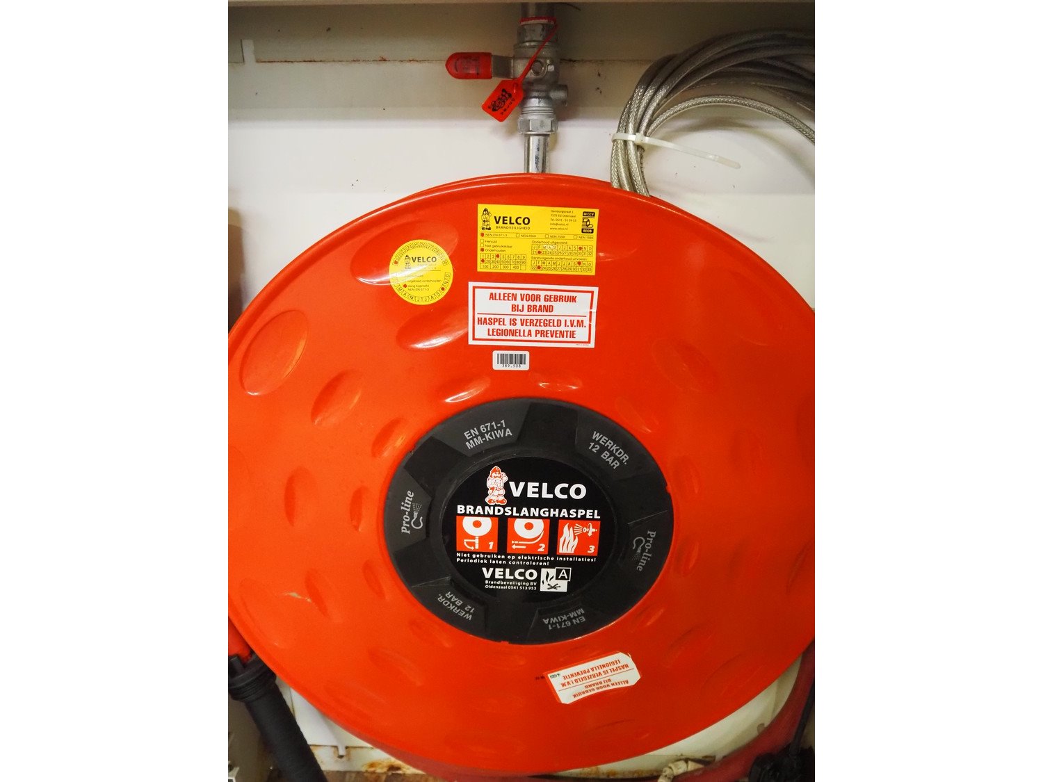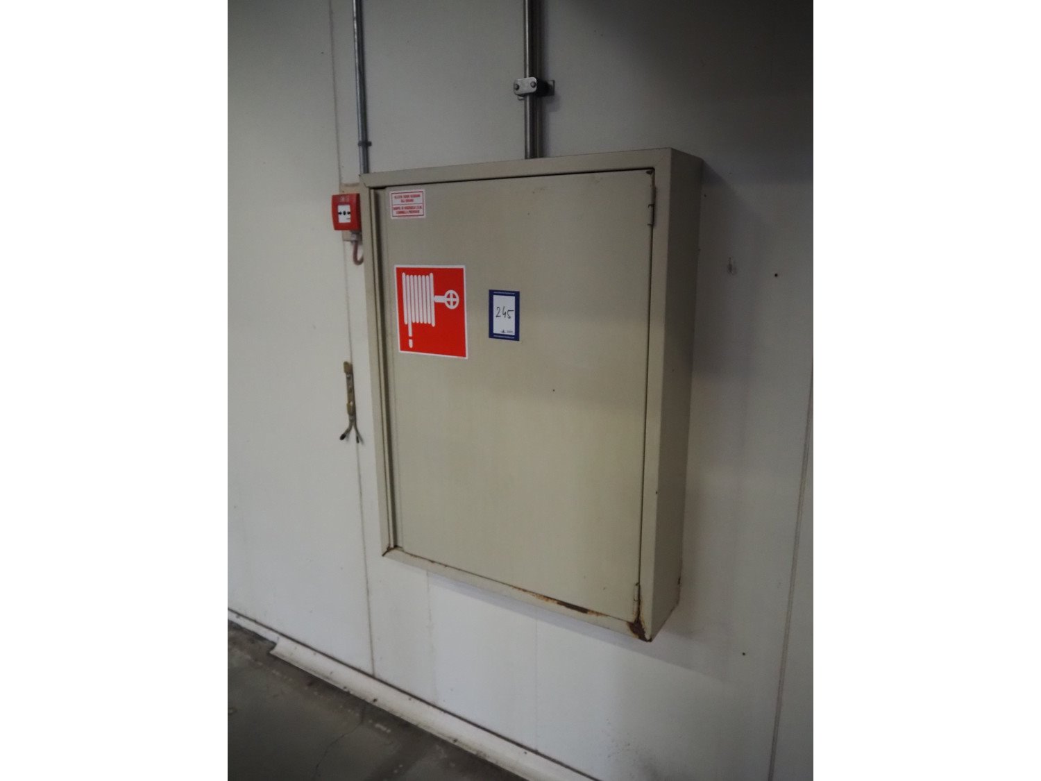 Steel cabinet with Velco fire hose reel, dimensions: 730 mm x 180 mm x 940 mm.