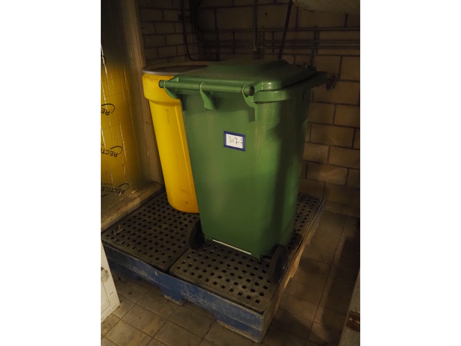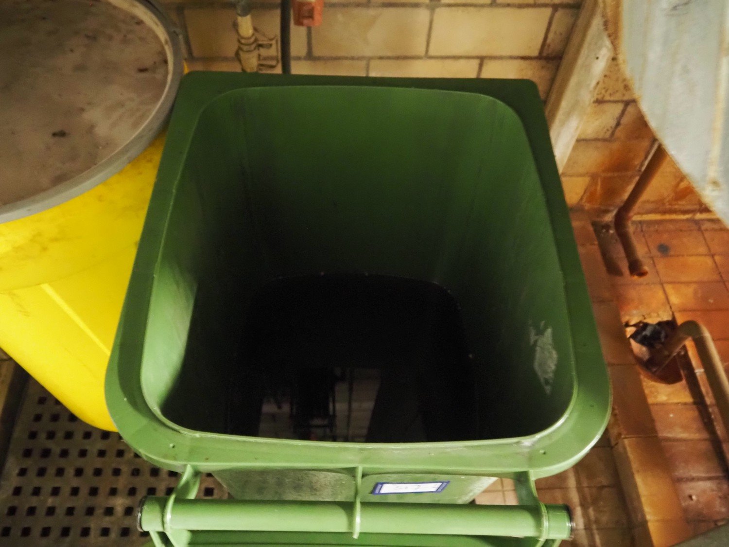Steel drip tray with plastic waste container, dimensions drip tray: 1200 mm x 1200 mm x 270- mm, dimensions waste container: 600 mm x 700 mm x 1020 mm.