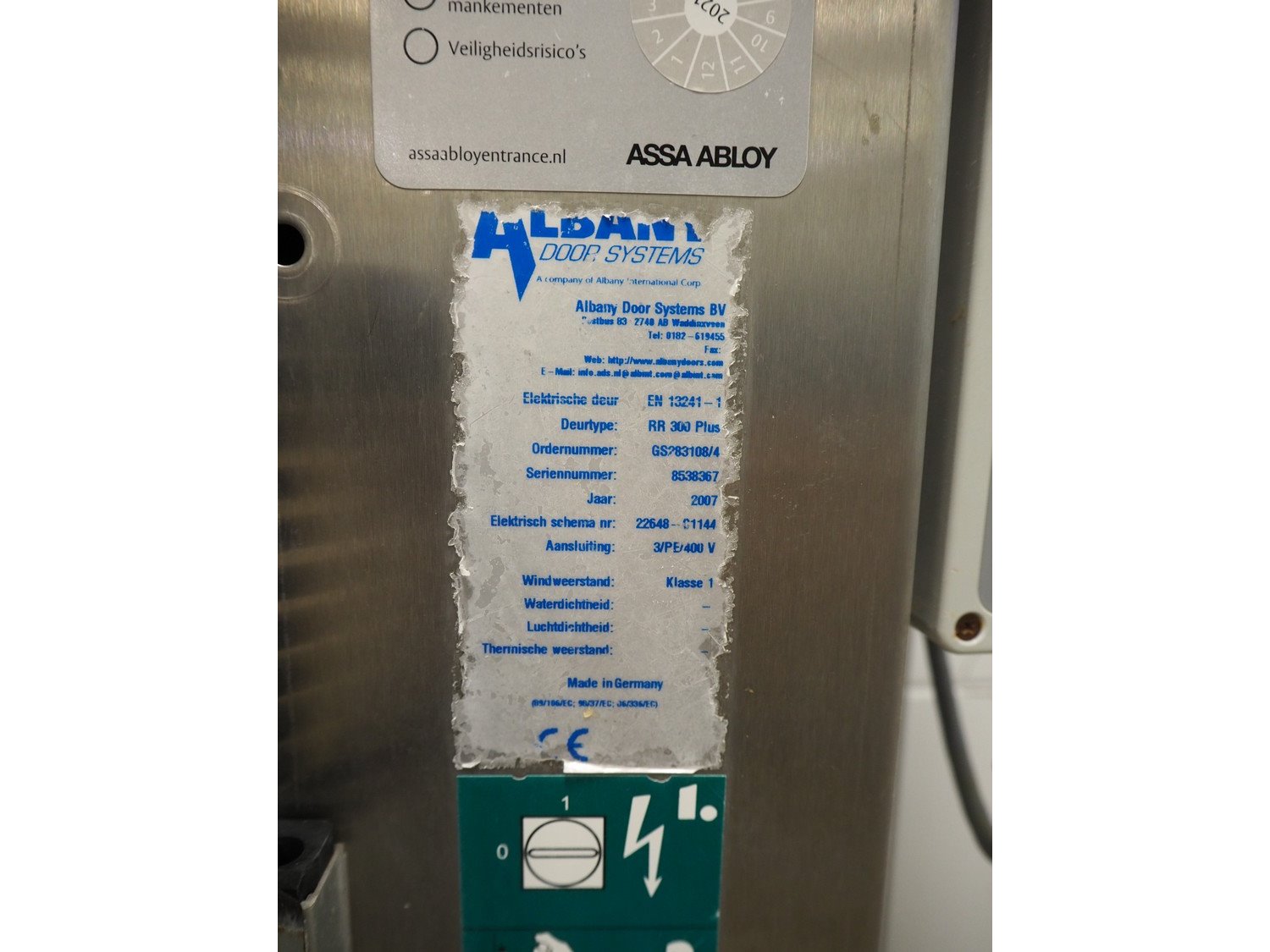 Albany Door Systems BV high speed shutter door, type: RR 300 Plus, serial number: 8538367, year of construction: 2007, 400 V, 3 Ph, door size: 2500 mm x 3700 mm.