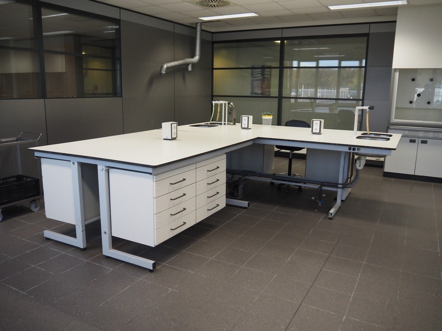 Laboratory equipment, consisting of: 4 laboratory counters, dimensions: 2500 mm x 1200 mm x 960 mm, 2500 mm x 1200 mm x 920 mm, 2000 mm x 1400 mm x 920 mm and 2000 mm x 1530 mm x 920 mm, 2 laboratory counters with double sink, dimensions: (2x) 4300 mm x 650 mm x 950 mm, laboratory counter with gas stove, dimensions: 8000 mm x 800 mm x 960 mm, laboratory counter with 4 sinks, dimensions: 3050 mm x 1530 mm x 920 mm, 3 fume hoods, dimensions: (3x) 1500 mm x 800 mm x 2850 mm.
