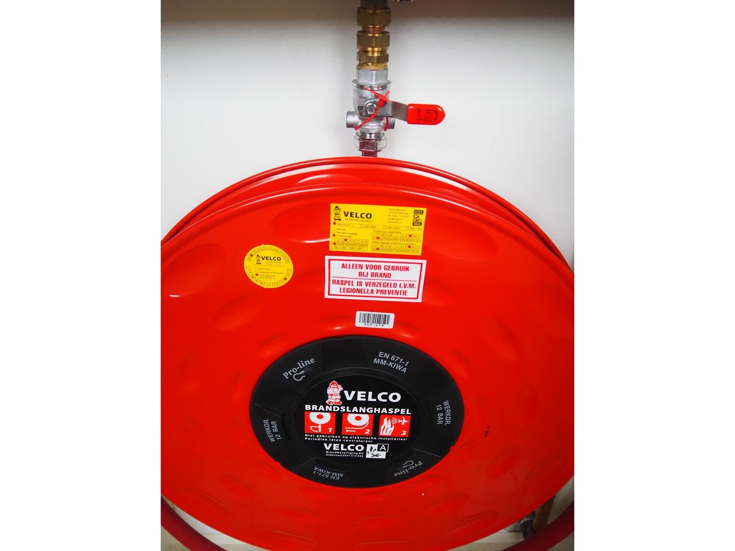 Steel cabinet with Velco fire hose reel and Velco fire extinguisher, dimensions fire hose reel: 850 mm x 180 mm x 950 mm.