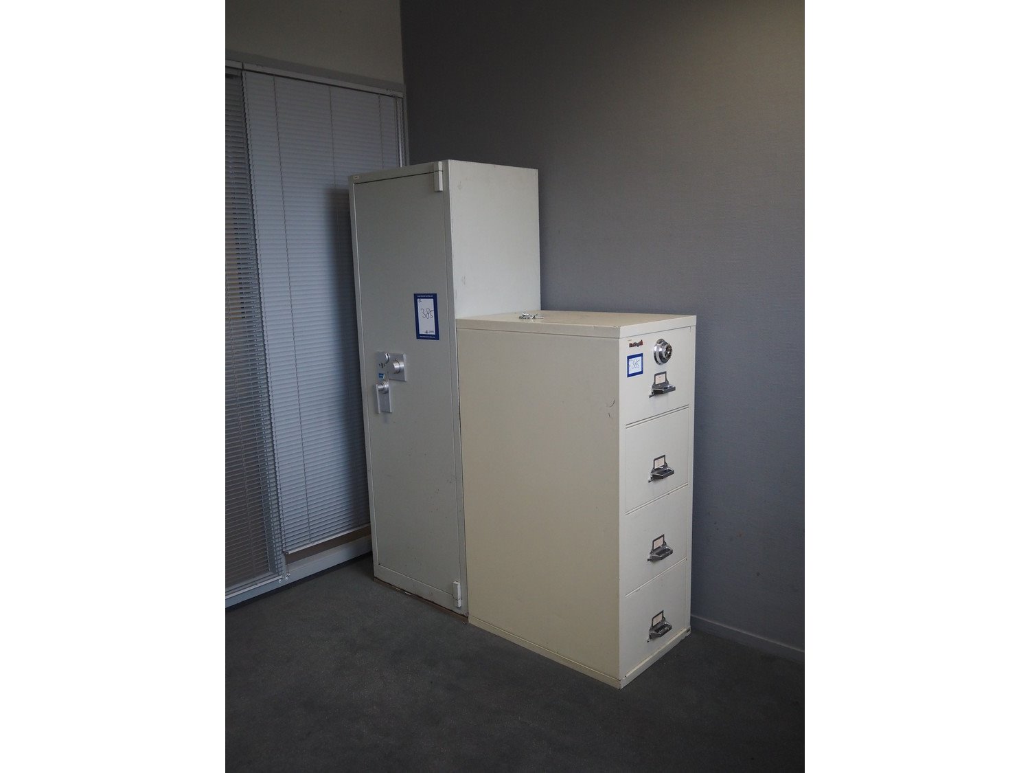 (1x) fire king safe, dimensions: 530 mm x 800 mm x 1340 mm, (1x) Derametaal safe, dimensions: 670 mm x 550 mm x 1970 mm.