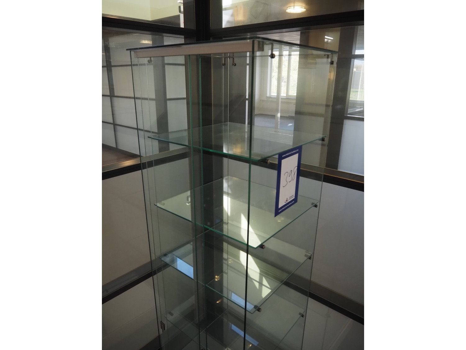 Glass display, 5 floors, floor dimensions: 450 mm x 450 mm, total dimensions: 490 mm x 490 mm x 1830 mm.