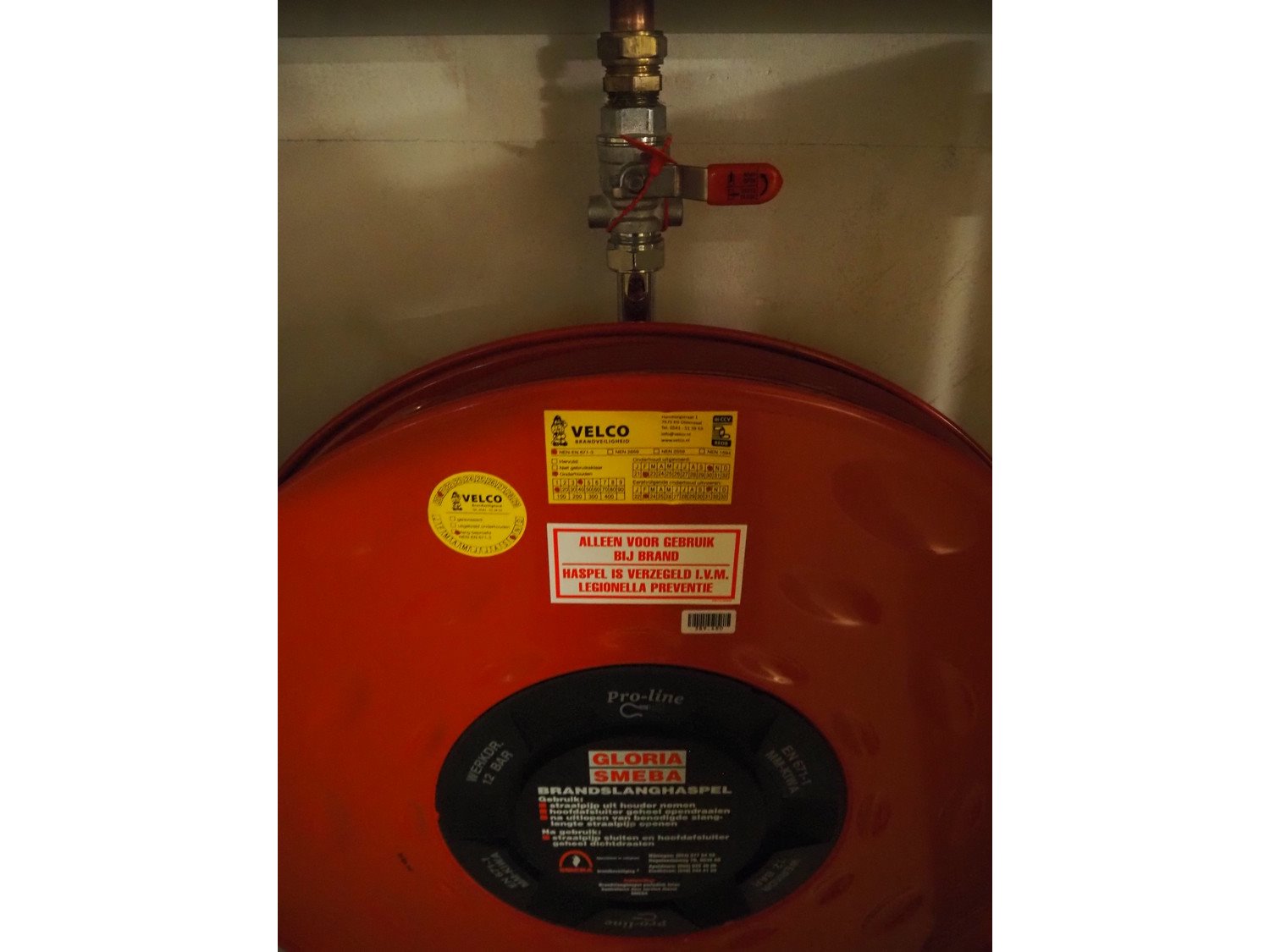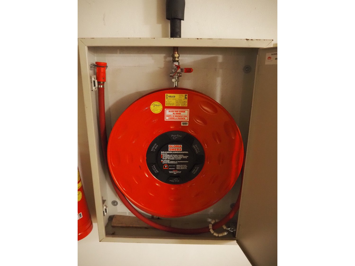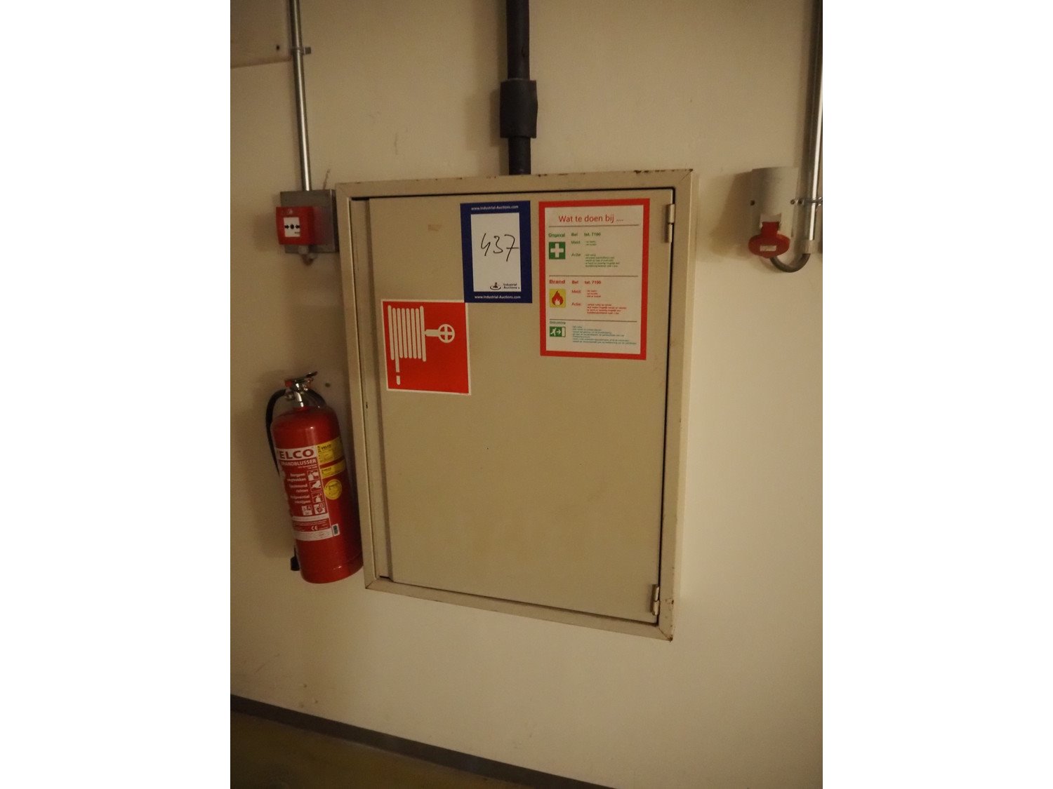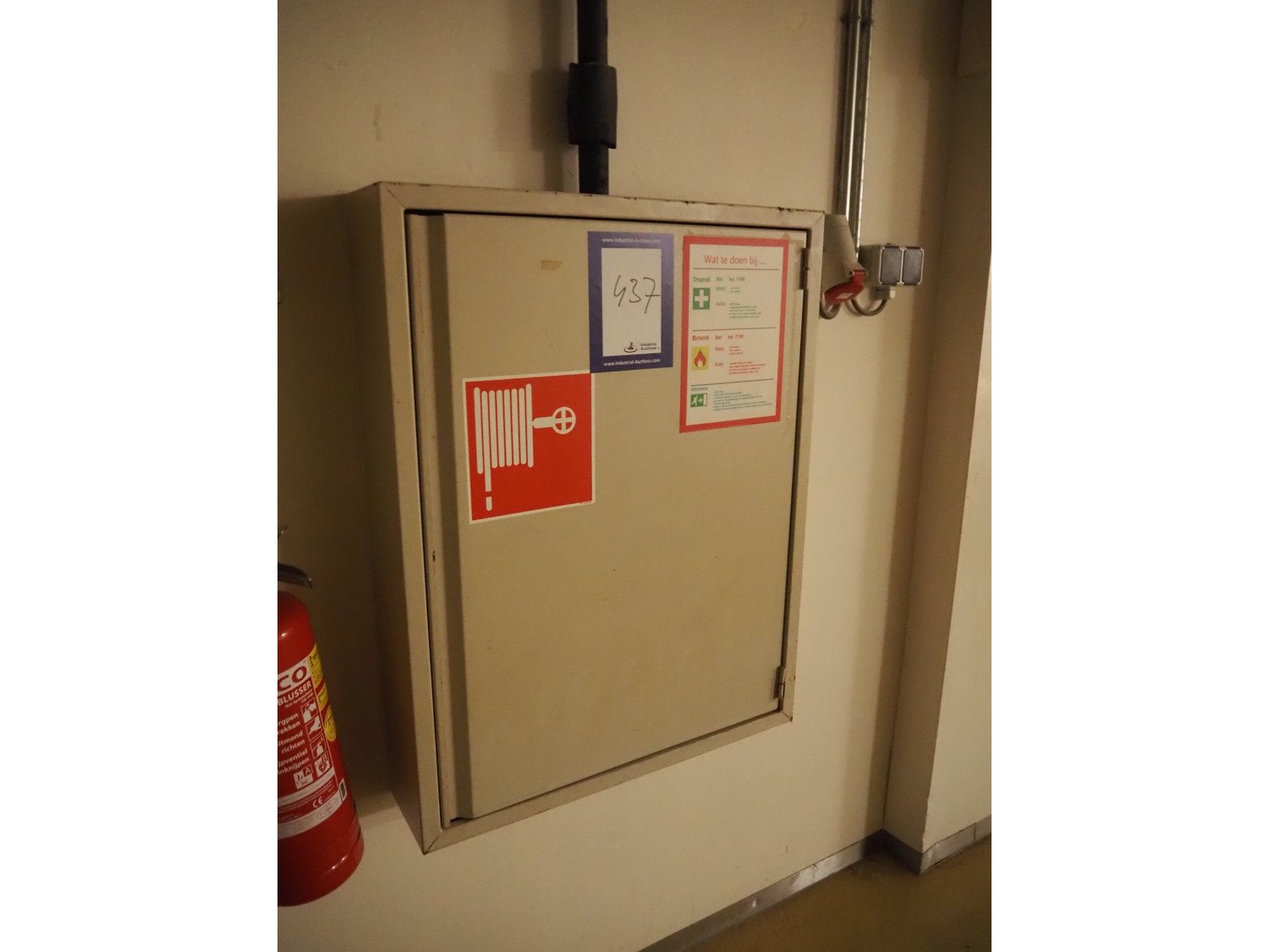 Steel cabinet with Gloria Smeba fire hose reel and Velco fire extinguisher, dimensions fire hose reel: 730 mm x 180 mm x 940 mm.