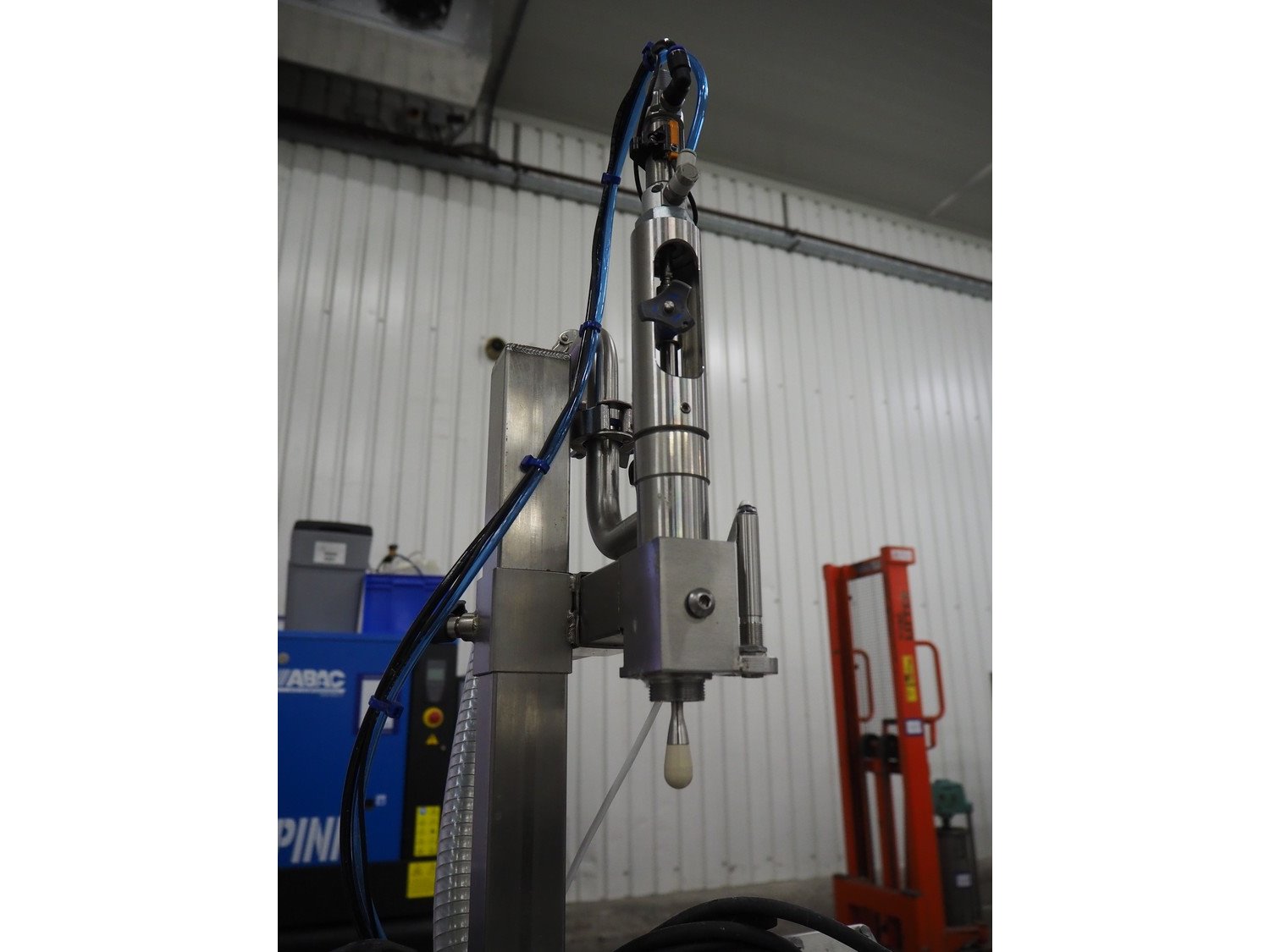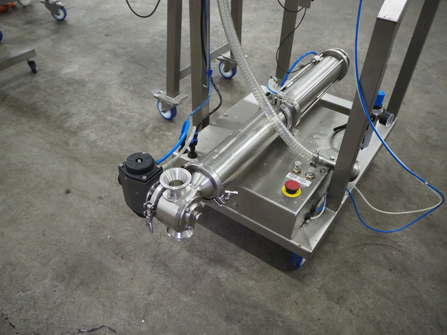 EFM Machinery mobile semi-automatic piston filling machine used for filling buckets, type: V1100, serial number: 21180, year of construction: 2022, 230 V, 50 Hz, 0.12 kW, 6 bar, filling range buckets: 50-5000 ml, dimensions: 1000 mm x 500 mm x 1500 mm.