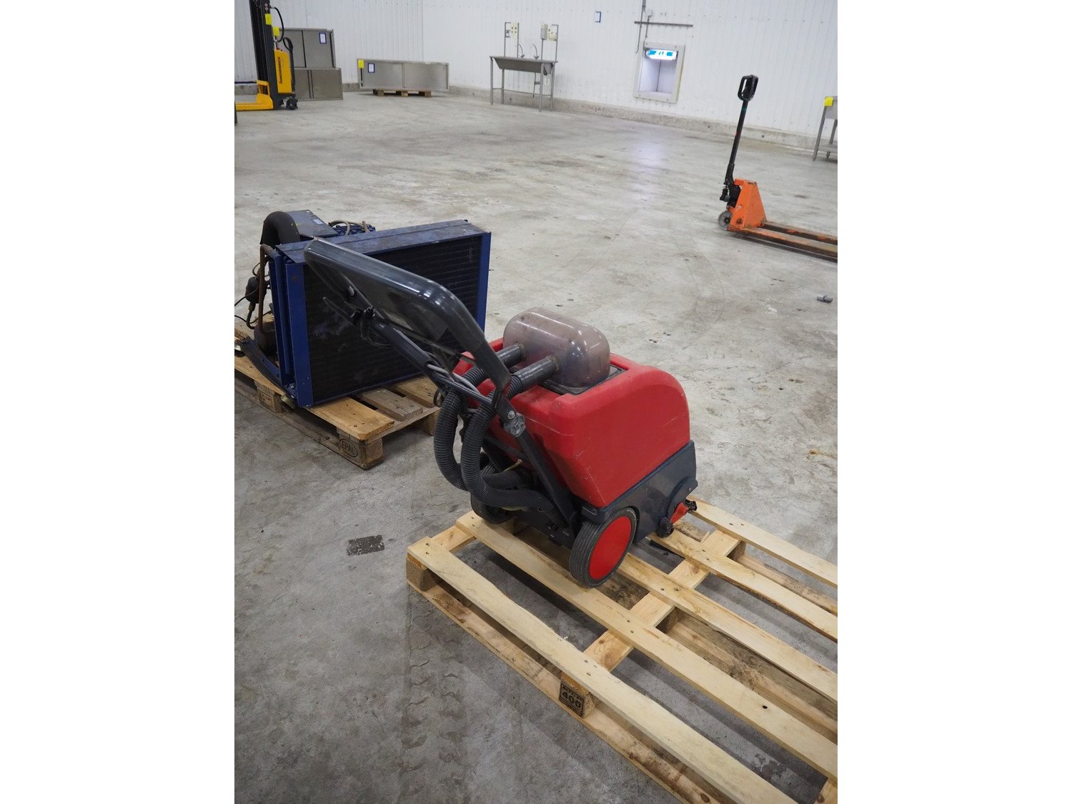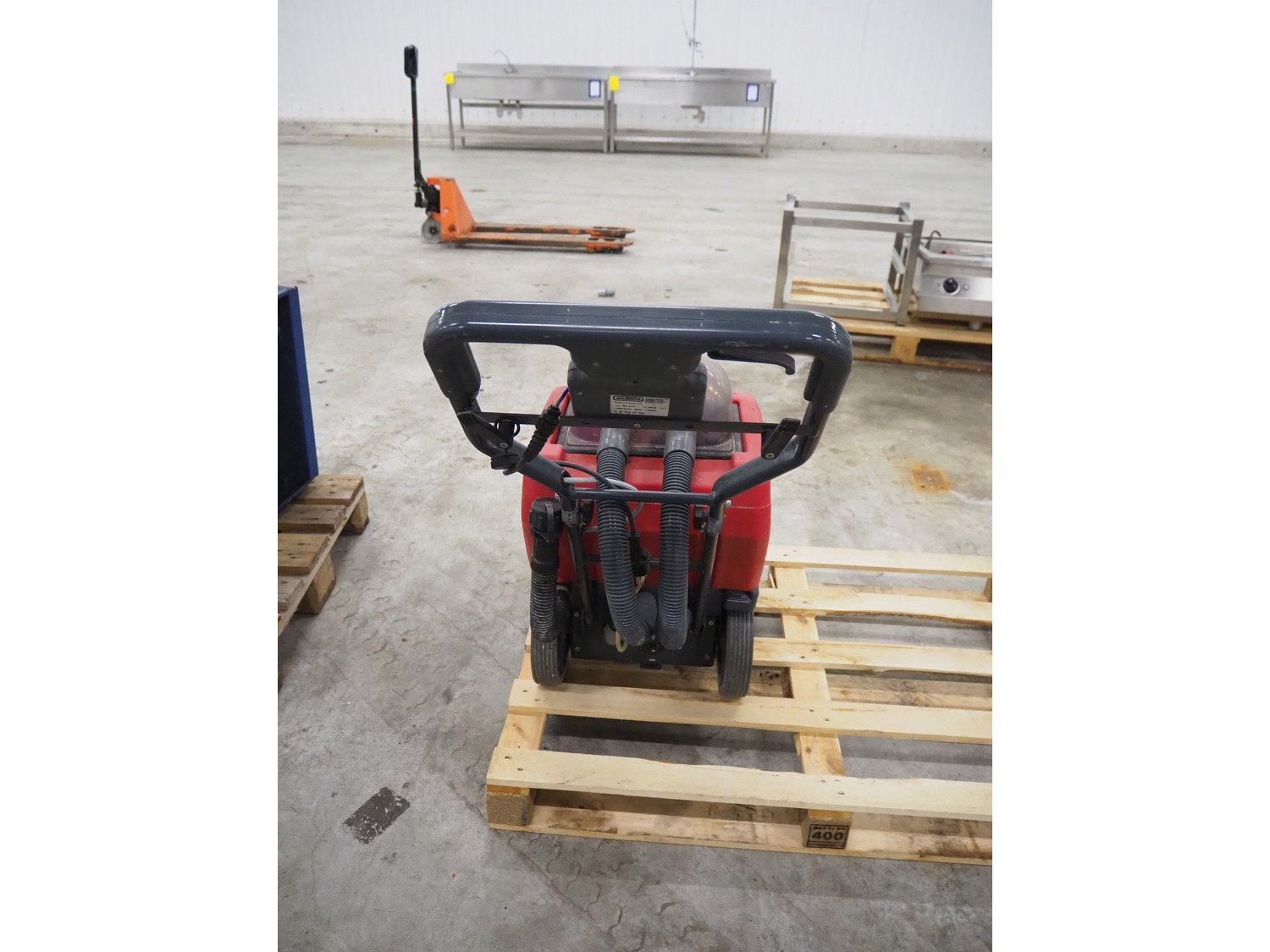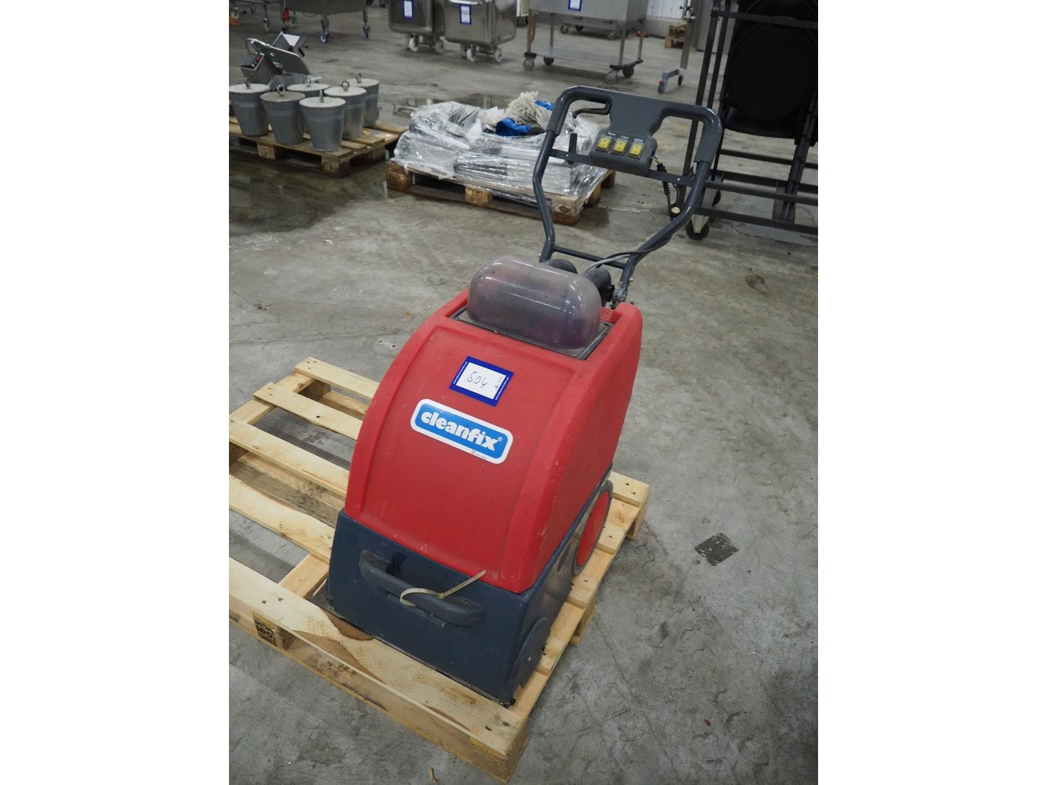 Cleanfix floor scrubbing machine, type: RA 410, number: 8435 011, 230-240 V, 50 Hz, 1300 W, dimensions: 420 mm x 1050 mm x 940 mm.