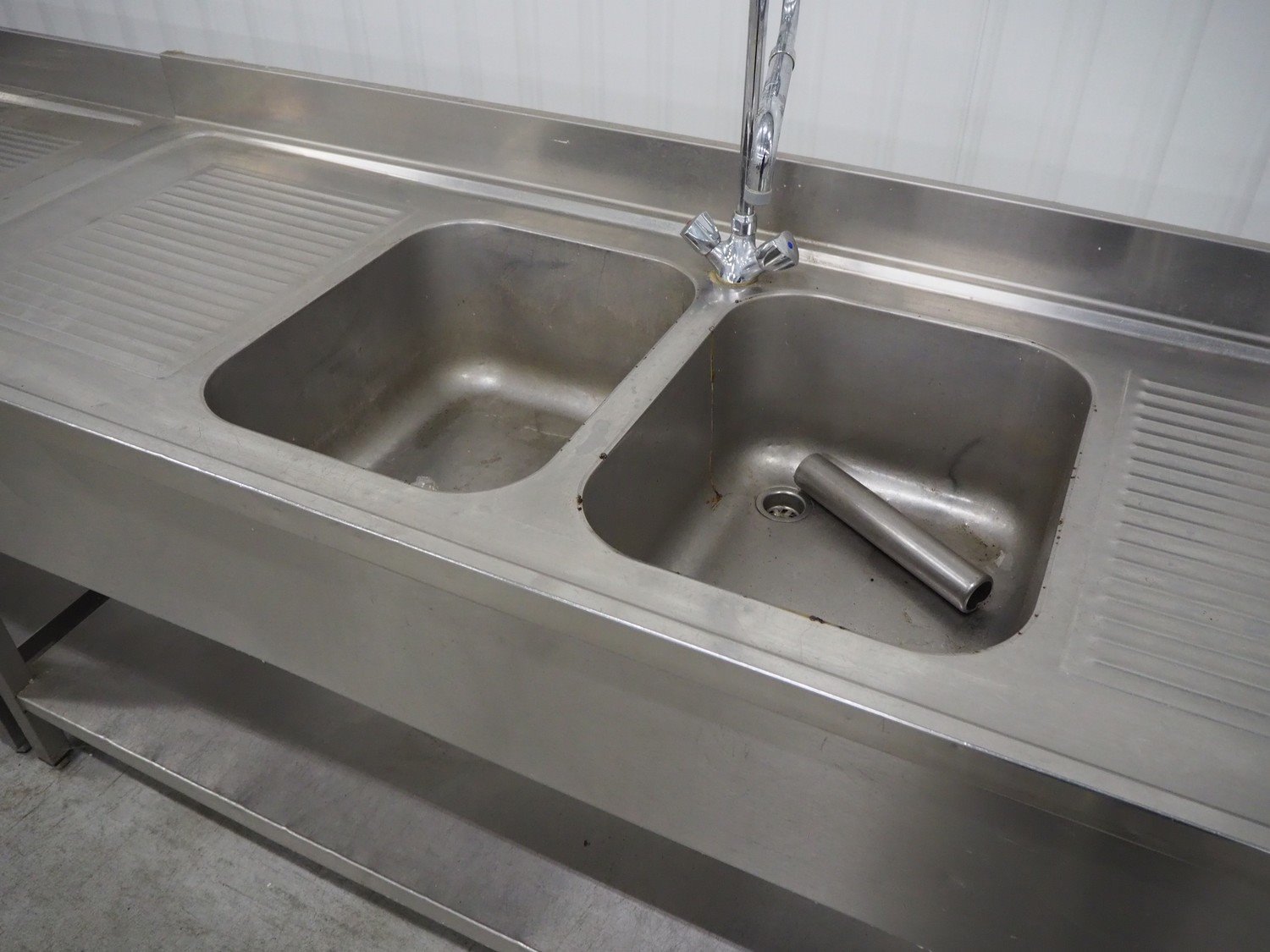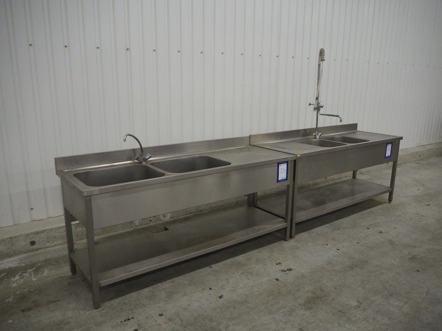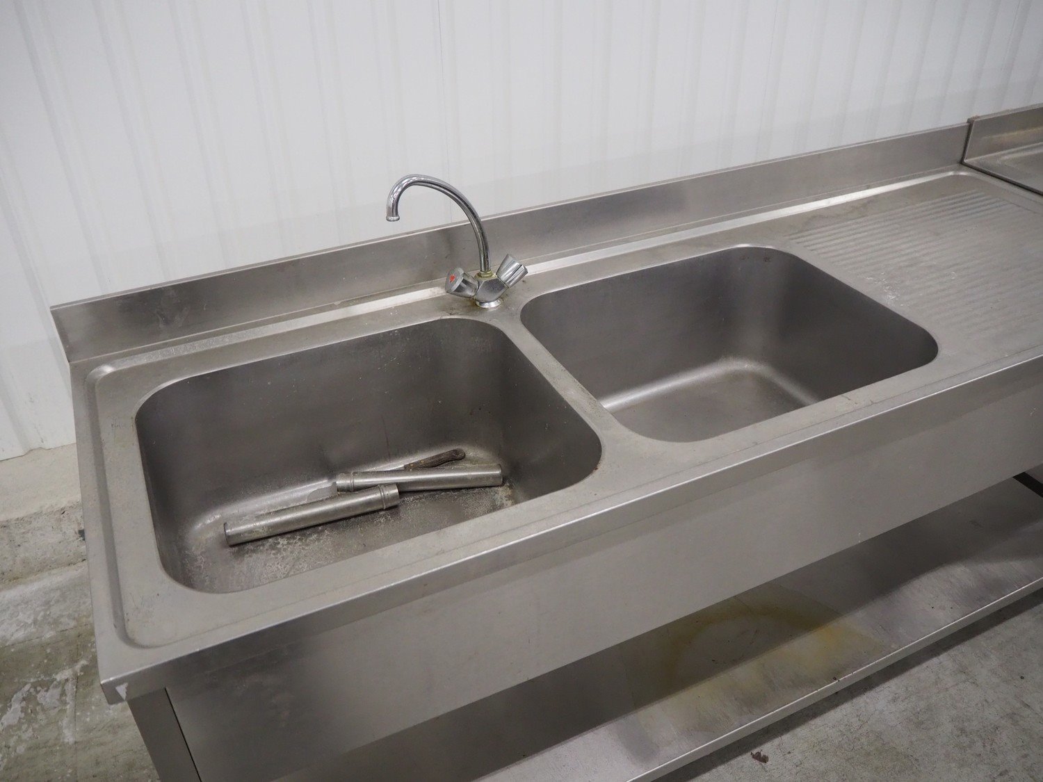 2 double sinks with faucet, dimensions: (1x) 2000 mm x 700 mm x 980 mm, (1x) 2000 mm x 700 mm x 1900 mm.