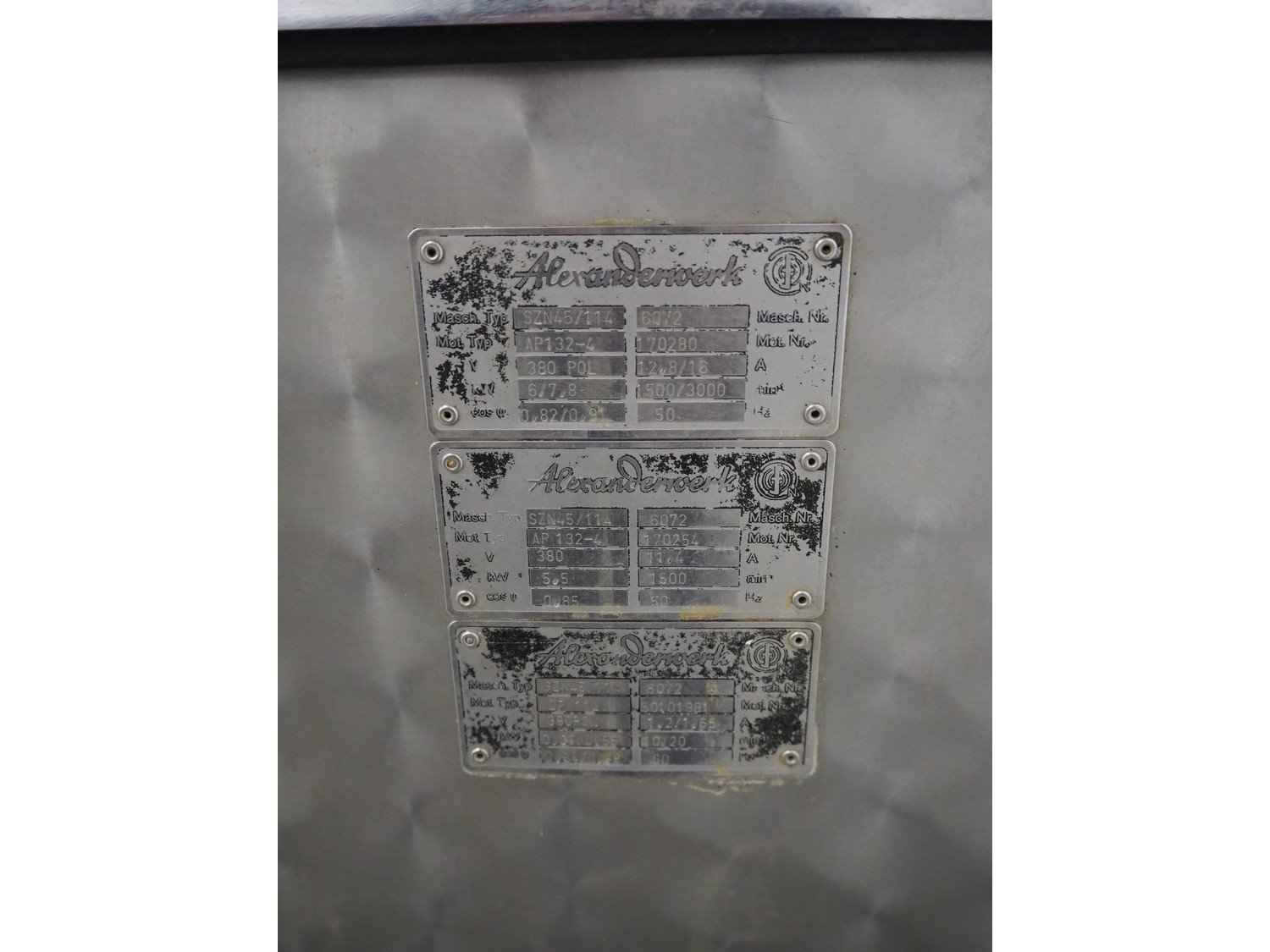 Alexanderwerk cutter/grinder, type: SZN45/114, number: 6072, 380 V, 50 Hz, 11.4 A, 5.5 kW, Ø bowl: 800 mm, Ø plate: 113 mm, total dimensions: 1500 mm x 900 mm x 1090 mm. Technical condition unknown.