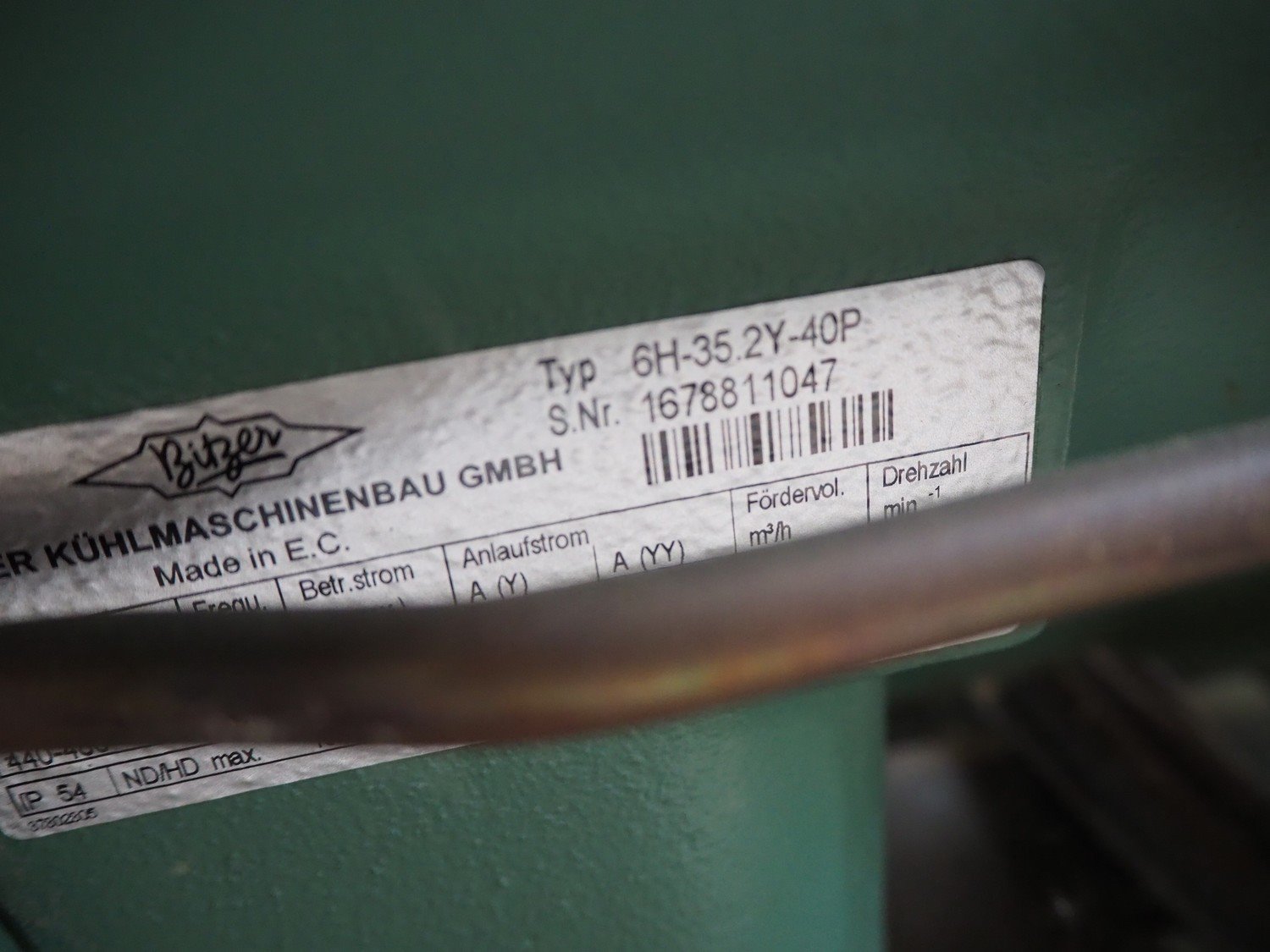 2 Bitzer Kühlmaschinenbau GmbH cooling compressors, type: 6H-35.2Y-40P, serial number: 1678811047 and 1679008231, refrigerant: R449A, dimensions: 900 mm x 1400 mm x 700 mm. Including switch cabinet.