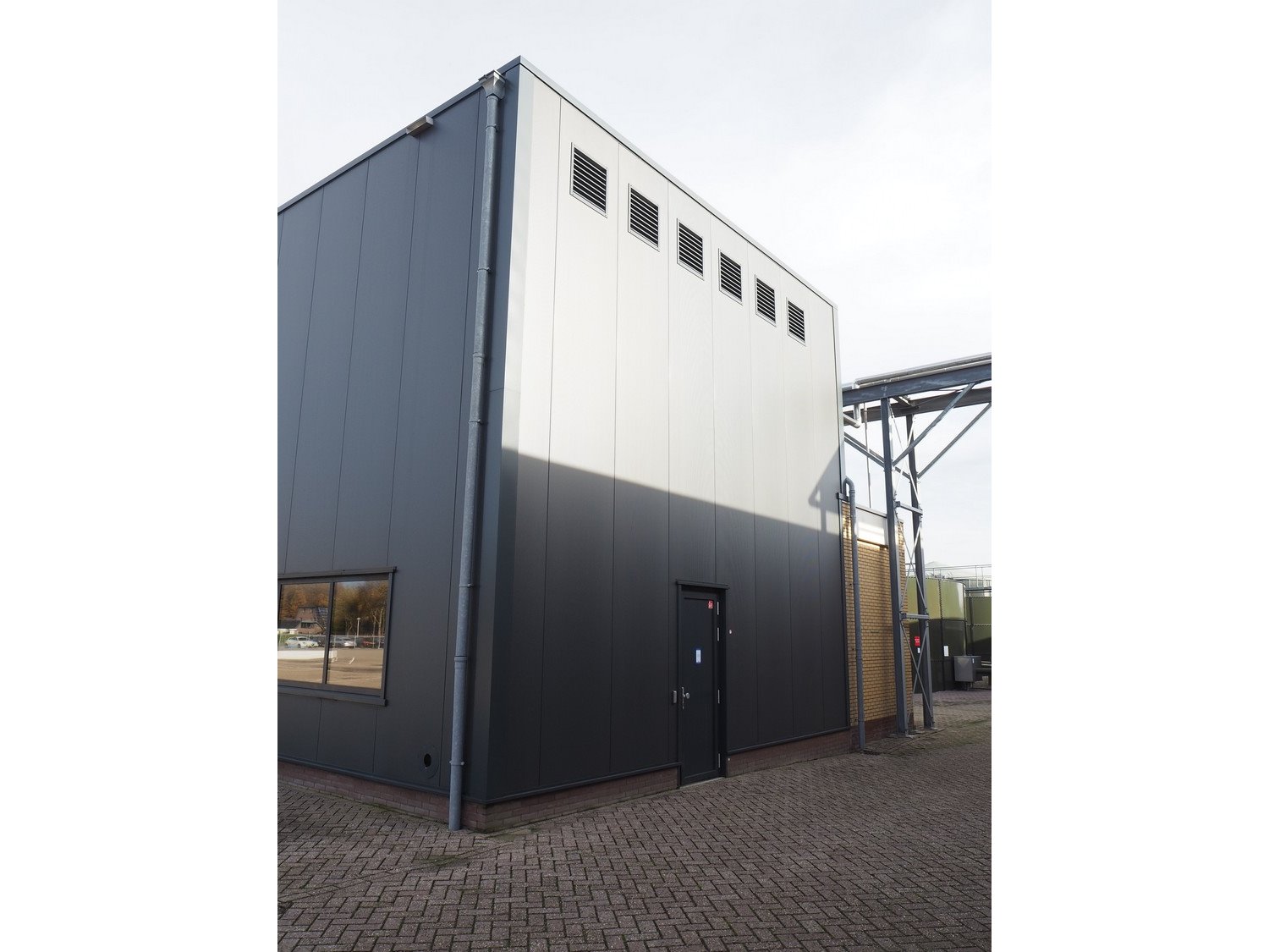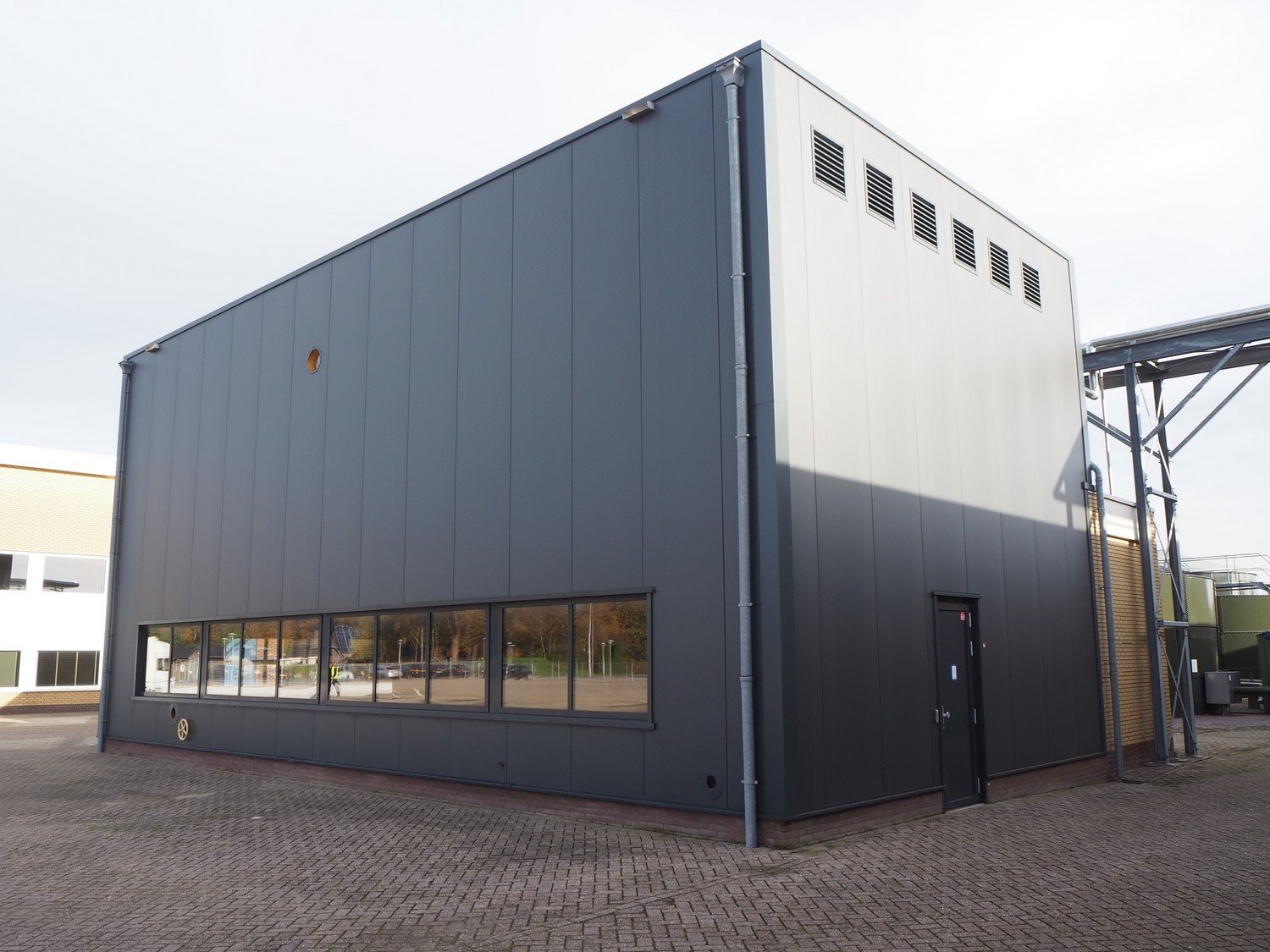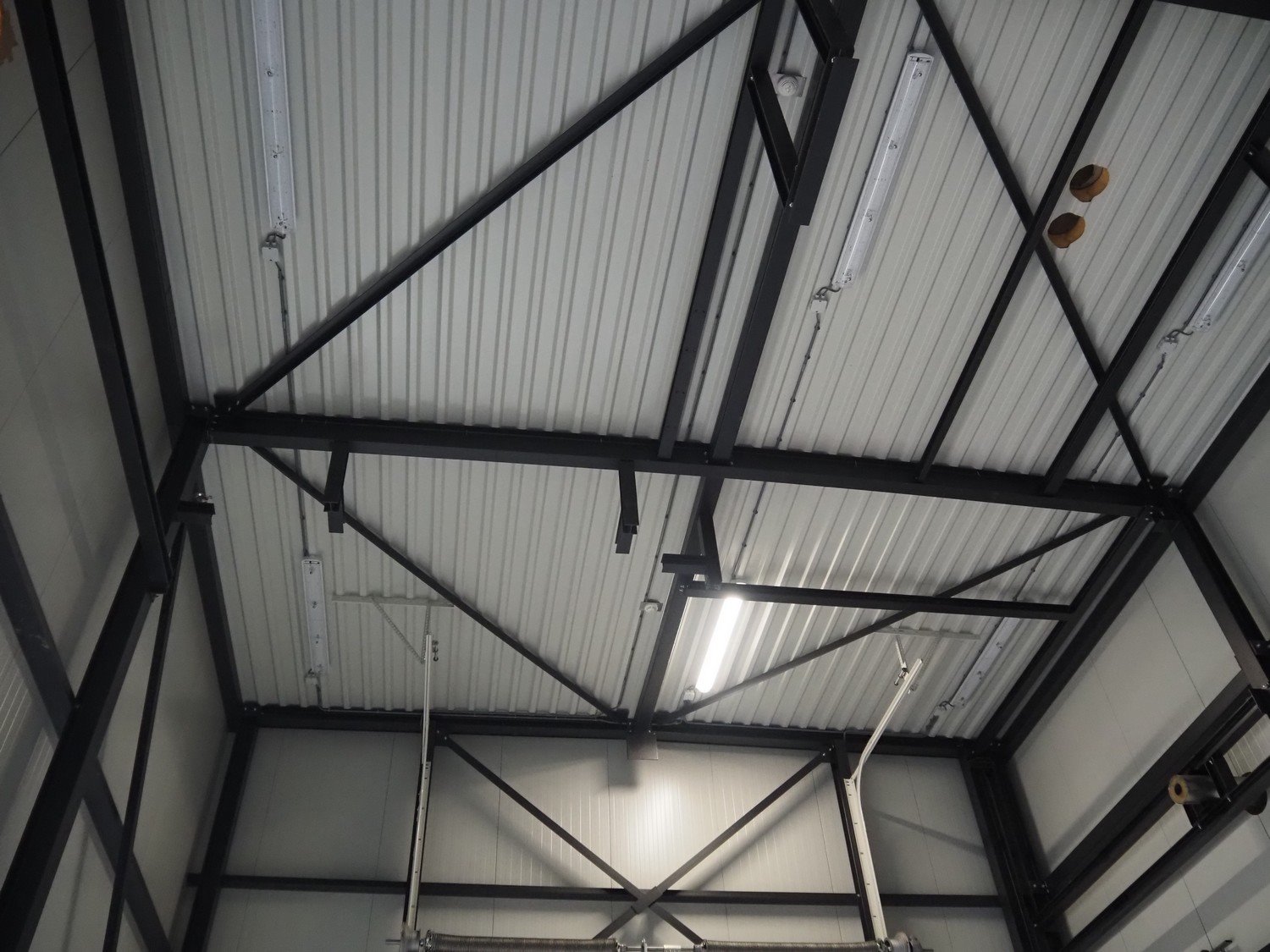 Building with steel structure, panels and roller door, dimensions: 16000 mm x 8000 mm x 8000 mm.