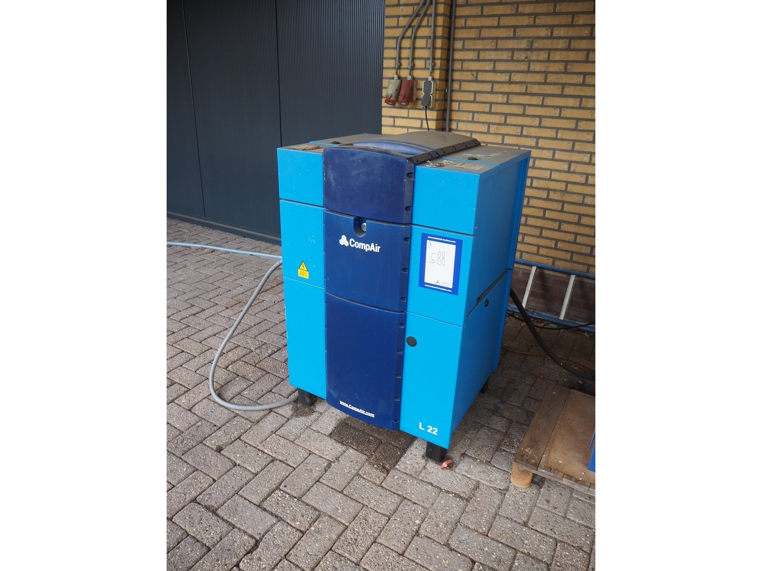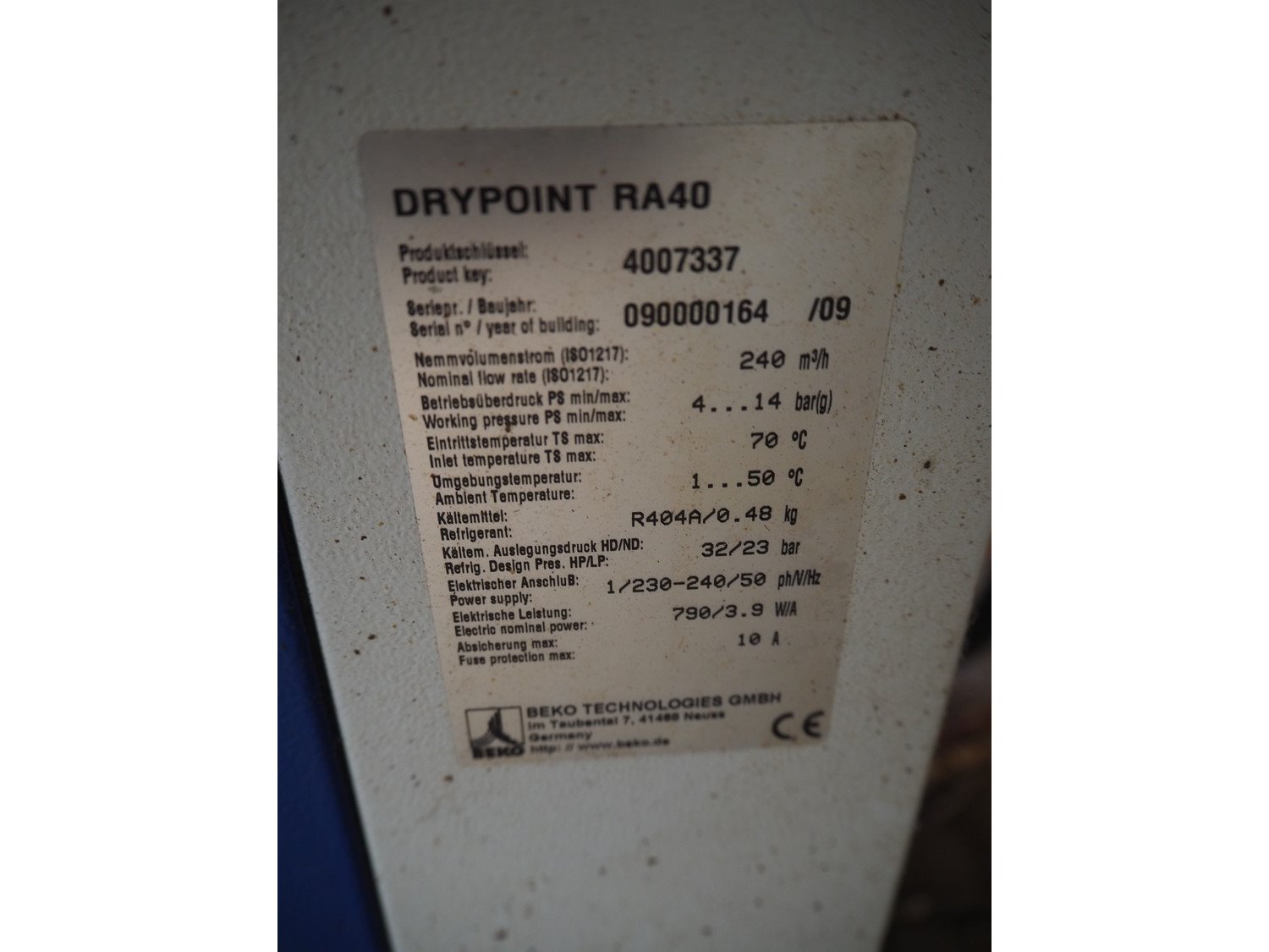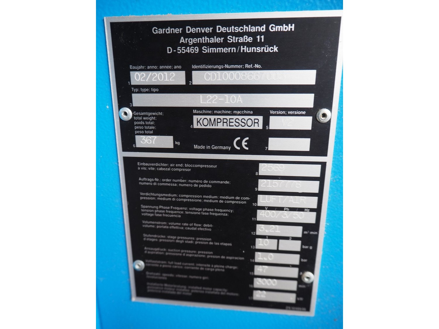 Gardner Denver Deutschland GmbH air compressor, ID number: CD10008667003, year of construction: 02/2012, 400 V, 3 Ph, 50 Hz, 47 A, 22 kW, flow rate: 3.21 m³/min, stage pressure: 10 bar, suction pressure: 1.0 bar, dimensions: 870 mm x 670 mm x 1170 mm, Beko Technologies GmbH air dryer, model: Drypoint RA40, serial number: 090000164/09, year of construction: 2009, 230-240 V, 1 Ph, 50 Hz, 3.9 kW, 10 A, refrigerant: R404A/0.48 kg, dimensions: 480 mm x 510 mm x 820 mm, BMT steel pressure vessel, fabrication number: AV2011/114, year of construction: 1998, volume: 2000 litres, dimensions: 2000 litres, dimensions: Ø 1200 mm x 2400 mm.