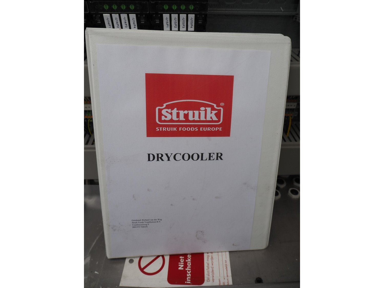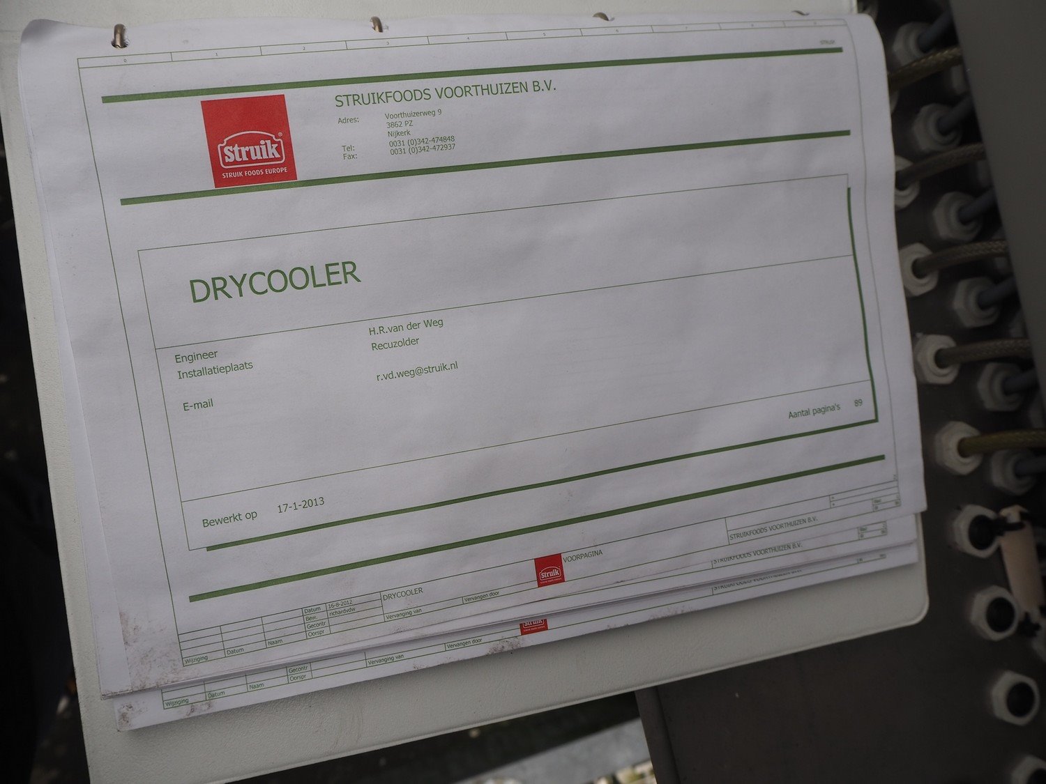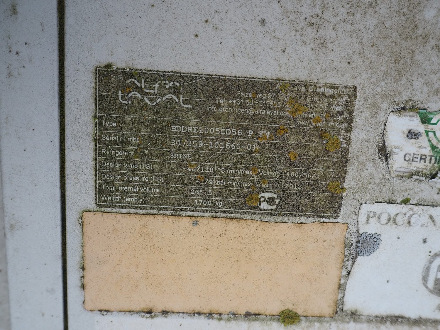 Alfa Laval condenser, 10 fans, type: BDDRE1005CD56 P SW, serial number: 30/259-101660-01, tear of construction: 2012, volume: 265.5 liters, TS: -40/110 °C, PS:-1/9 bar, refrigerant: Brine, empty weight: 1700 kg, on steel frame with switch cabinet, dimensions: 13000 mm x 2400 mm x 2300 mm. Situated on the roof. Can be picked-up at a later date as soon as the building will be demolished next year, a date for this is yet unknown.