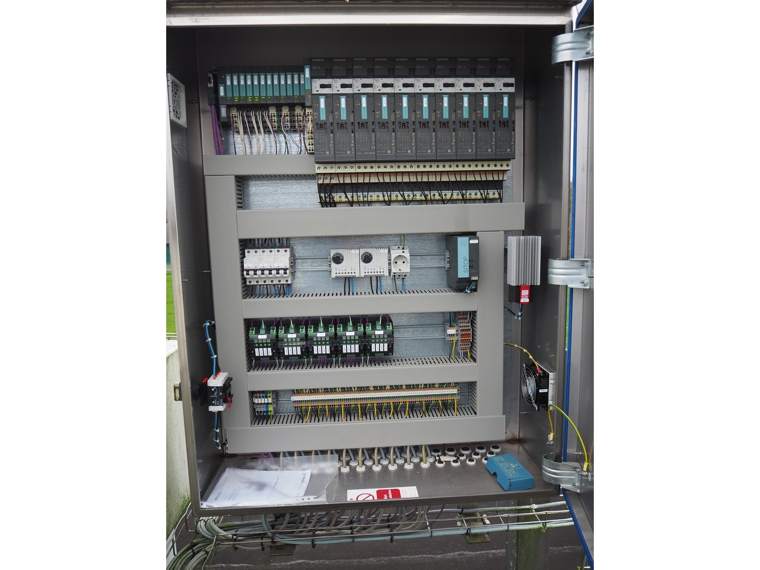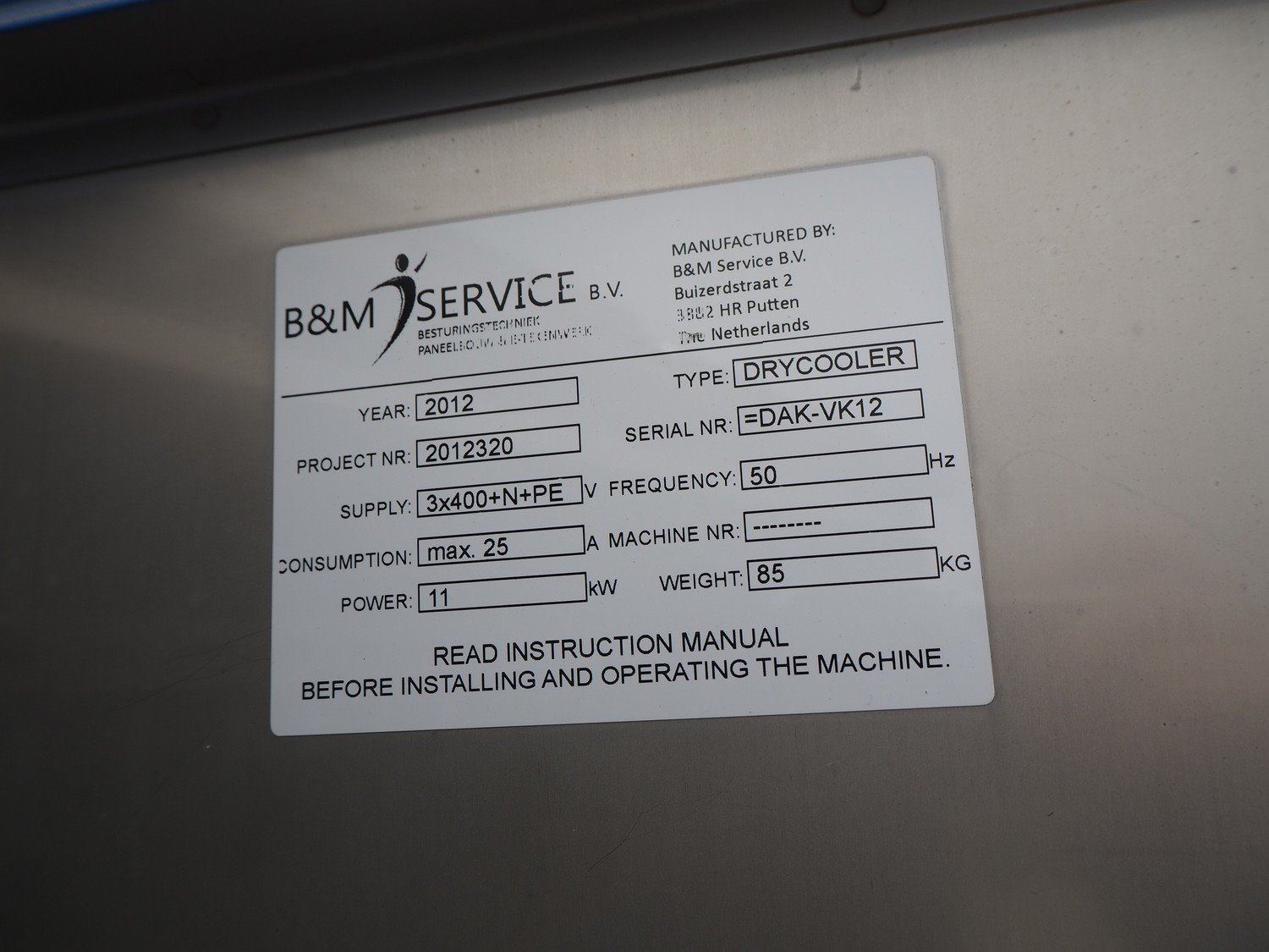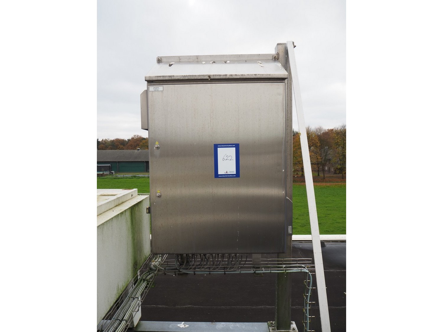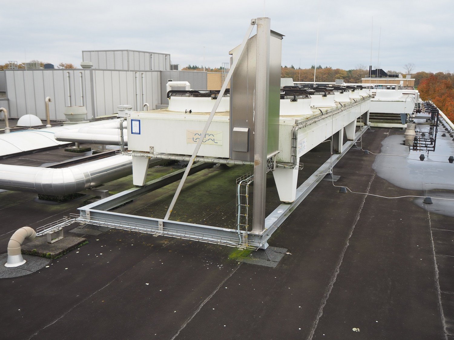 Alfa Laval condenser, 10 fans, type: BDDRE1005CD56 P SW, serial number: 30/259-101660-01, tear of construction: 2012, volume: 265.5 liters, TS: -40/110 °C, PS:-1/9 bar, refrigerant: Brine, empty weight: 1700 kg, on steel frame with switch cabinet, dimensions: 13000 mm x 2400 mm x 2300 mm. Situated on the roof. Can be picked-up at a later date as soon as the building will be demolished next year, a date for this is yet unknown.