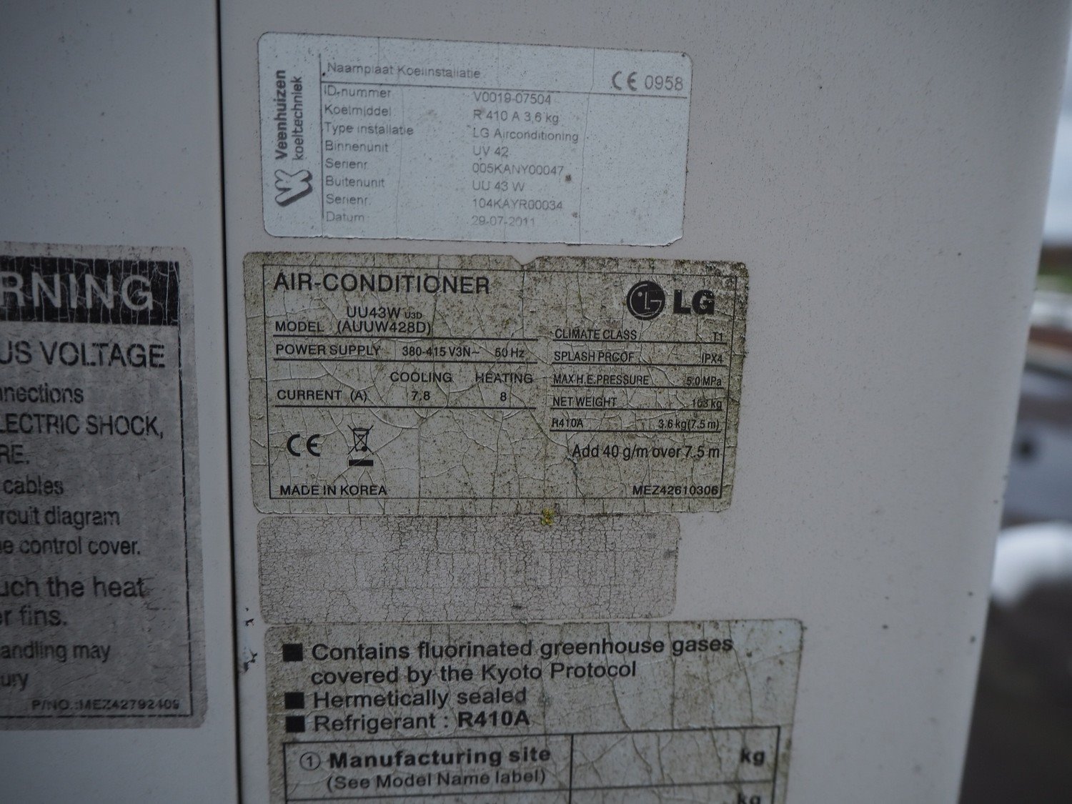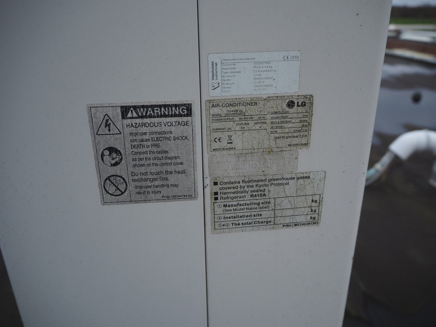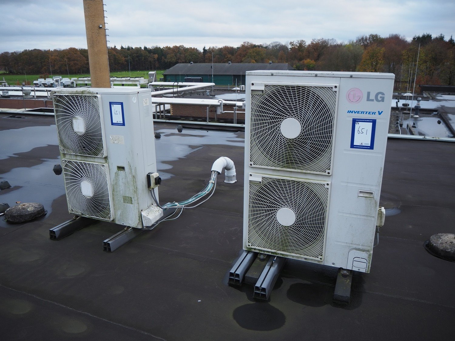 (2x ) LG outside air-conditioning unit, dimensions: 950 mm x 350 mm x 1390 mm and 870 mm x 350 mm x 1200 mm. Situated on the roof.