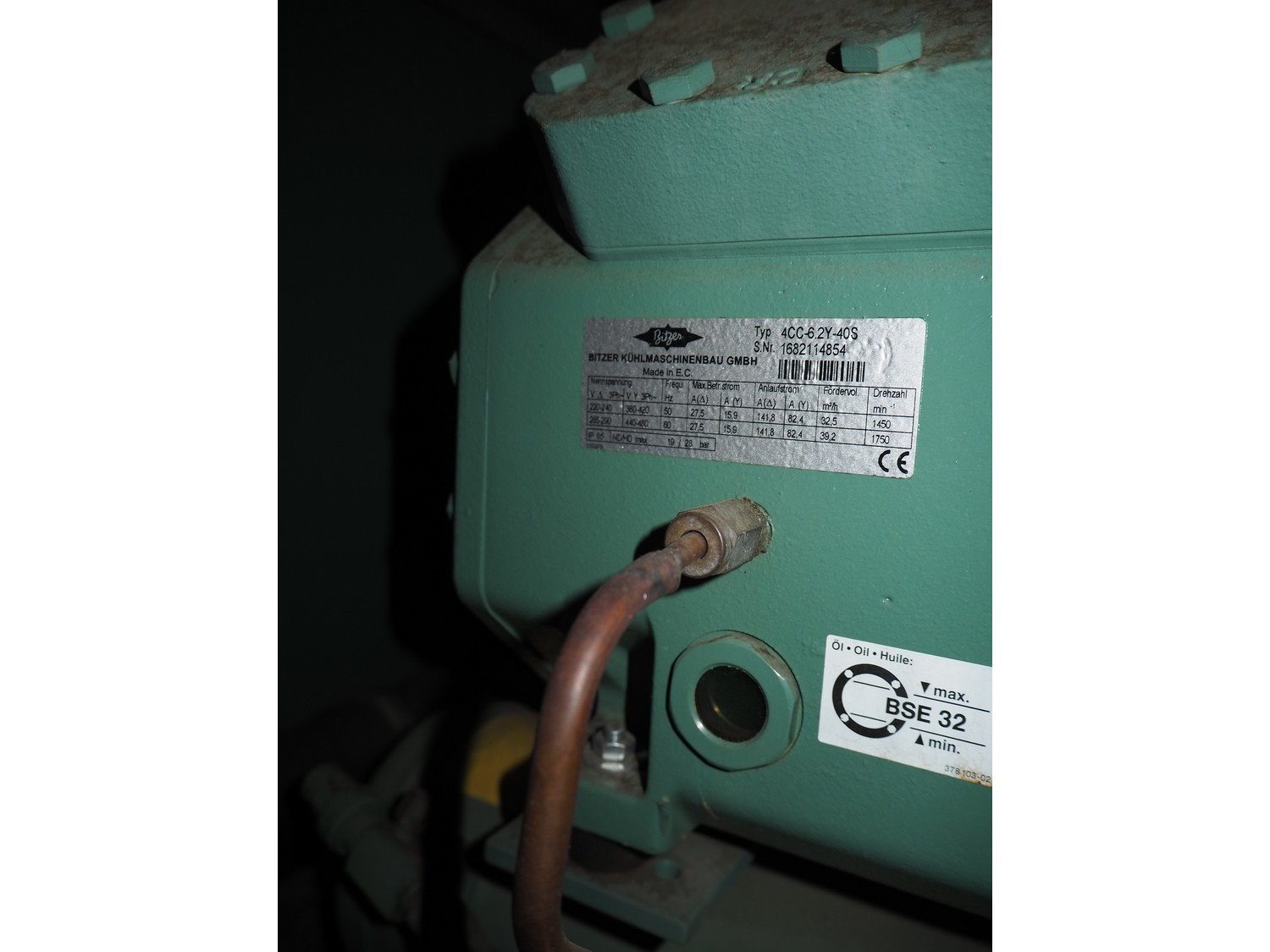Condensing unit with Bitzer Kühlmaschinenbau GmbH cooling compressor, type: 4CC-6.2Y-40S, serial number: 1682114854, capacity: 32.5/39.2 m³/h, dimensions: 1300 mm x 1100 mm x 800 mm. Situated on the roof.