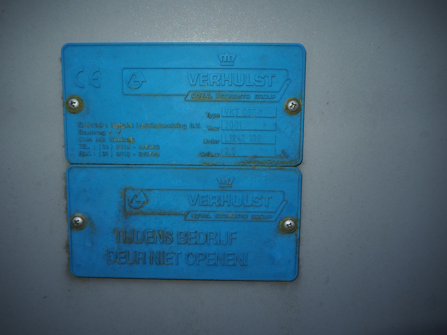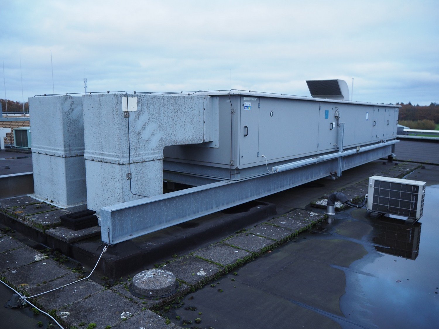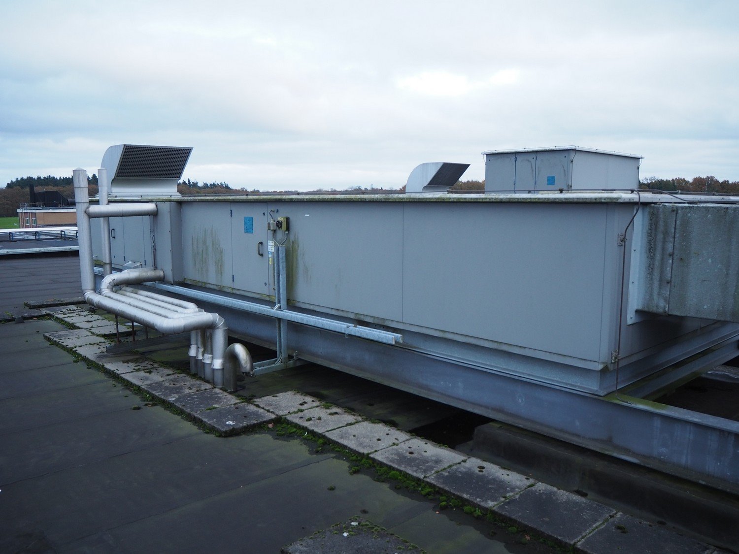 Verhulst air treatment cabinet, type: VKT 0604, year of construction: 2001, airflow: 2.5 m³/s, dimensions: 9100 mm x 3000 mm x 2100 mm. Situated on the roof. Can be picked-up at a later date as soon as the building will be demolished next year, a date for this is yet unknown.