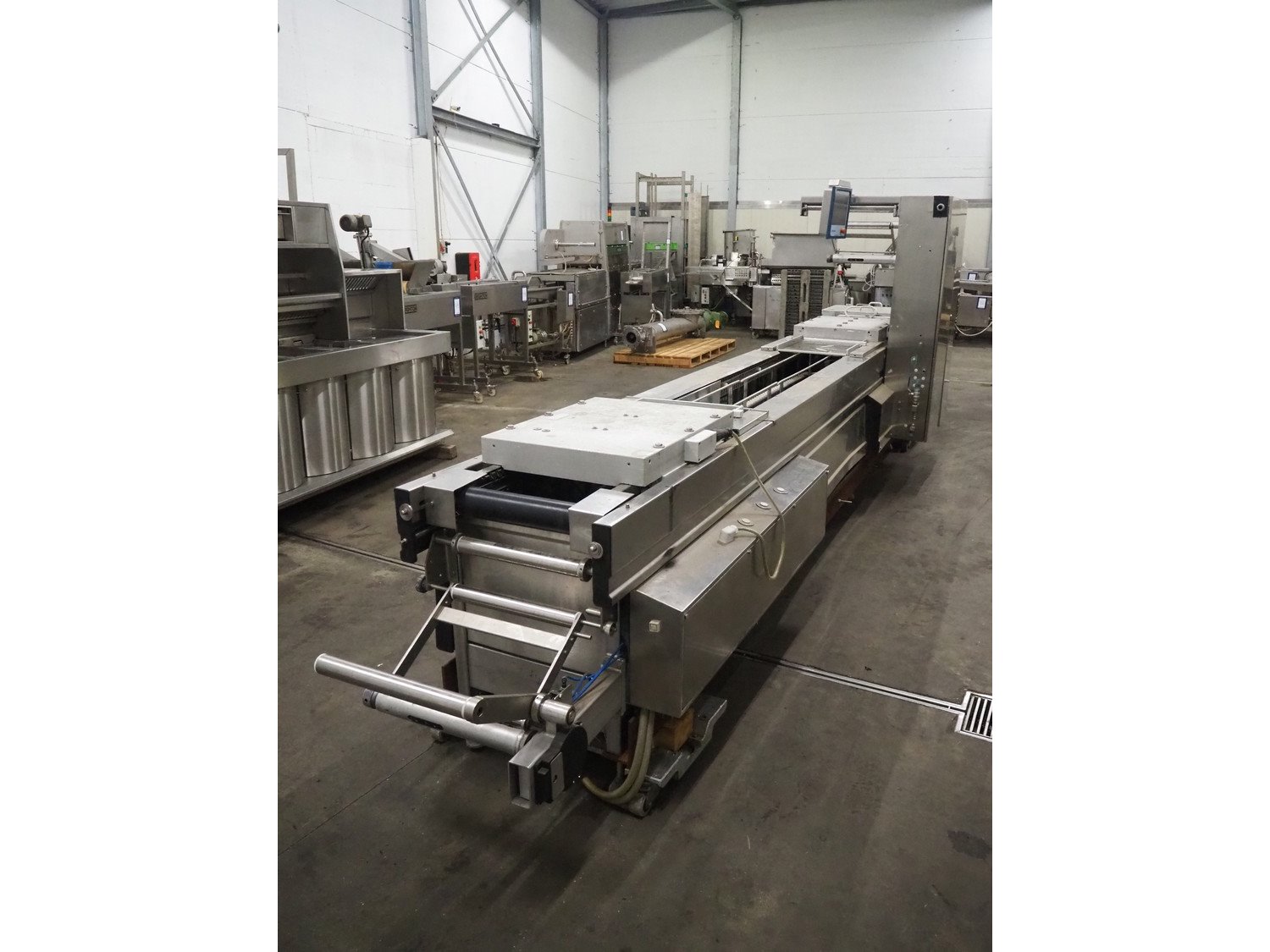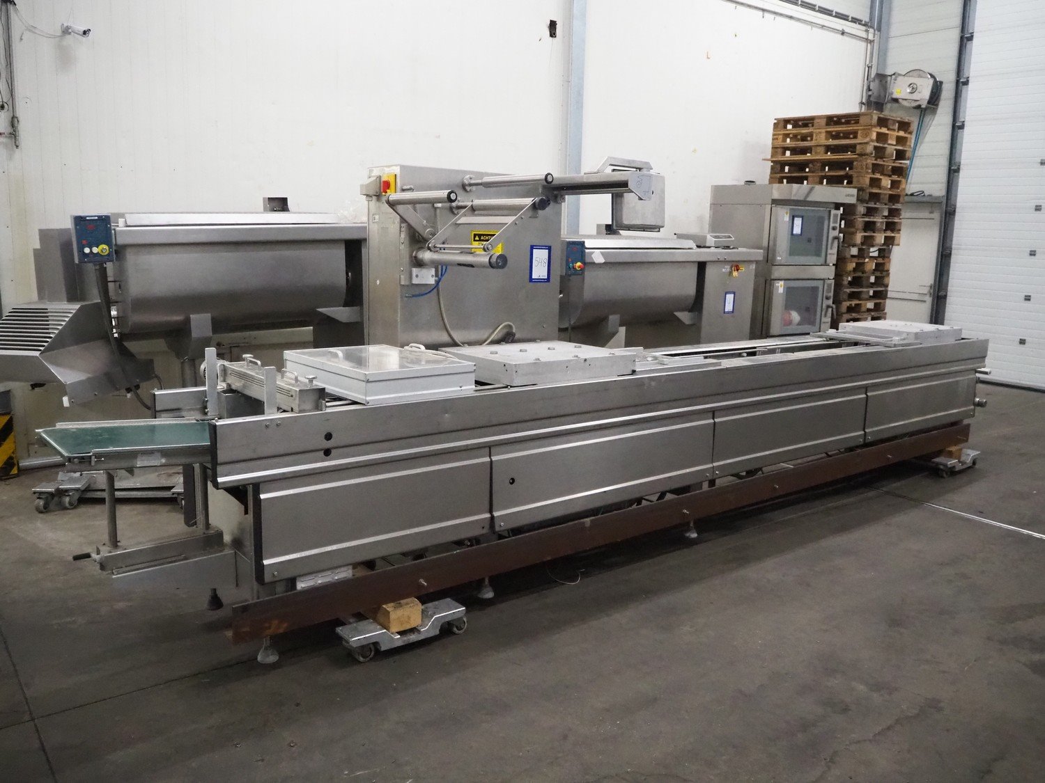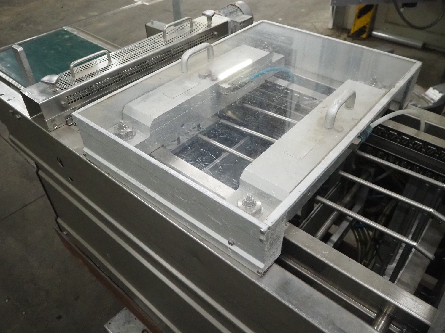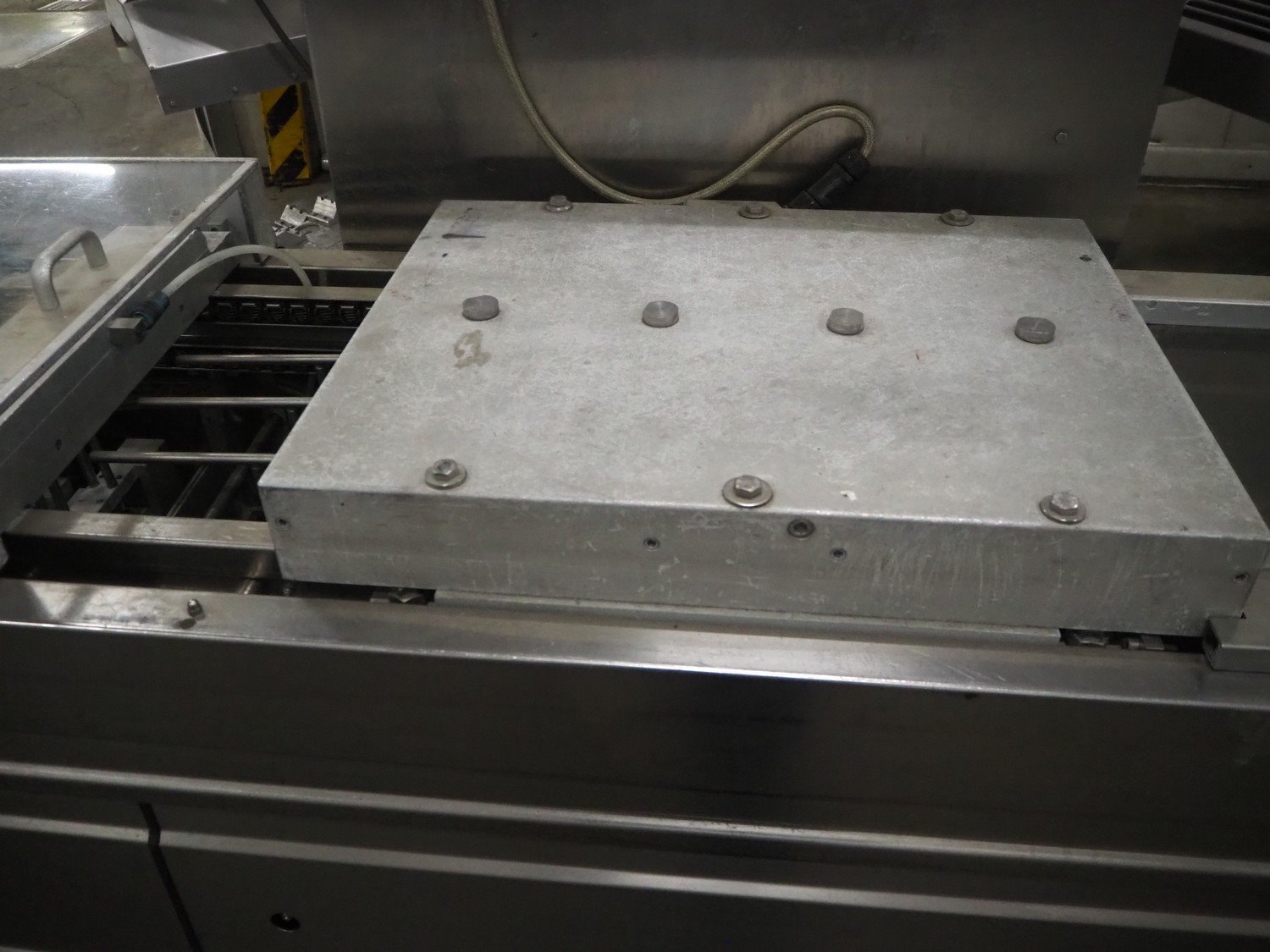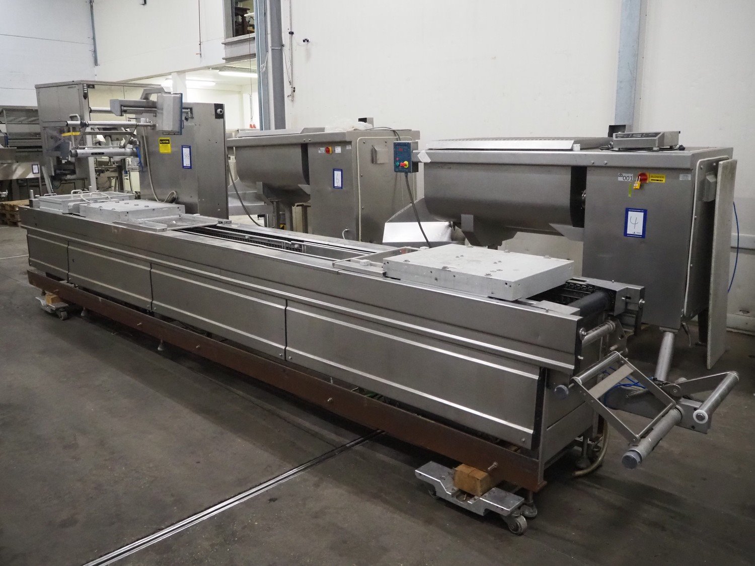 Multivac thermoformer, type: R530, dimensions dye: (8x) 78 mm x 325 mm, plastic belt, belt width: 378 mm, total dimensions: 7660 mm x 1040 mm x 1870 mm. Including Busch vacuum pump, dimensions pump: 1100 mm x 370 mm x 7200 mm. Without rollies.