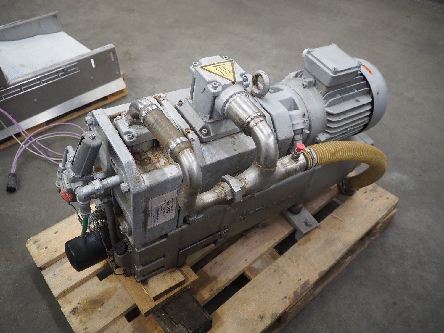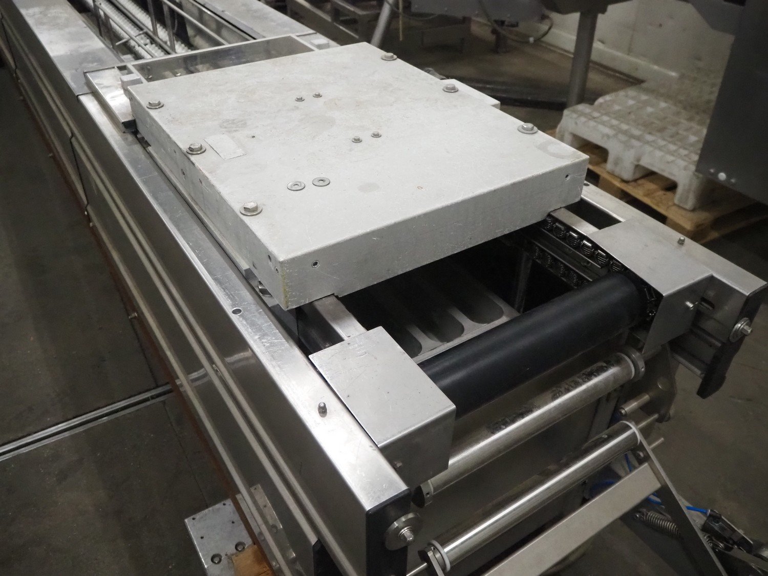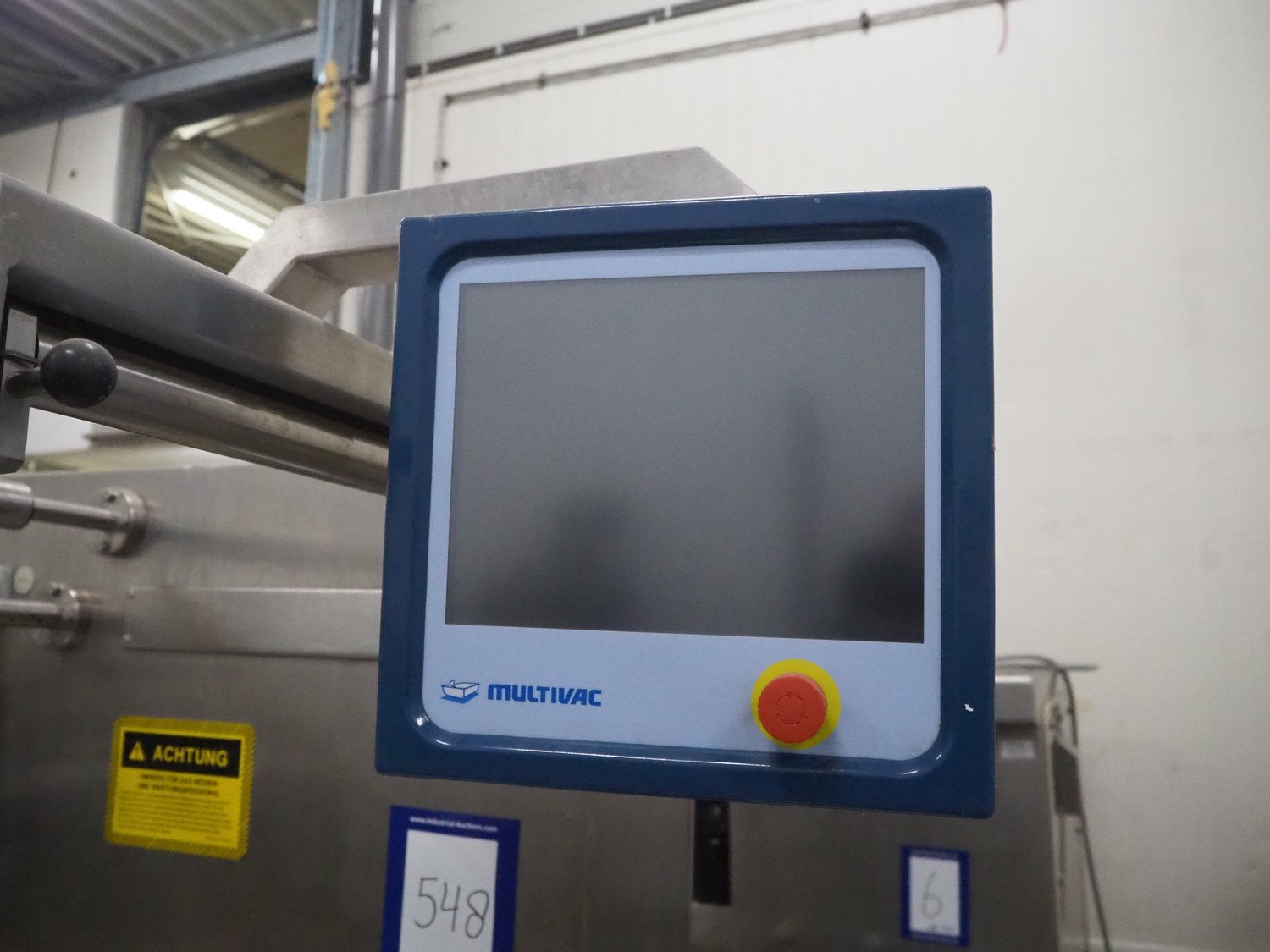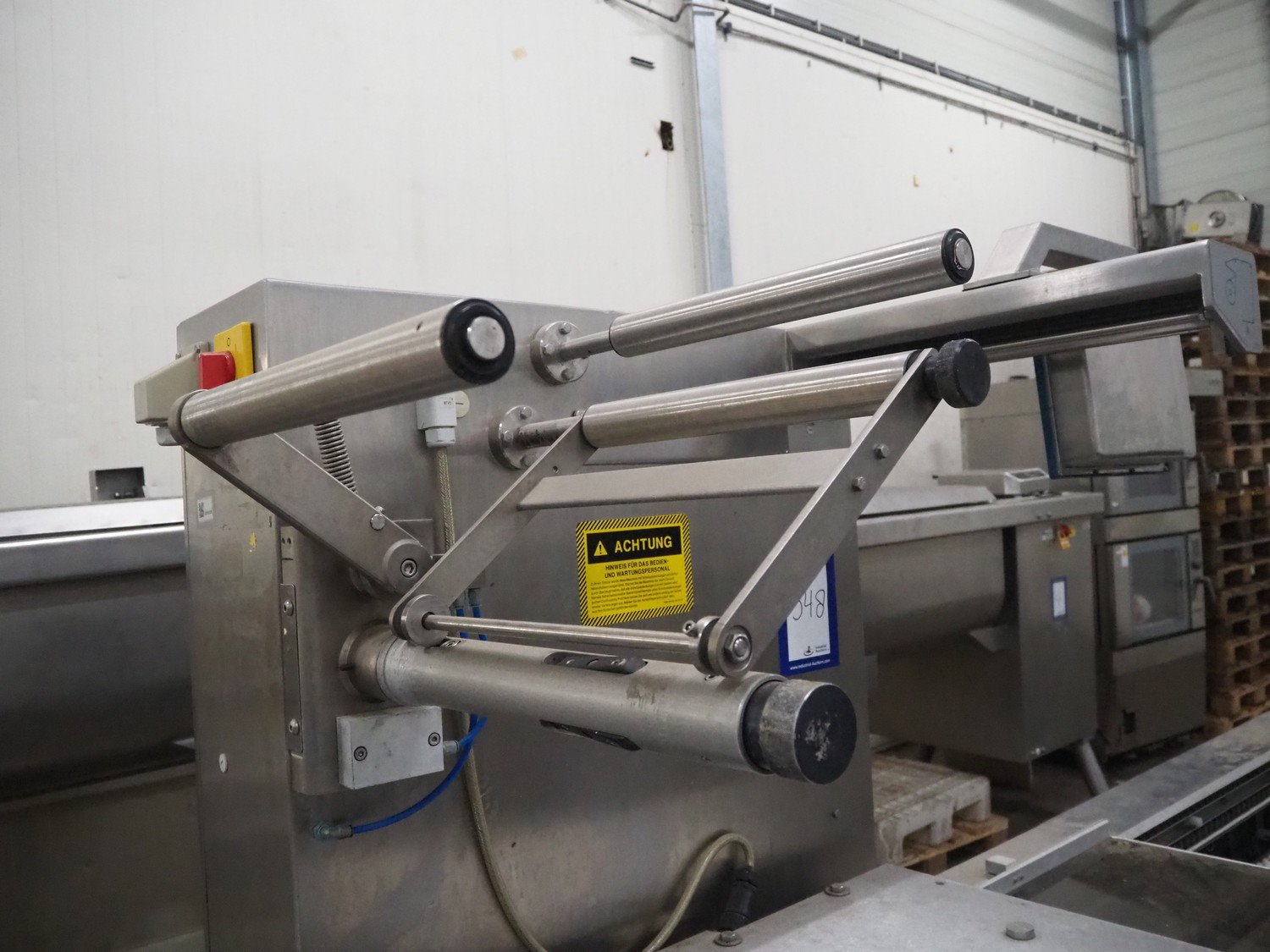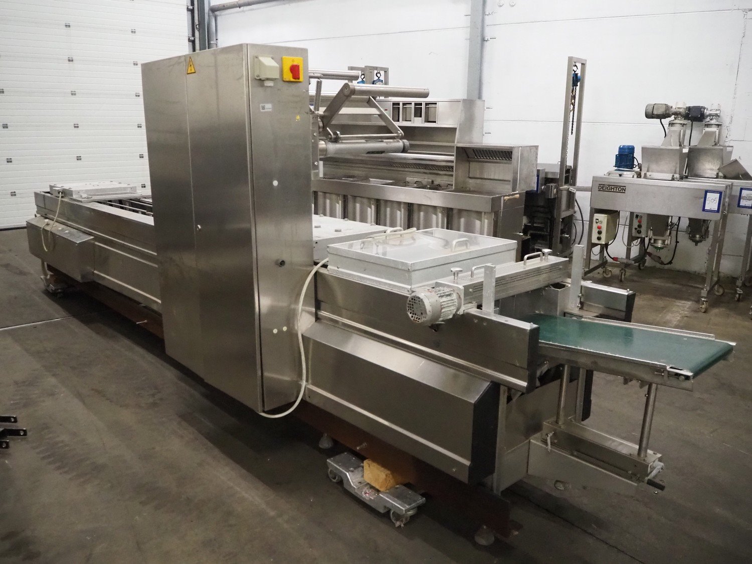 Multivac thermoformer, type: R530, dimensions dye: (8x) 78 mm x 325 mm, plastic belt, belt width: 378 mm, total dimensions: 7660 mm x 1040 mm x 1870 mm. Including Busch vacuum pump, dimensions pump: 1100 mm x 370 mm x 7200 mm. Without rollies.