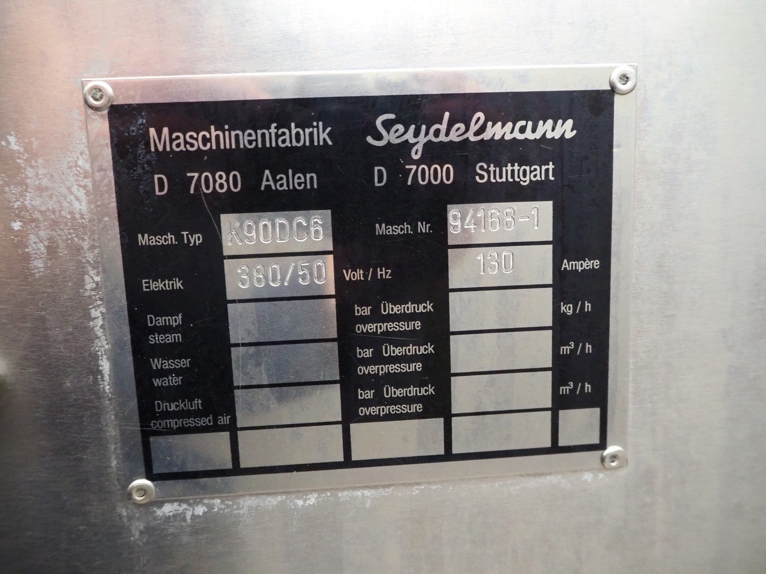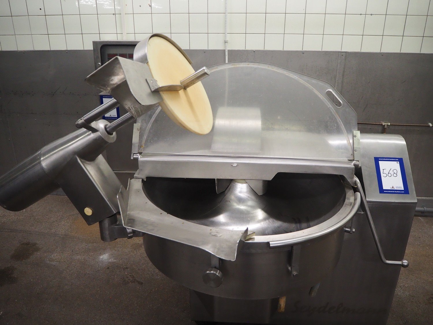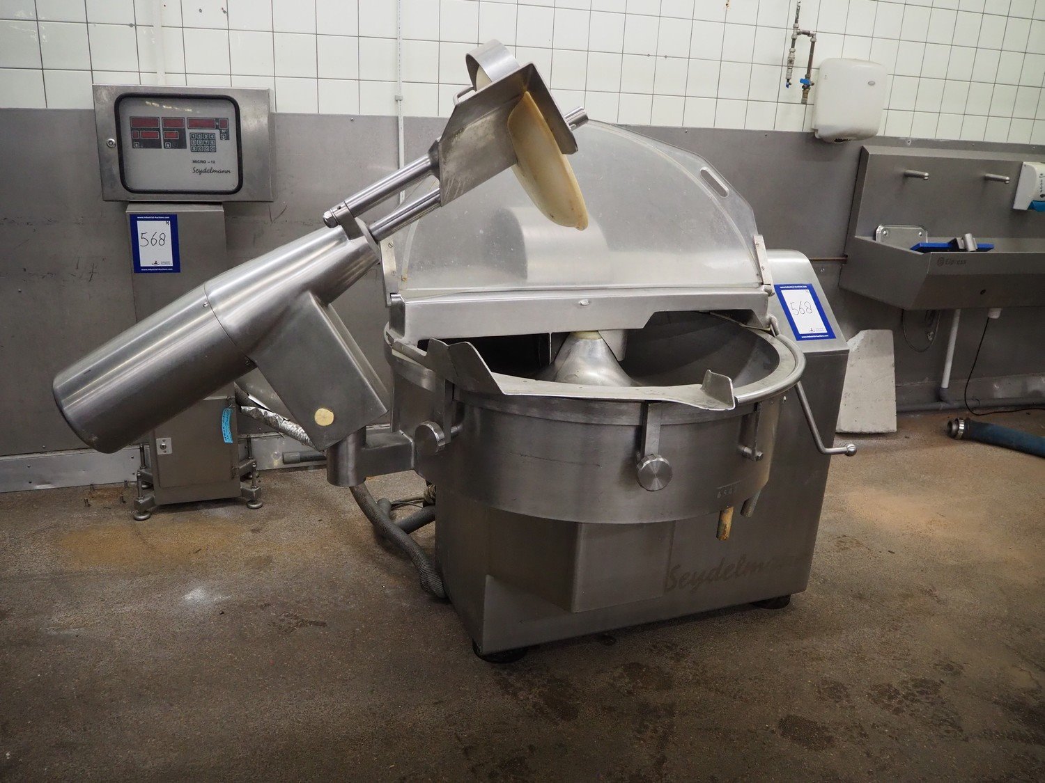 Seydelmann cutter, type: K90DC6, maschine number: 94168-1, 380 V, 50 Hz, 130 A, volume: 90 liter, s/s bowl, type control panel: Micro-12, dimensions: 1330 mm x 2050 mm x 1600 mm.
