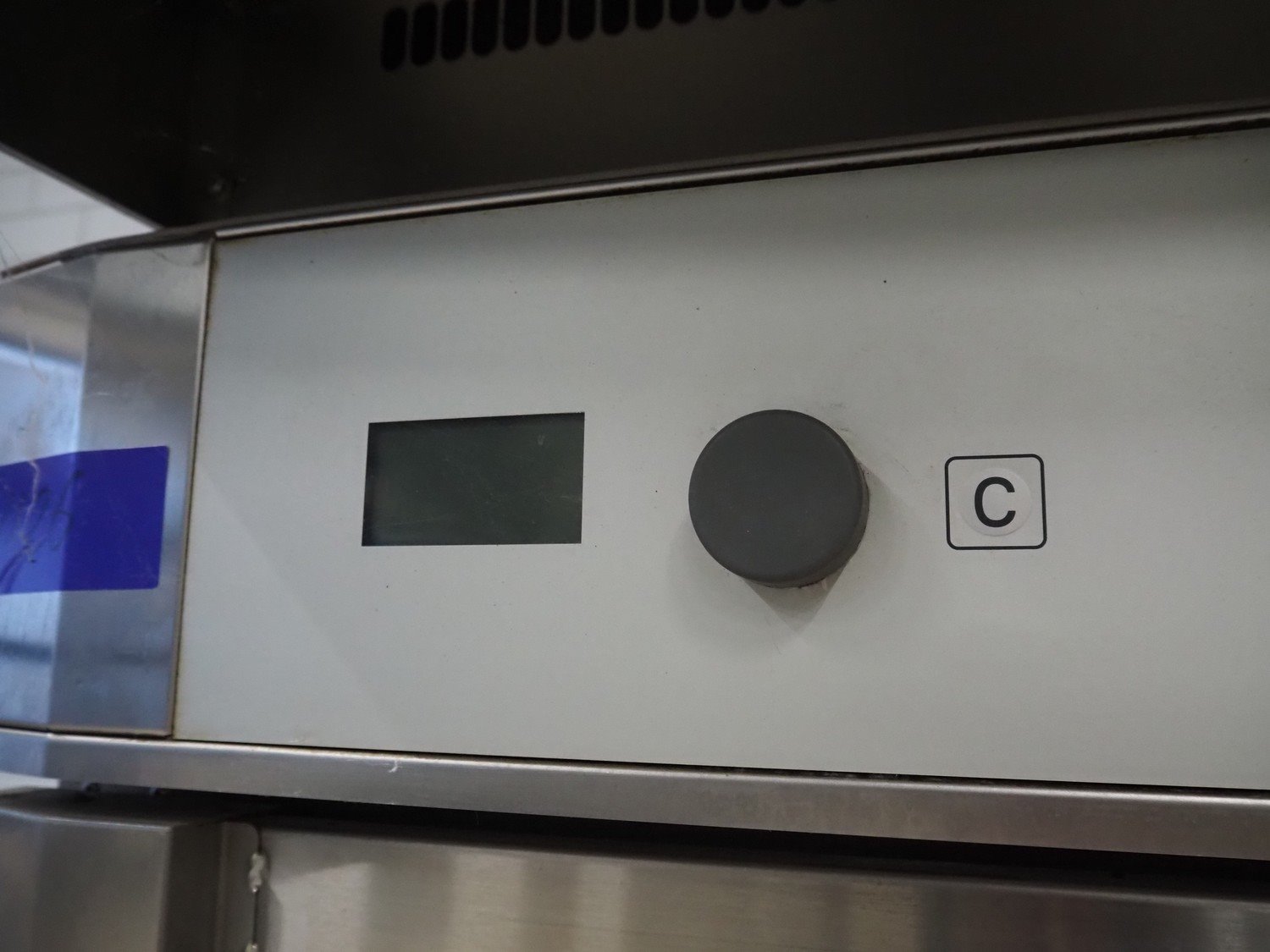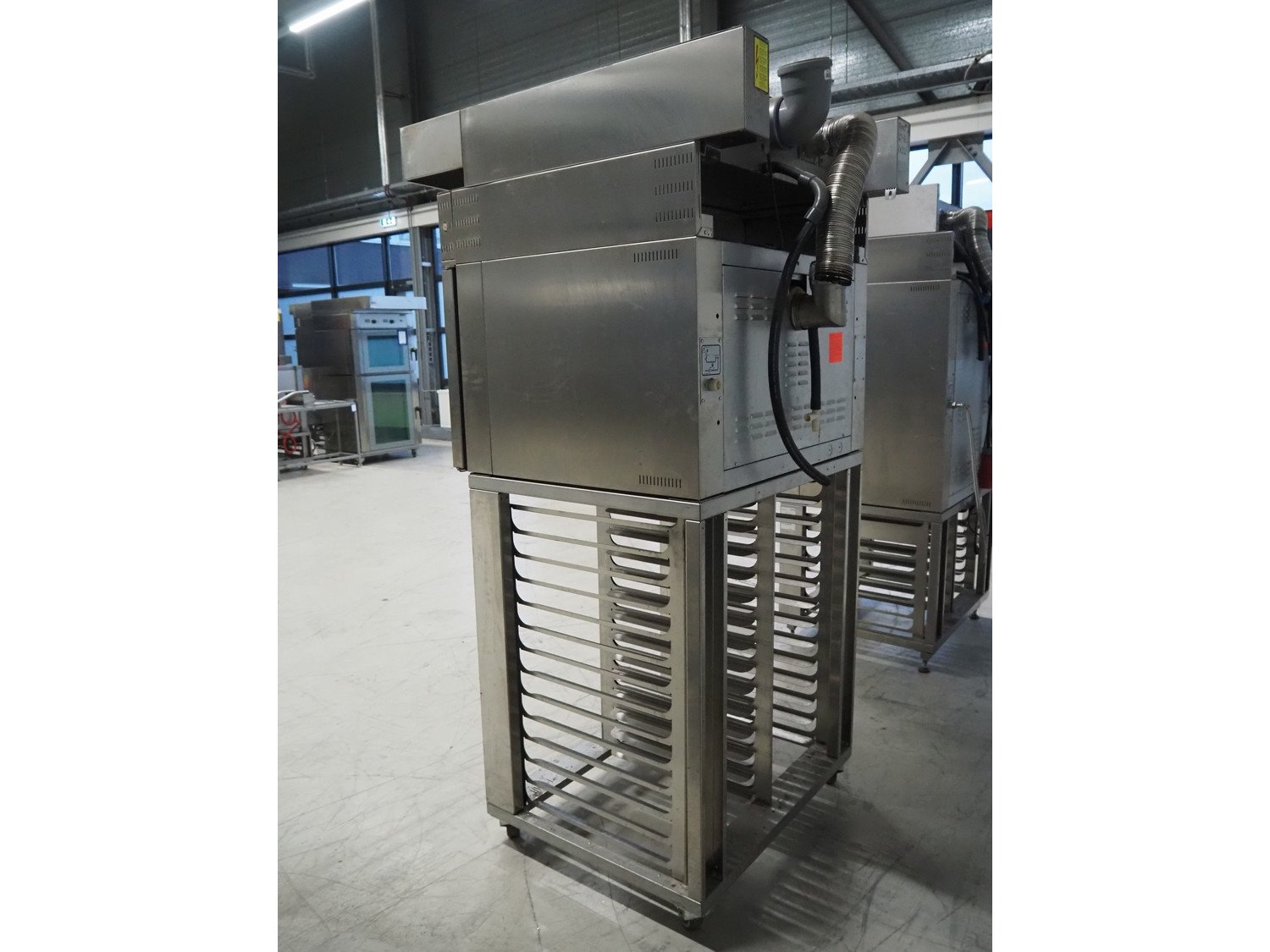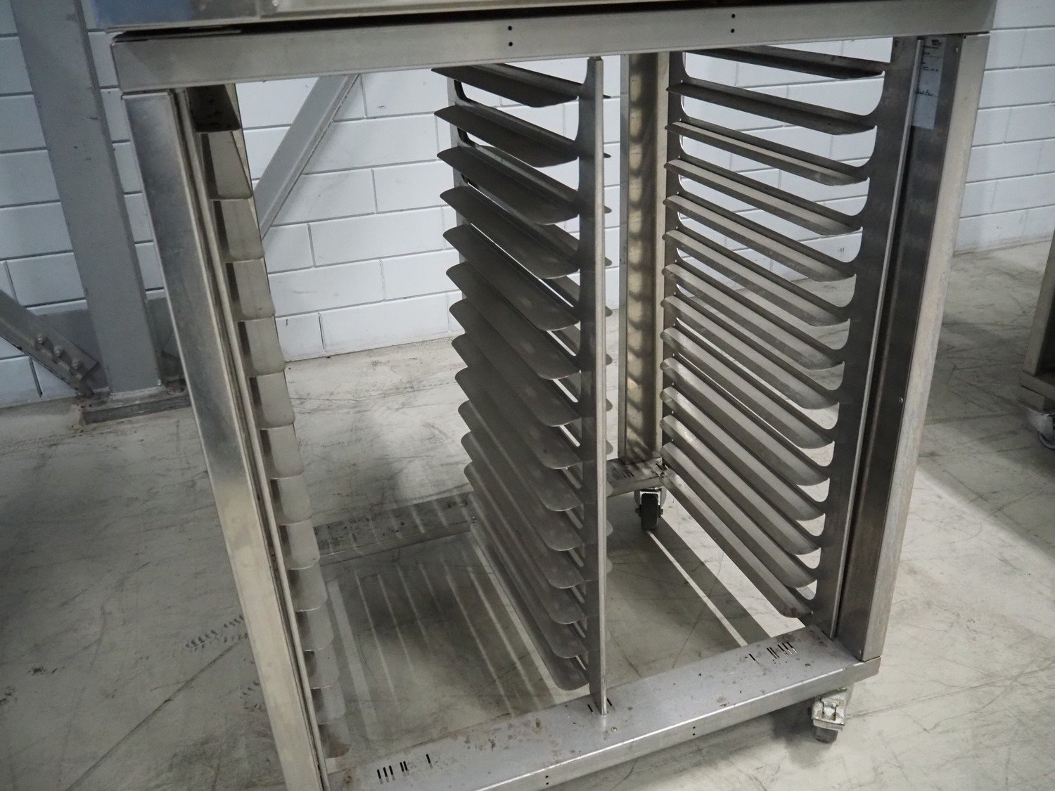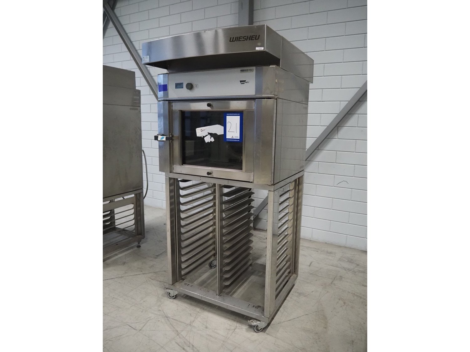 Wiesheu GmbH mobile oven, model: B04-EM, serial number: 10216374, year of construction: 09-2012, 400 V, 3 Ph, 50 Hz, 12.2 A, 8.4 kW, 5 floors, dimensions each floor: 610 mm x 400 mm, total dimensions: 1000 mm x 950 mm x 2070 mm. Missing glass.