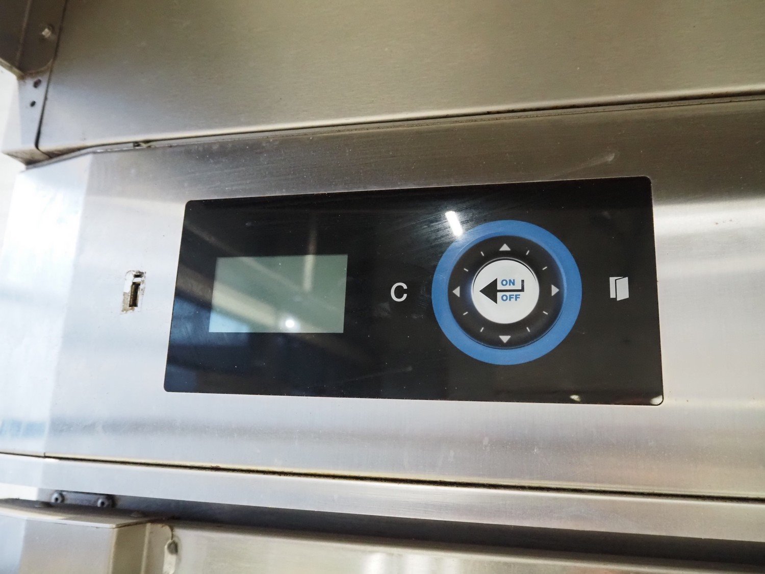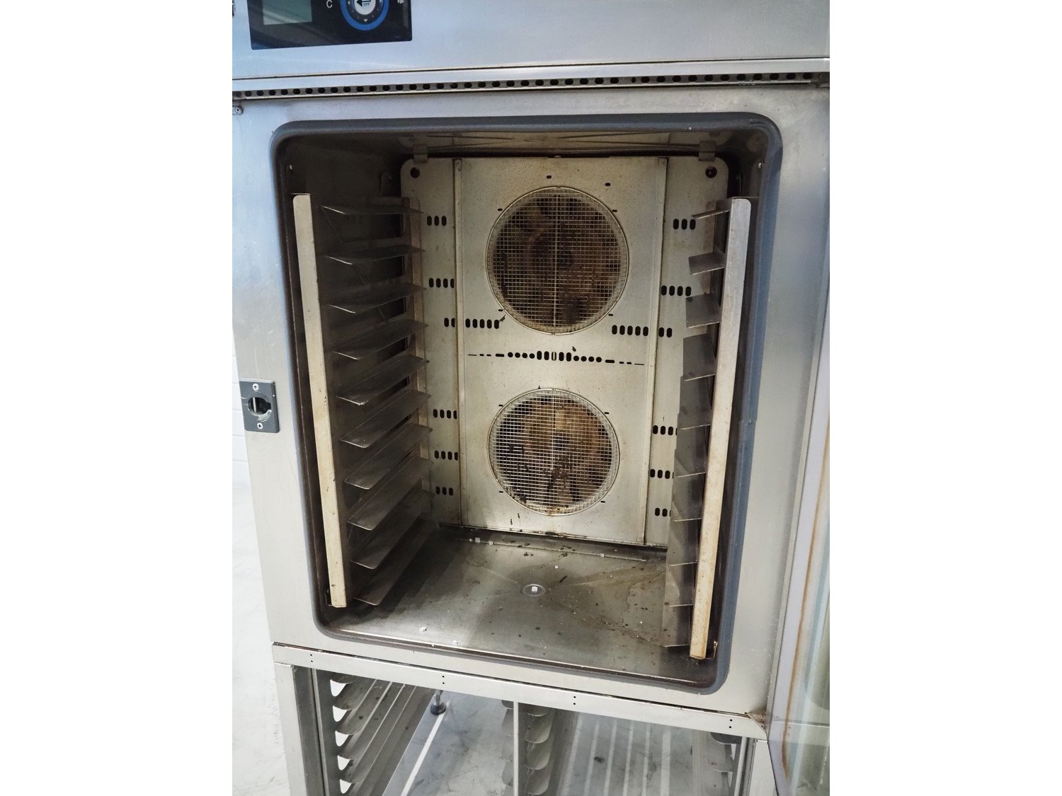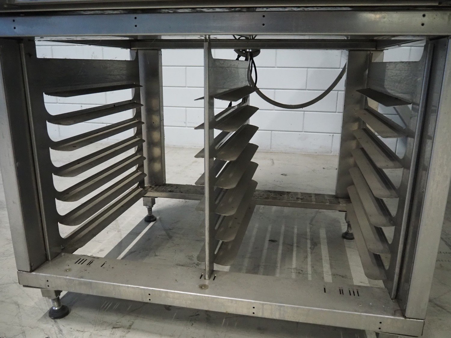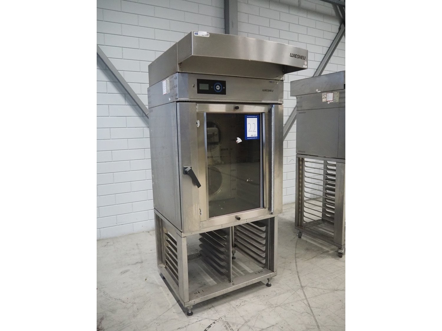 Wiesheu GmbH mobile oven, model: B08-EM, serial number: 10328764, year of construction: 02-2016, 400 V, 3 Ph, 50 Hz, 17.4 A, 12.5 kW, 10 floors, dimensions each floor: 610 mm x 400 mm, total dimensions: 1000 mm x 1250 mm x 2070 mm. Glass broken.