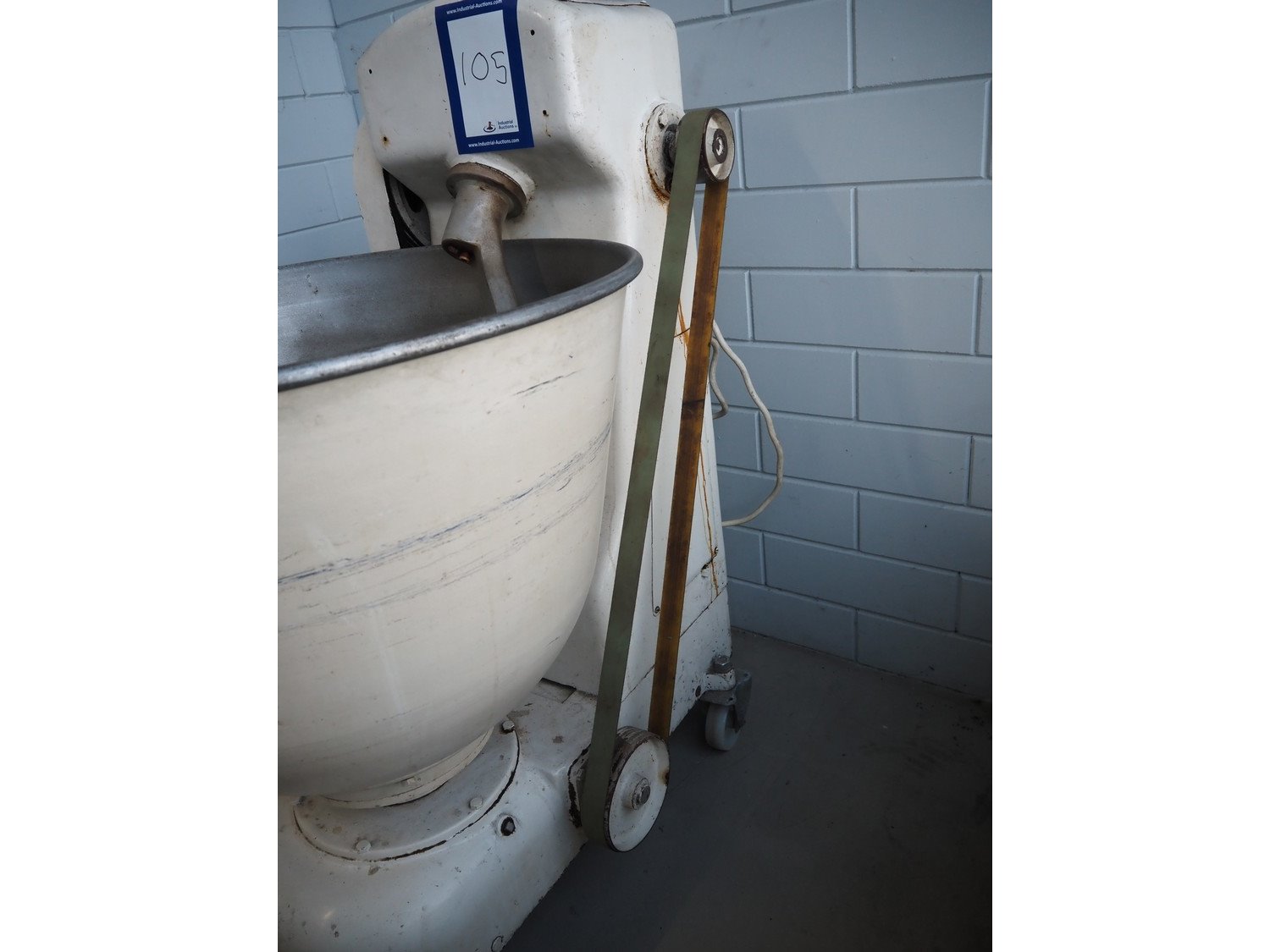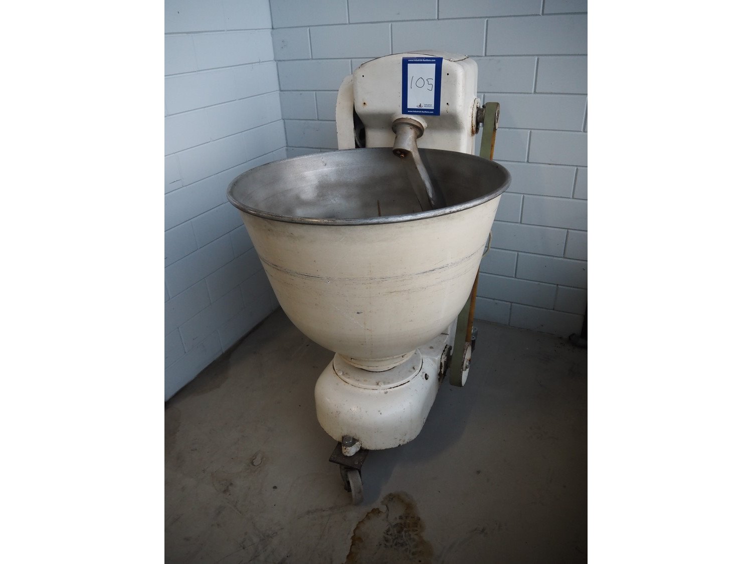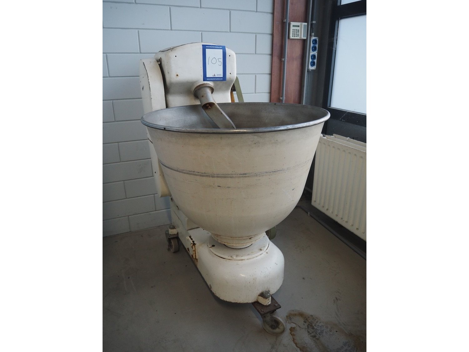Mobile mixer, steel bowl, dimensions bowl: Ø 830 mm x 620 mm, total dimensions: 1200 mm x 870 mm x 1400 mm. Missing cover.