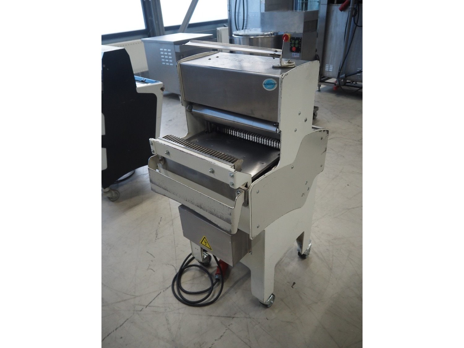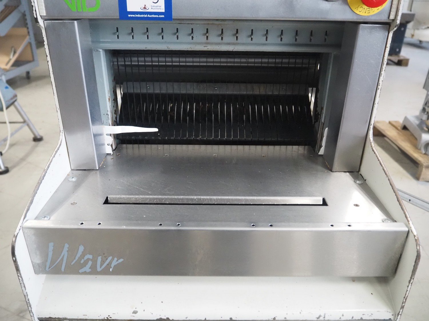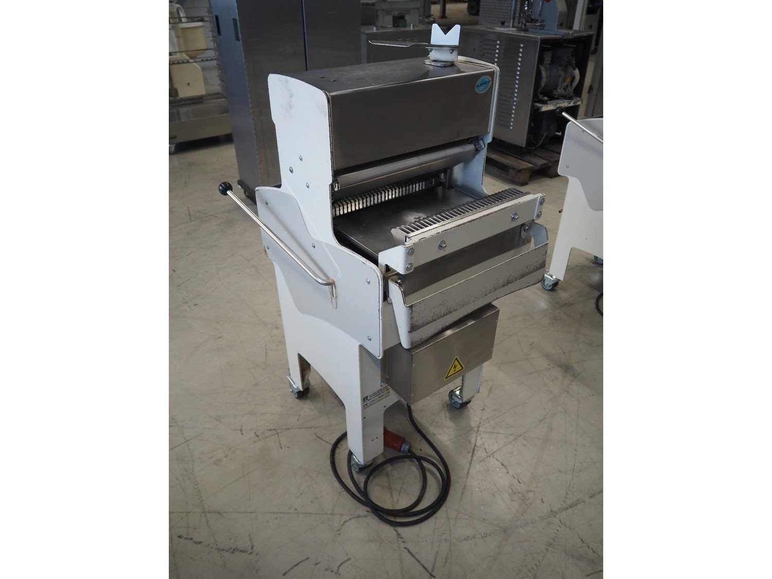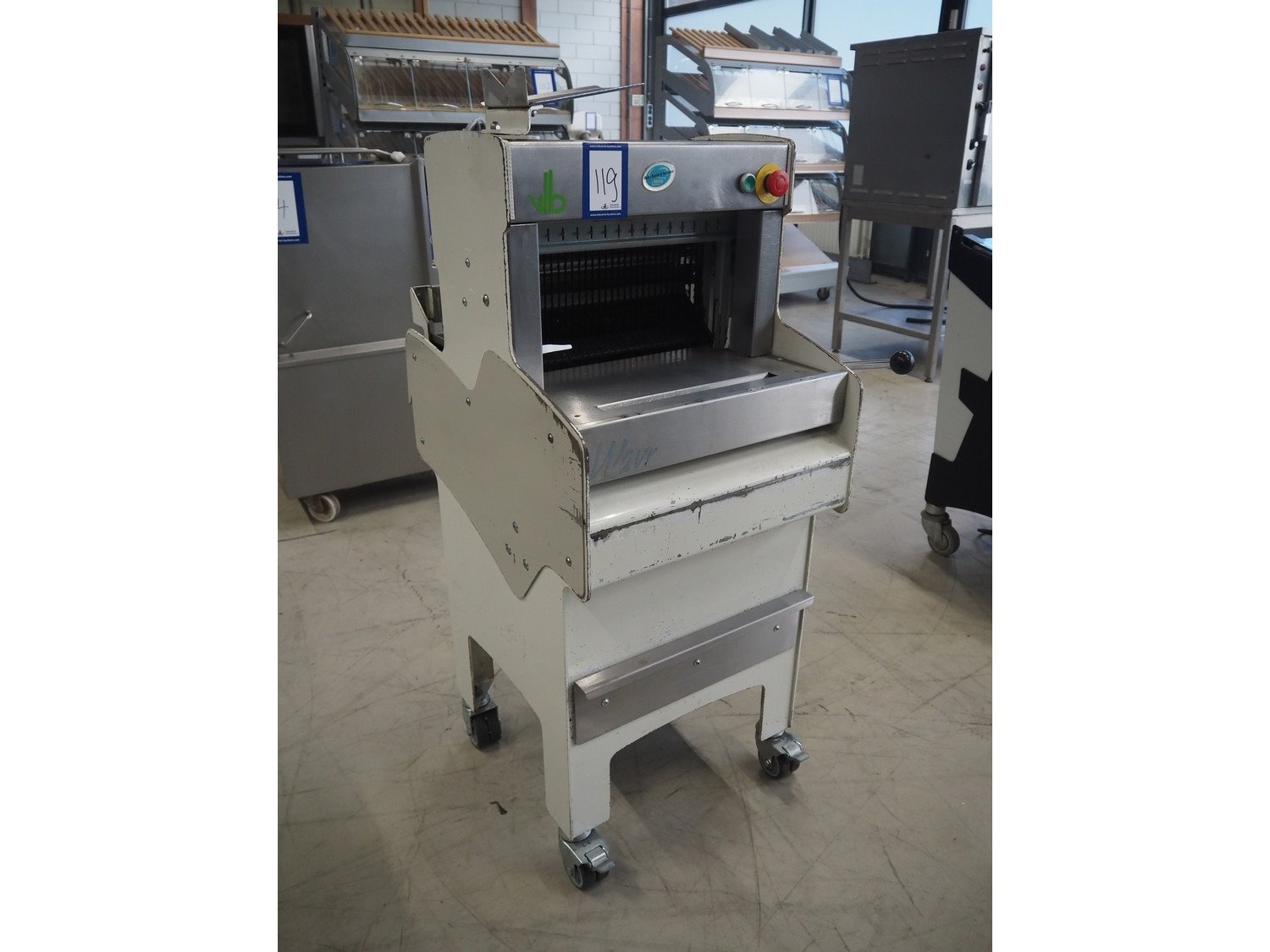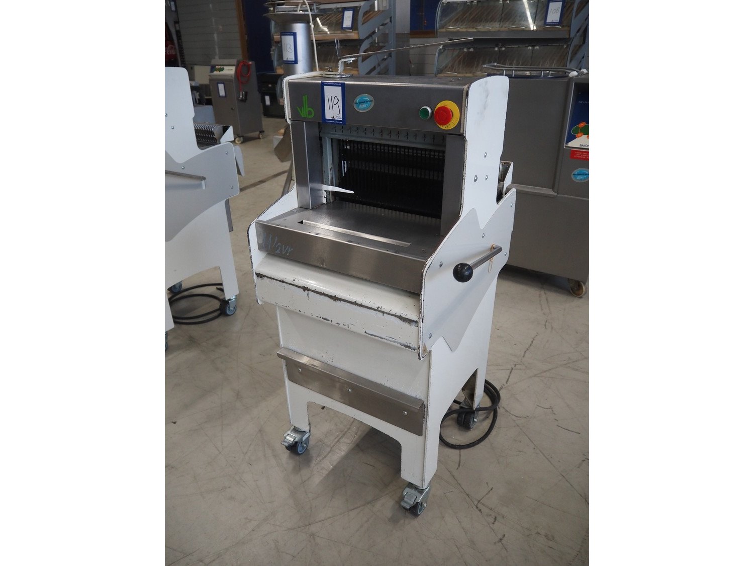 VLB mobile bread slicer, type: A Wave, number: 5506, year of construction: 2005, 230/400 V, 50 Hz, 0.56 kW, 30 knives, distance between knives: 10 mm, total dimensions: 750 mm x 630 mm x 1280 mm.