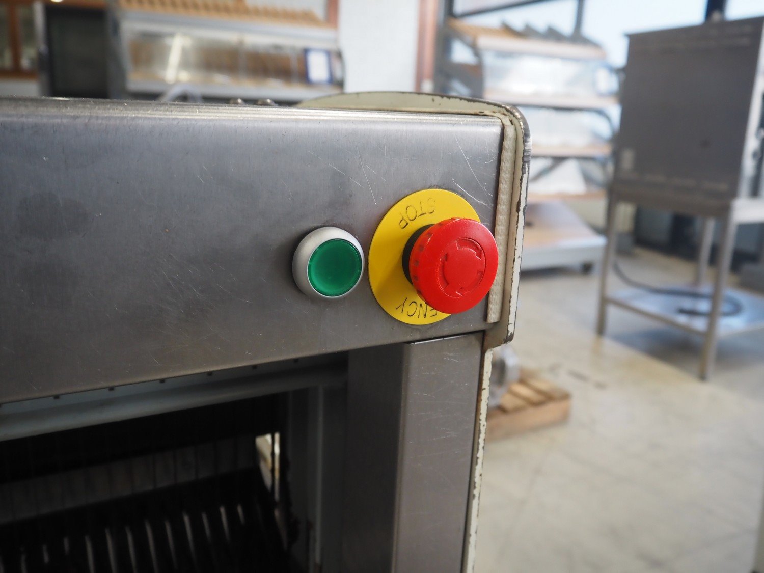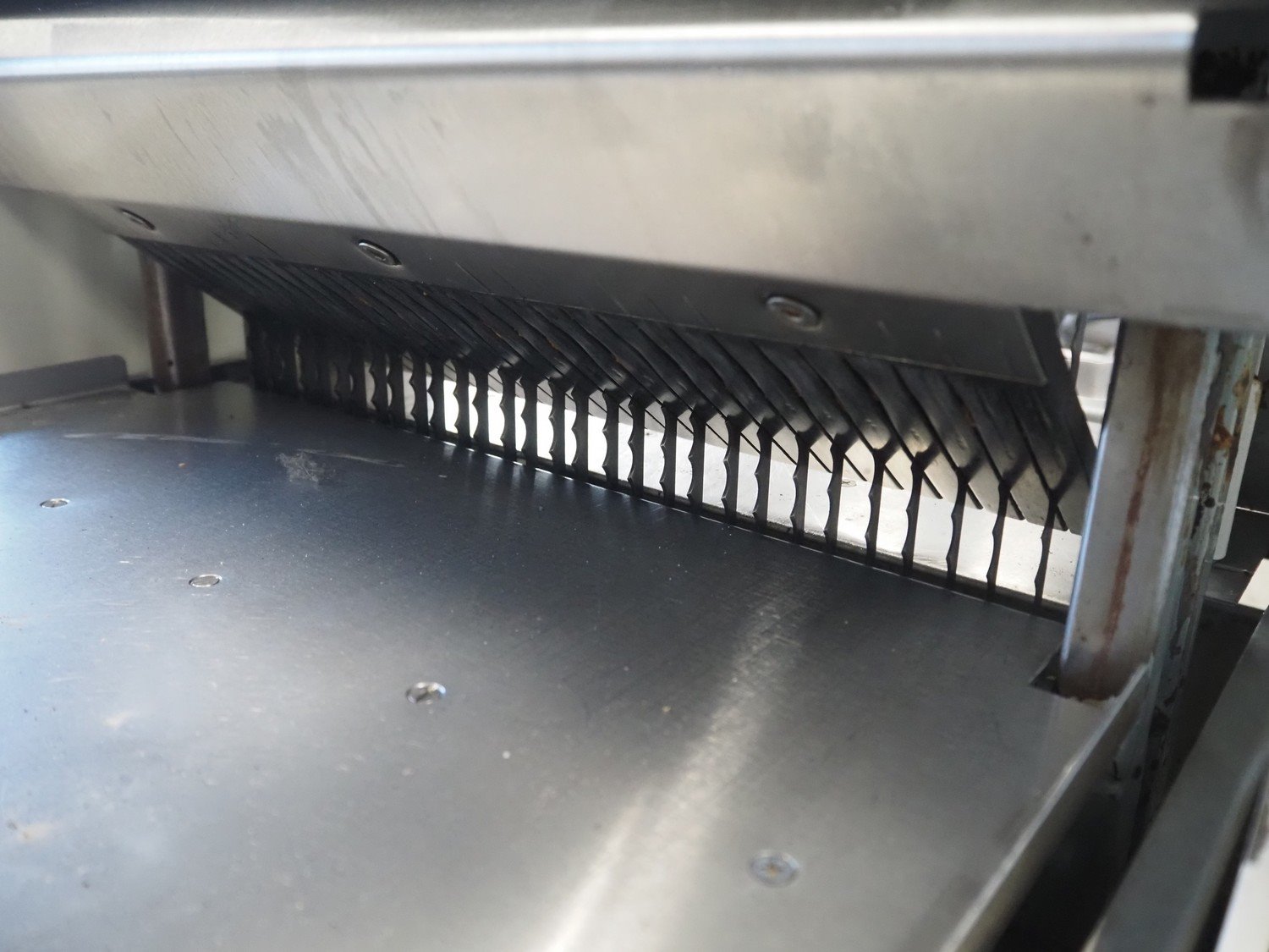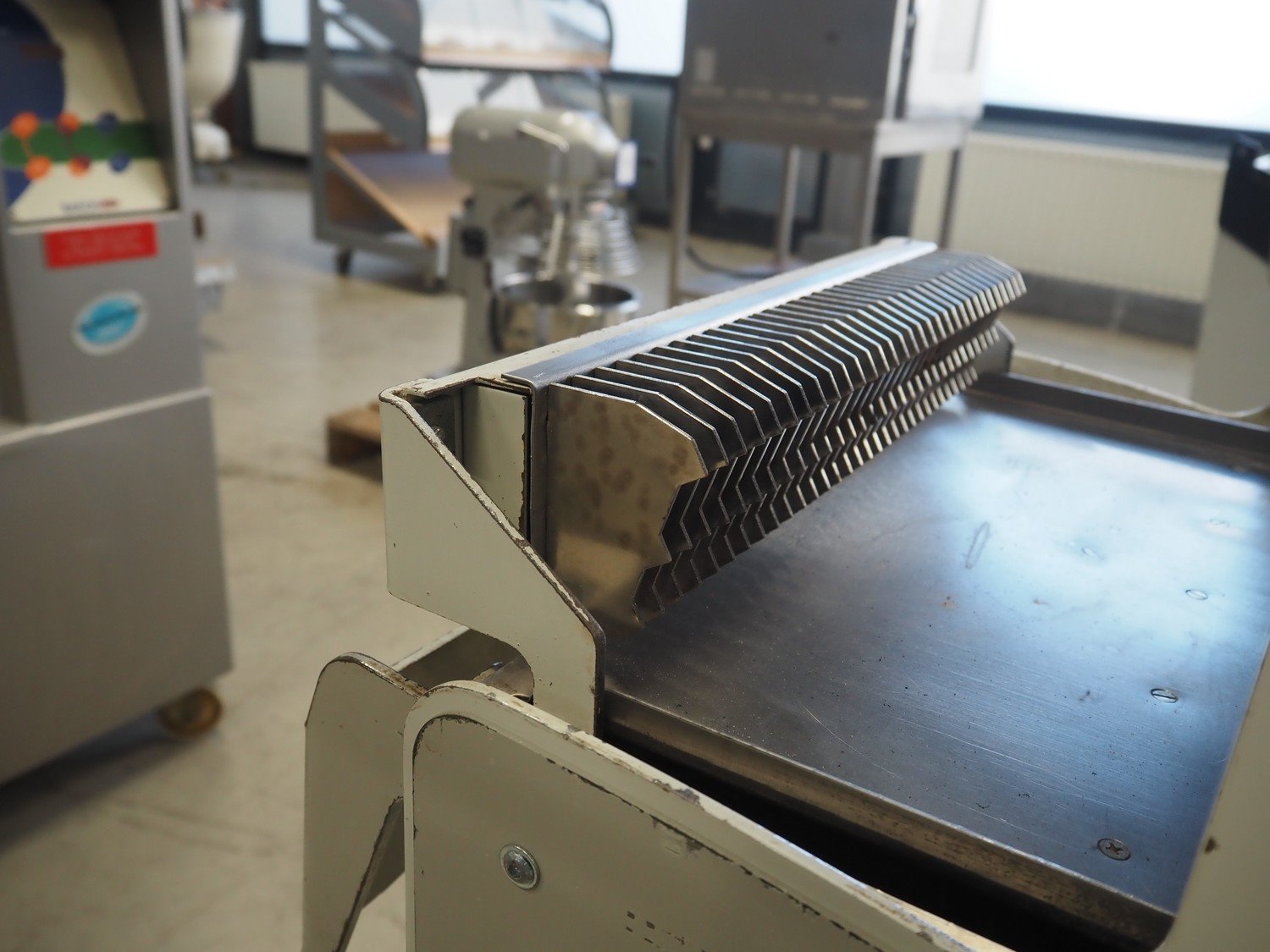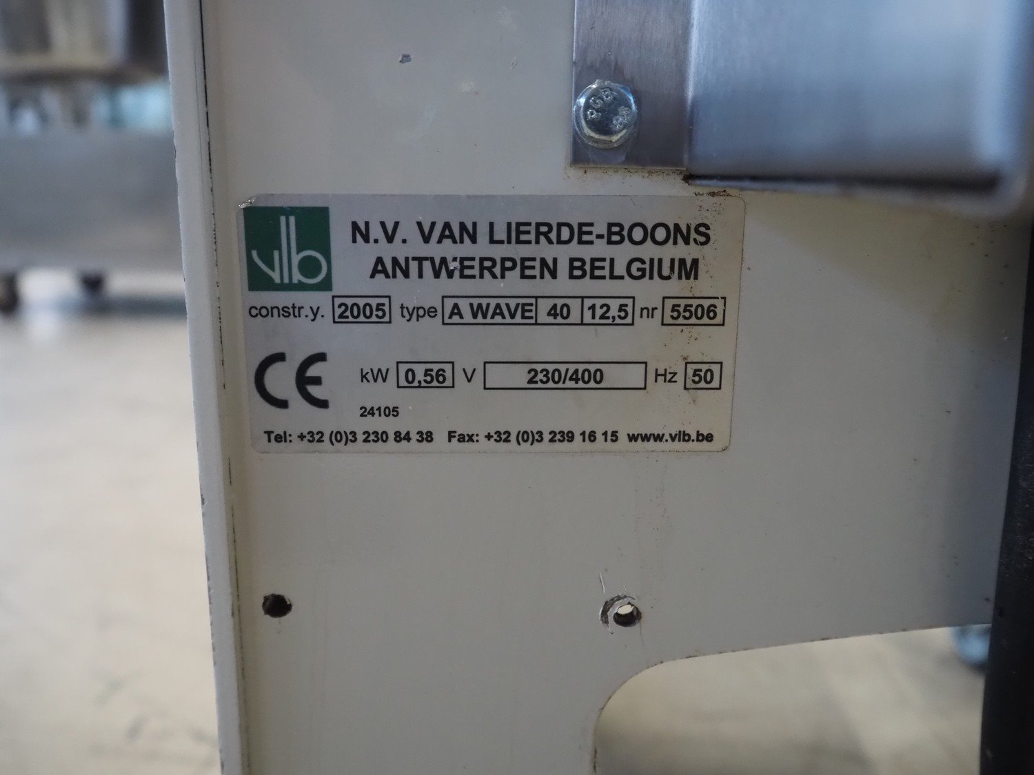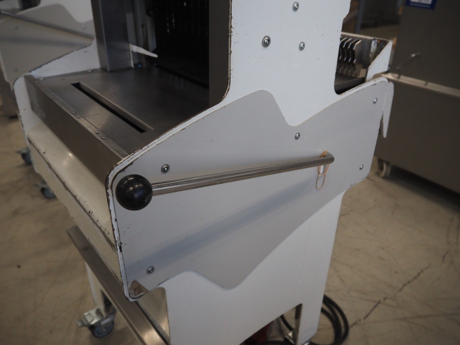 VLB mobile bread slicer, type: A Wave, number: 5506, year of construction: 2005, 230/400 V, 50 Hz, 0.56 kW, 30 knives, distance between knives: 10 mm, total dimensions: 750 mm x 630 mm x 1280 mm.