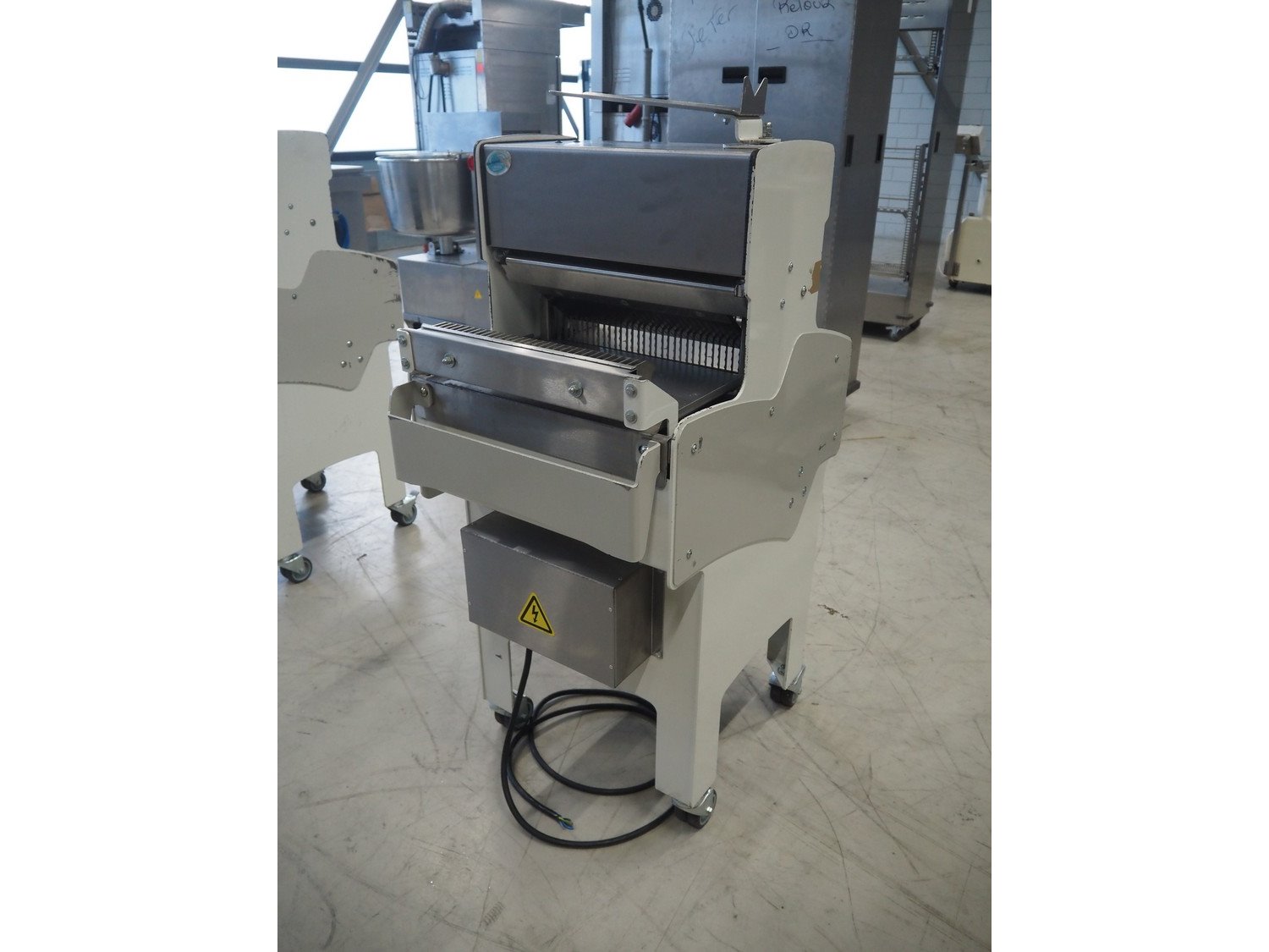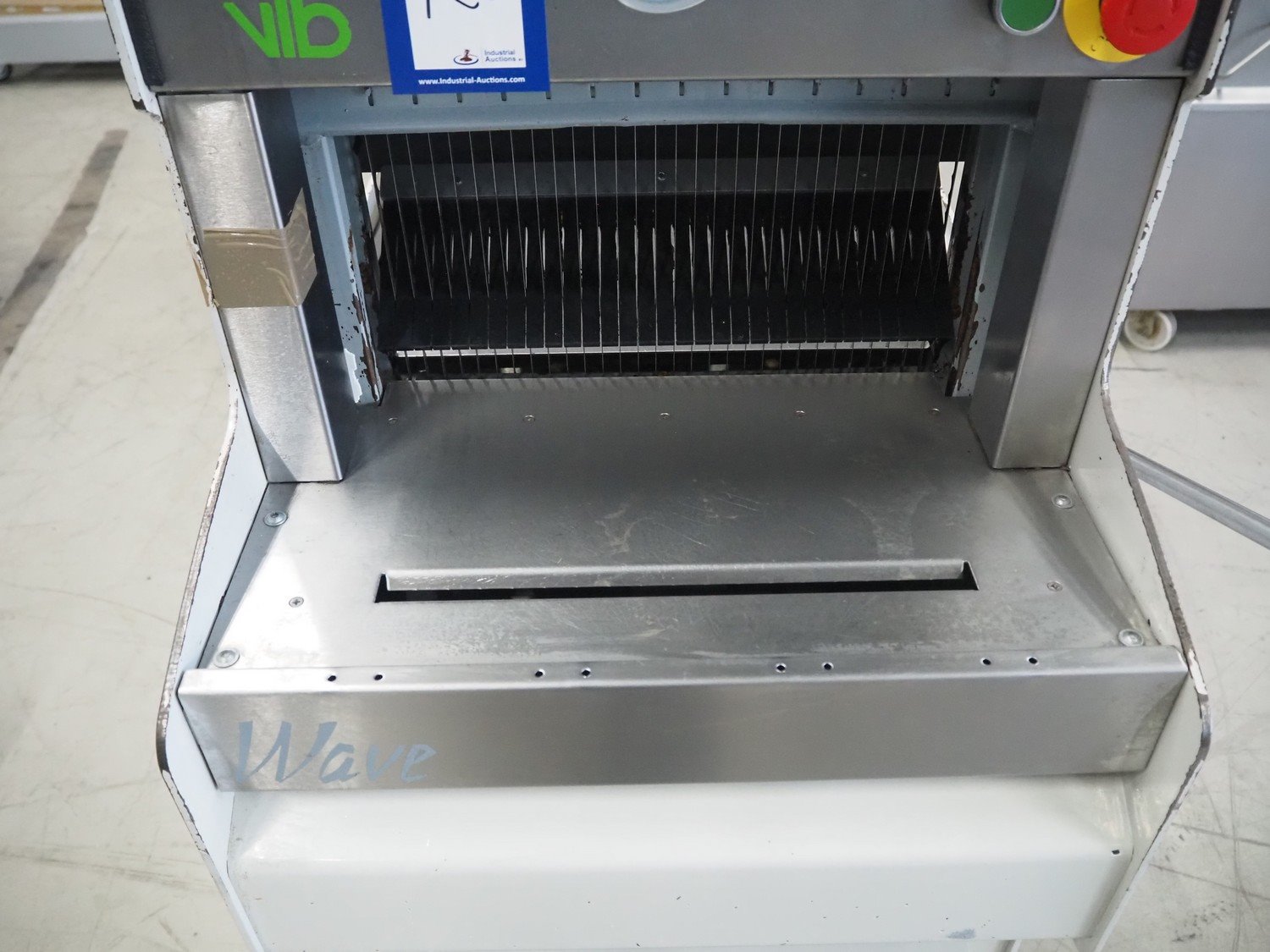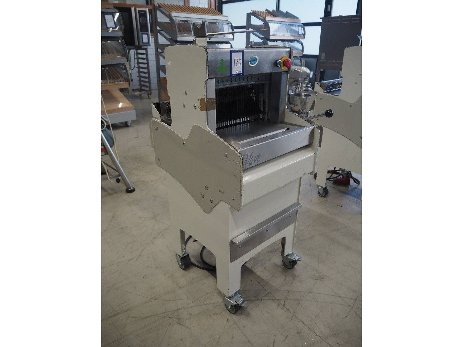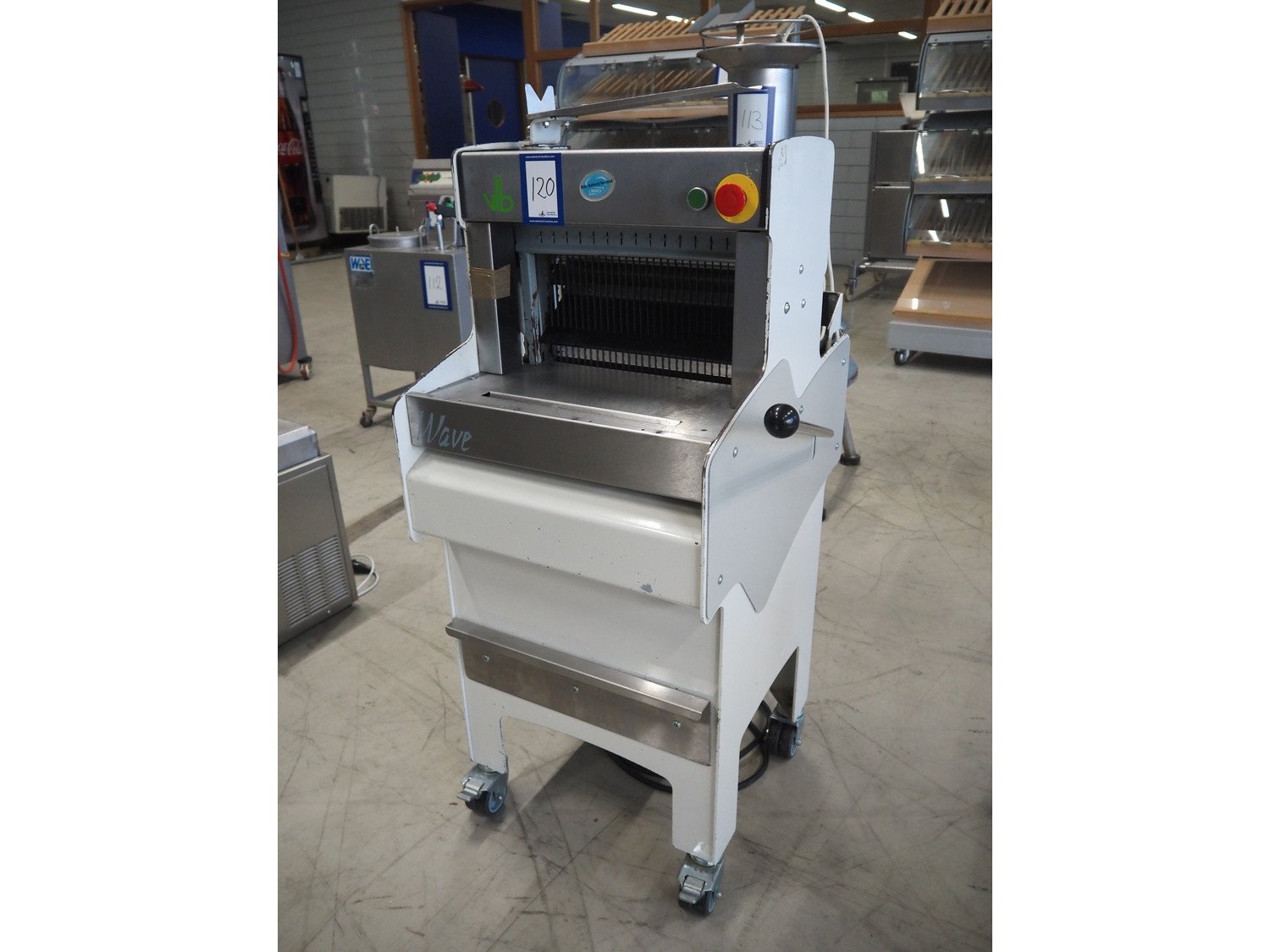 VLB mobile bread slicer, type: A Wave, number: 5800, year of construction: 2006, 230/400 V, 50 Hz, 0.56 kW, 30 knives, distance between knives: 10 mm, total dimensions: 750 mm x 630 mm x 1280 mm.