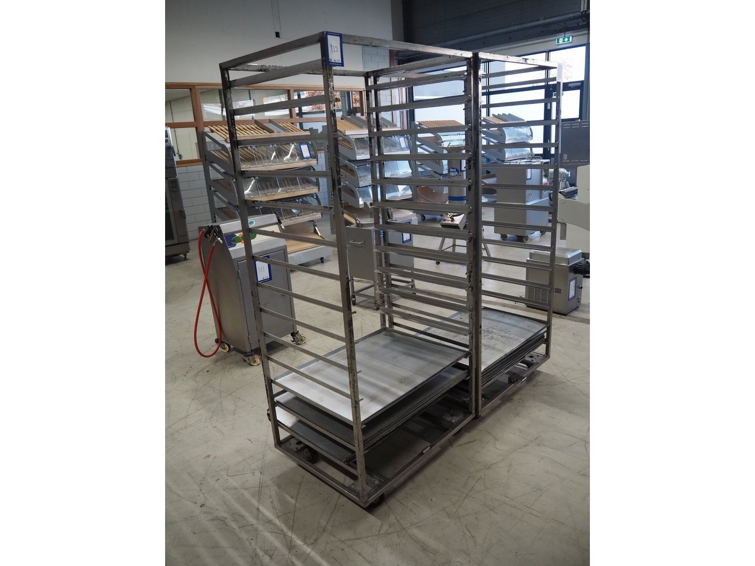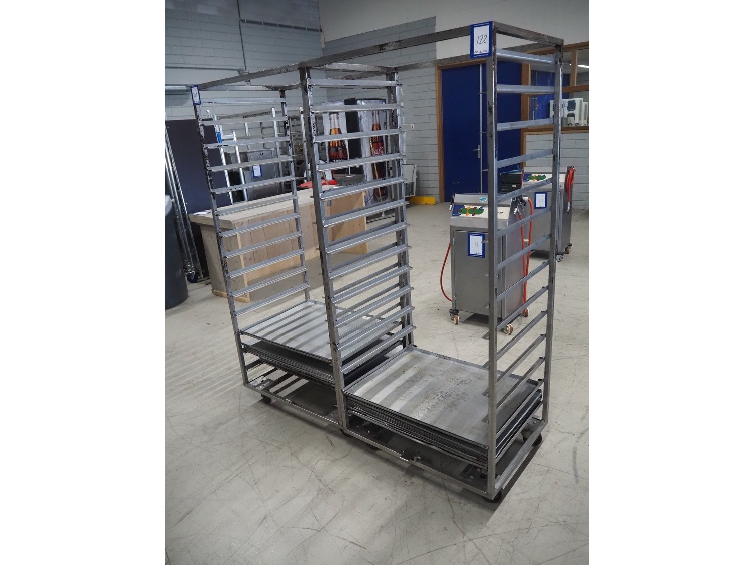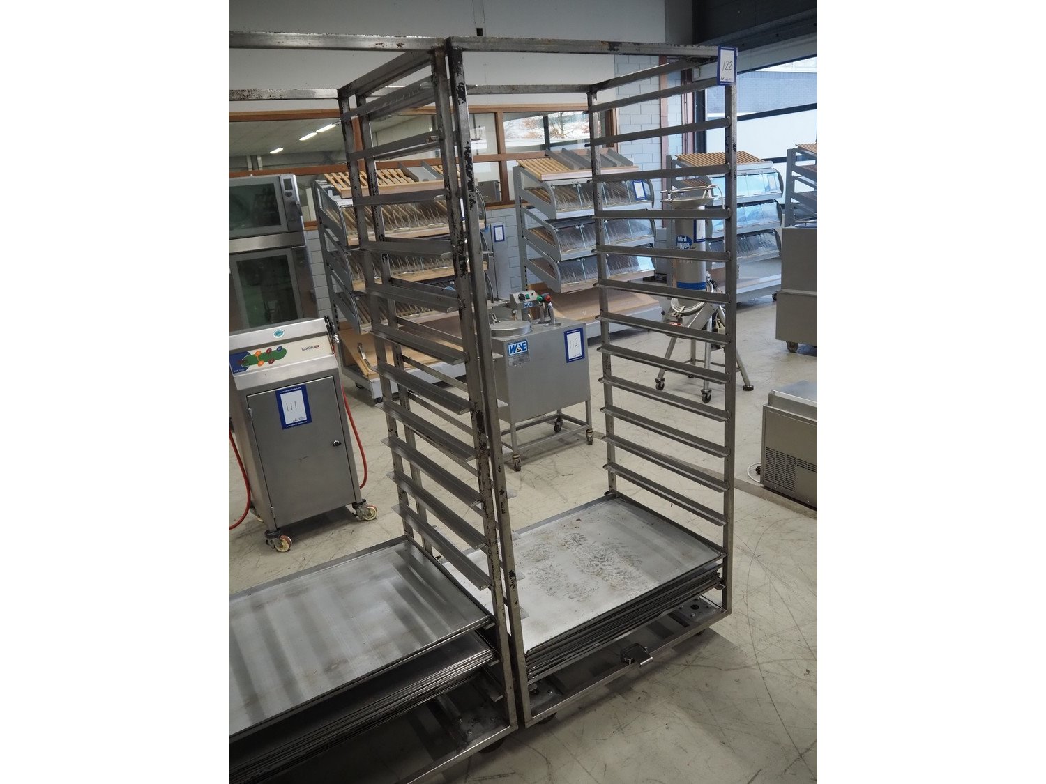 2 s/s trolleys, 14 floors each, floor dimensions: 810 mm x 630 mm, total dimensions: (2x) 870 mm x 650 mm x 1940 mm.