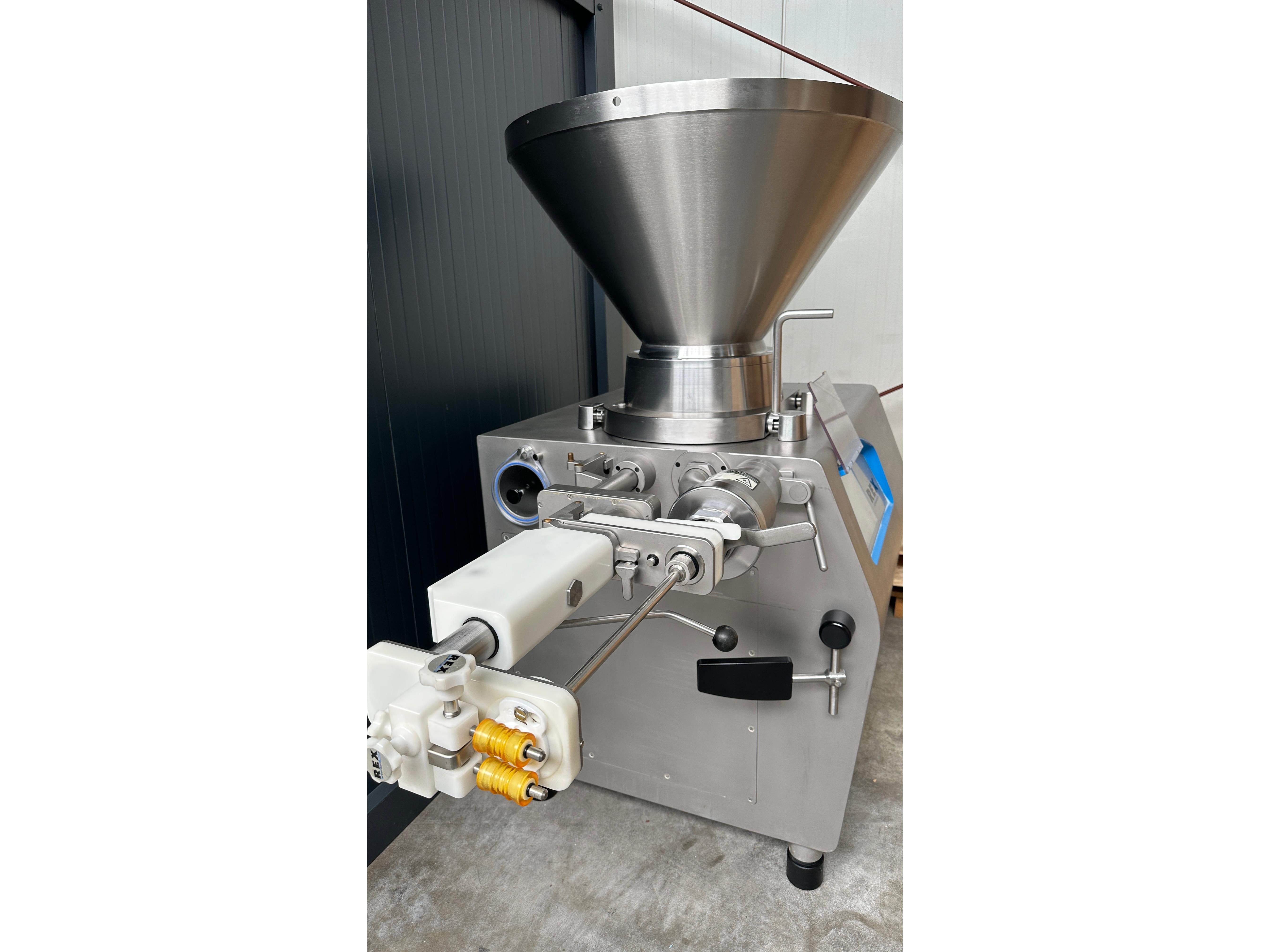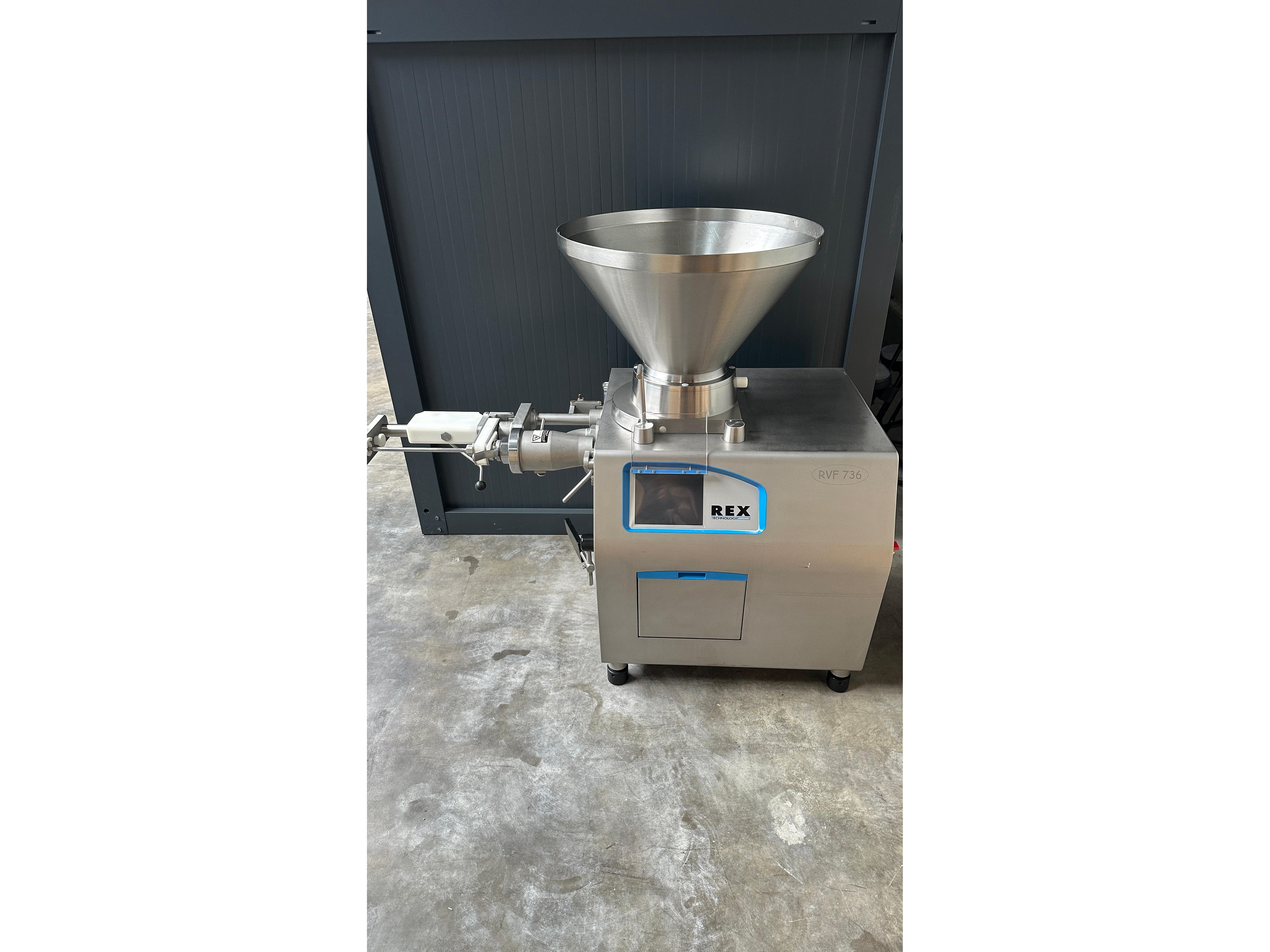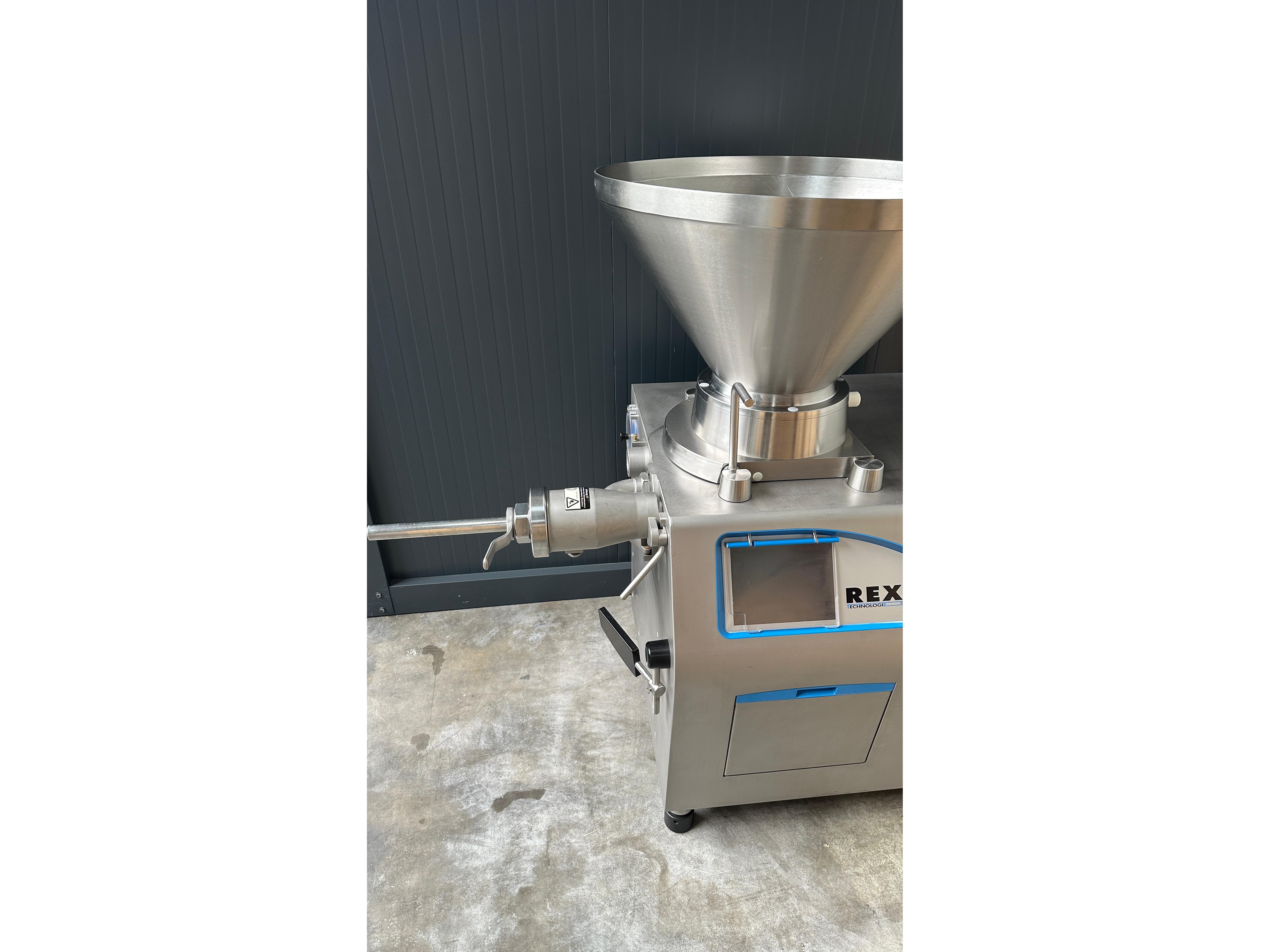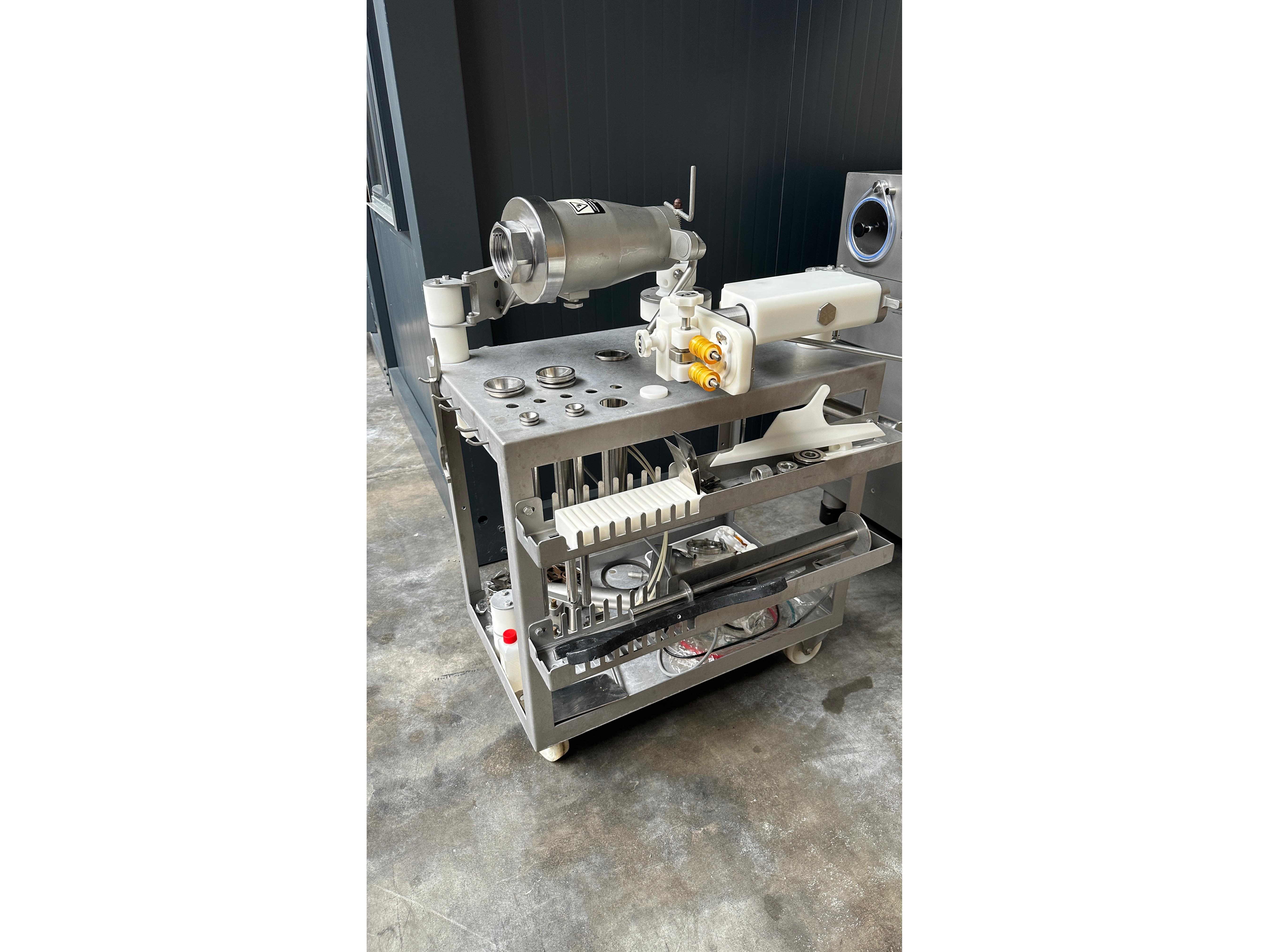 Rex vacuum filling machine, type: RVF 736, machine number: 7361060529, 400 V, 3 Ph, 50 Hz, 15 kW, dimensions: 1130 mm x 1020 mm x 1790 mm. Including s/s tool trolley and pallet with various parts, among others: Complete filling grinder with grinder, offset gearbox and turning gearbox.