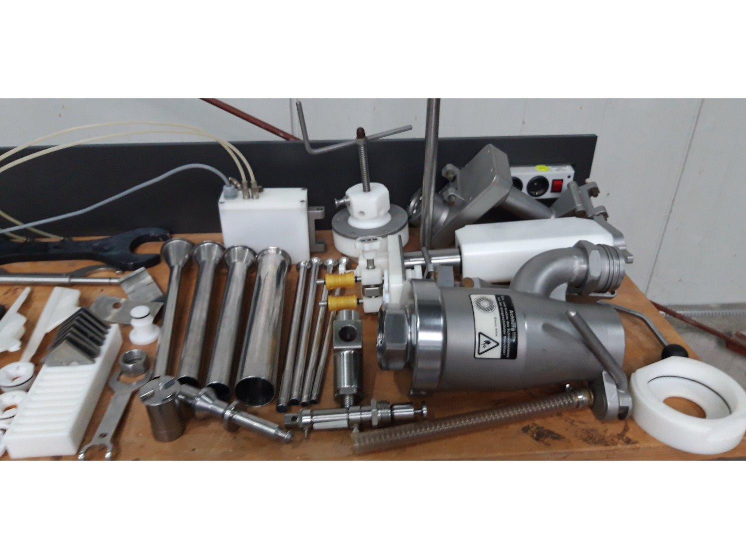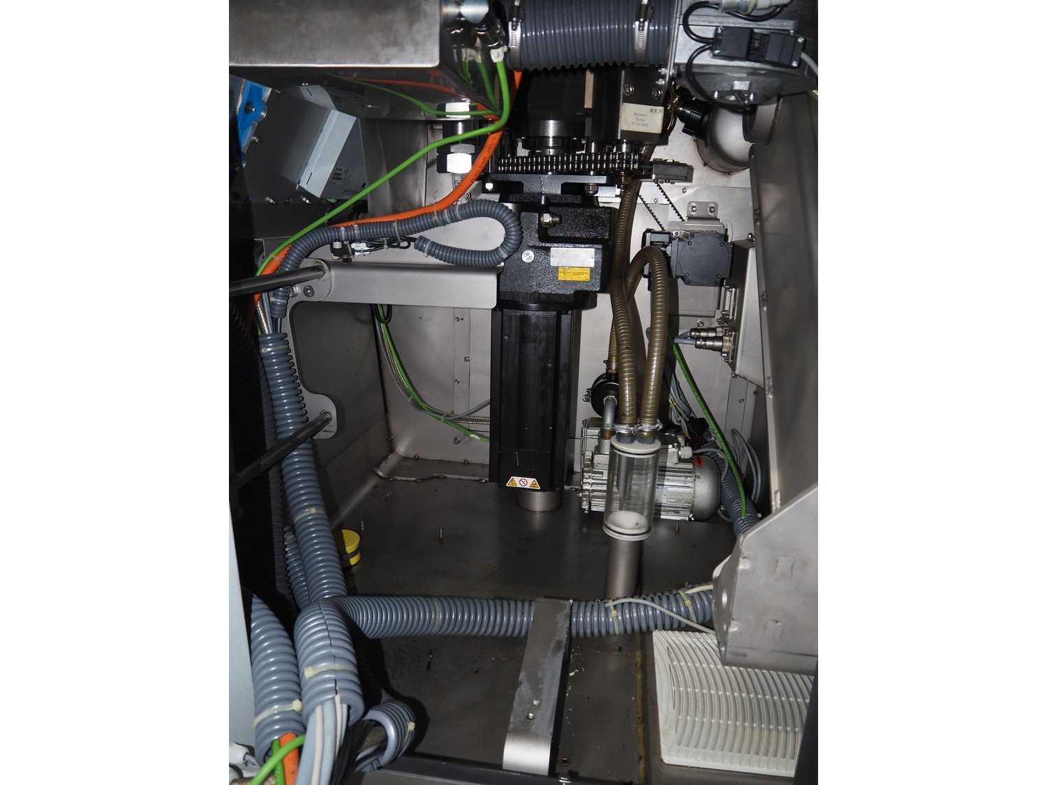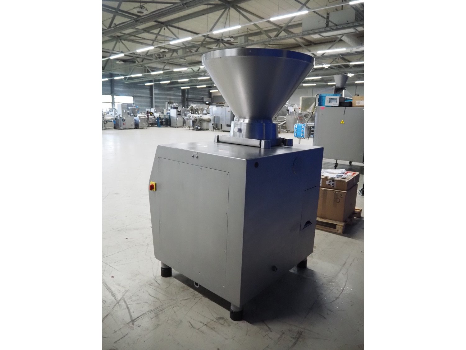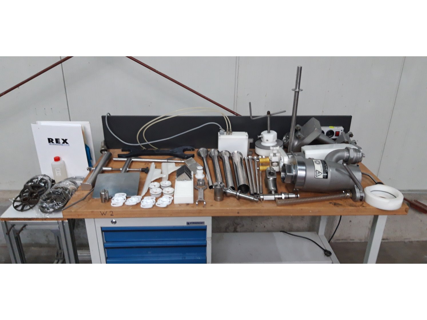 Rex vacuum filling machine, type: RVF 736, machine number: 7361060529, 400 V, 3 Ph, 50 Hz, 15 kW, dimensions: 1130 mm x 1020 mm x 1790 mm. Including s/s tool trolley and pallet with various parts, among others: Complete filling grinder with grinder, offset gearbox and turning gearbox.