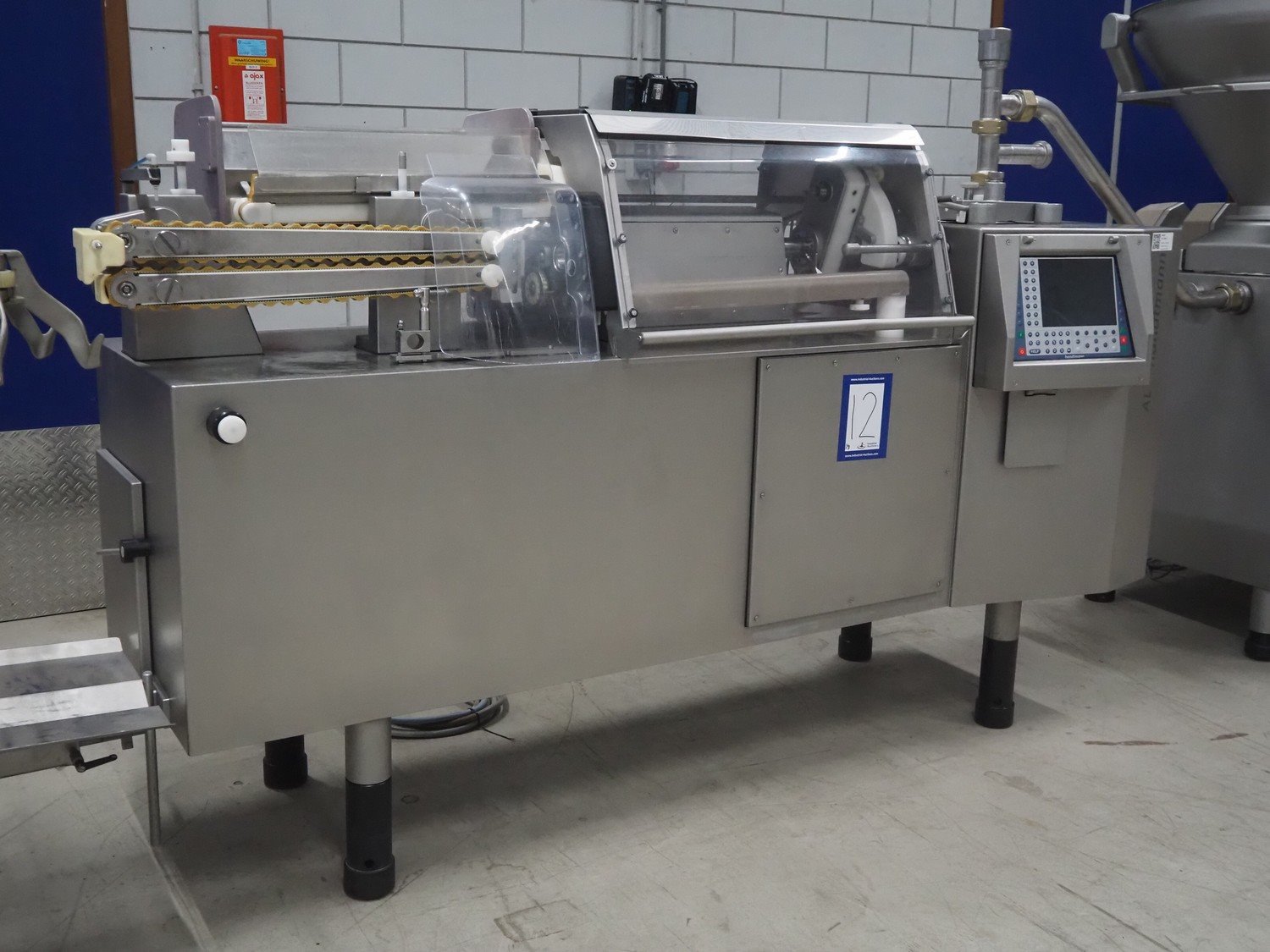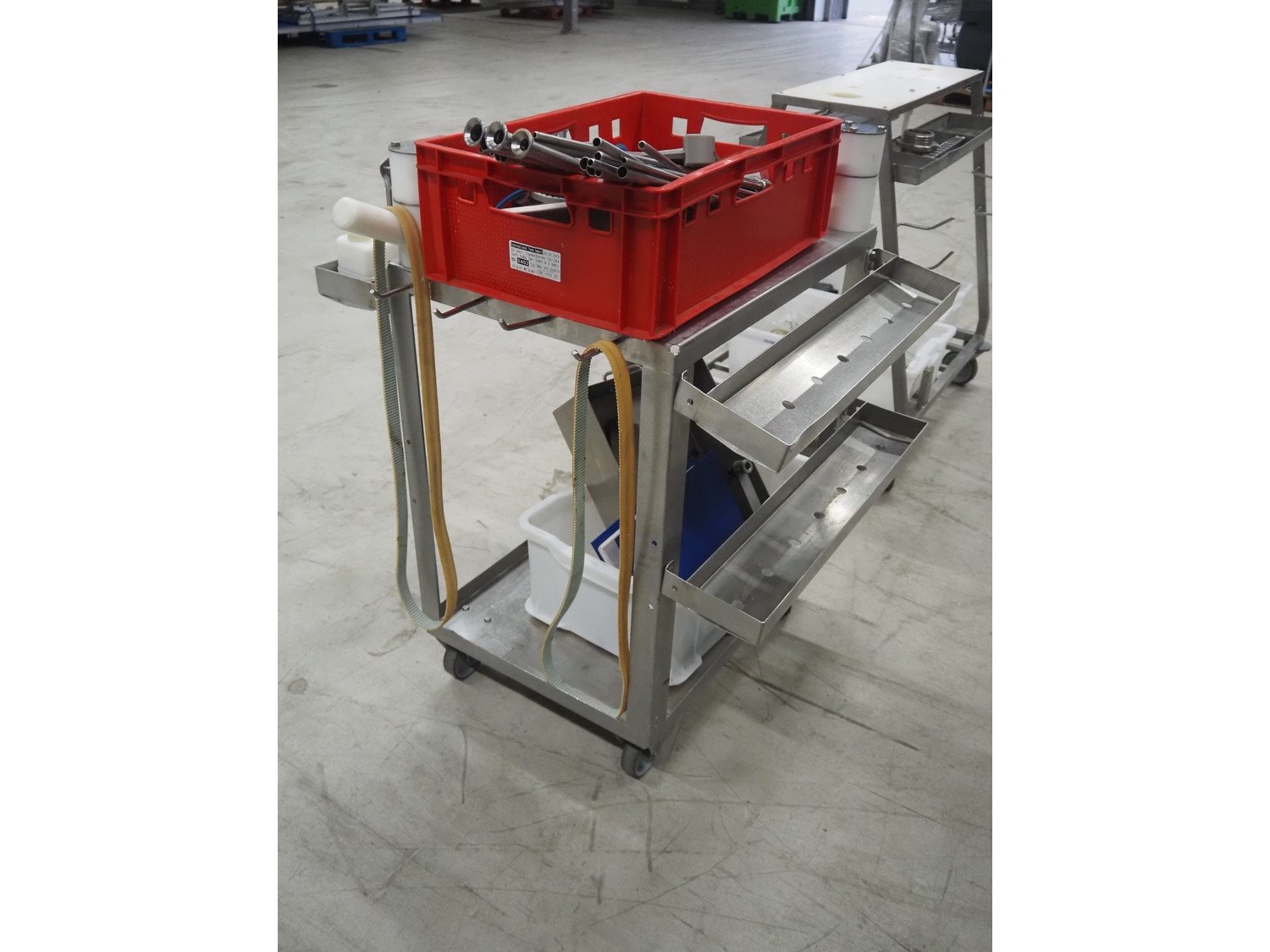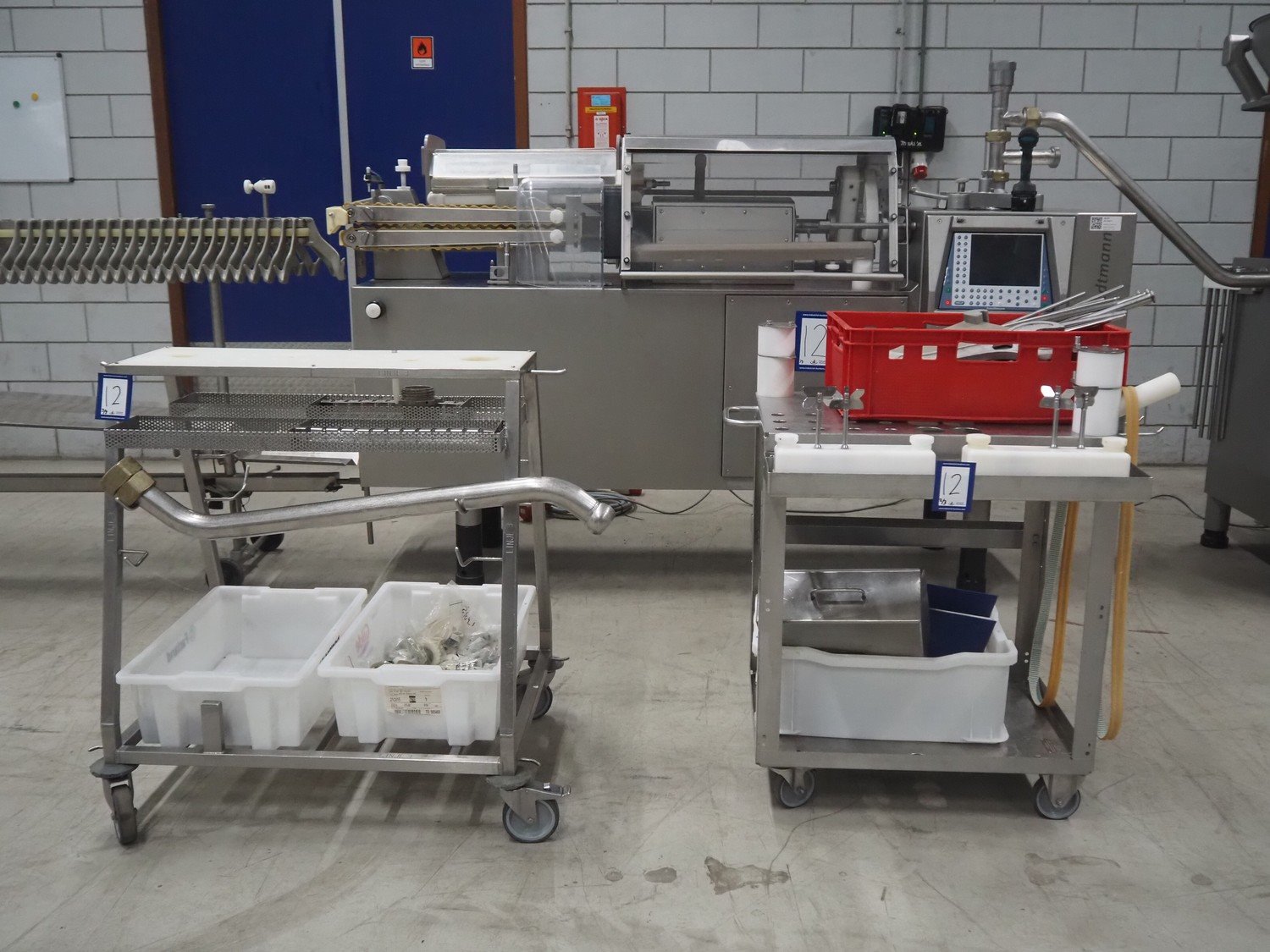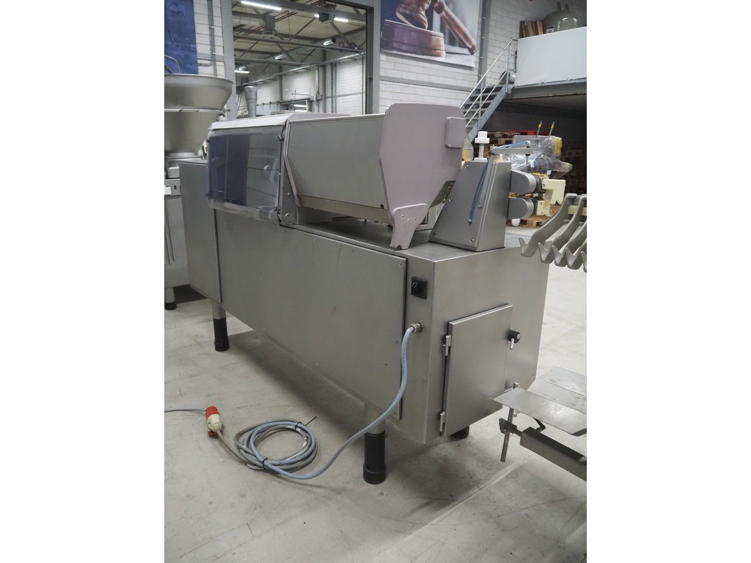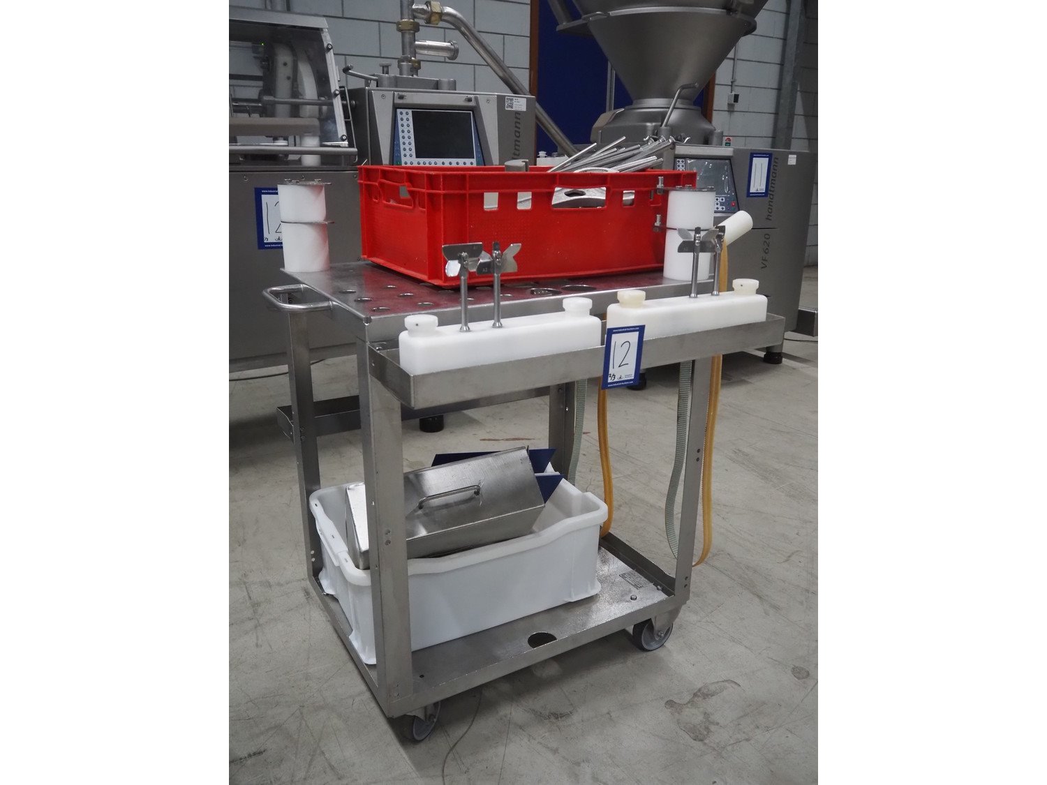 Handtmann mobile portioning and linking machine, type: 242-01, number: 501, year of construction: 2004, 400 V, 3 Ph, 50 Hz, 15 A, 10 kW, dimensions: 2600 mm x 880 mm x 1780 mm. Including 2 tool trolleys, dimensions trolleys: 1050 mm x 750 mm x 1000 mm and 900 mm x 860 mm x 880 mm.