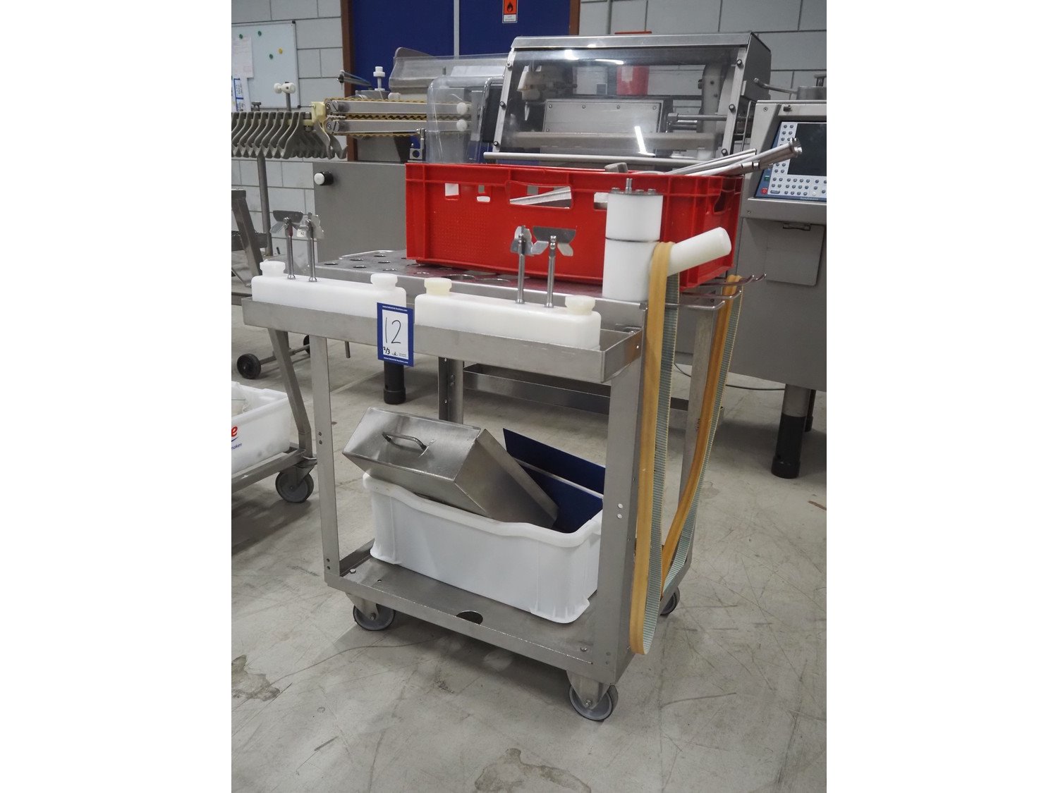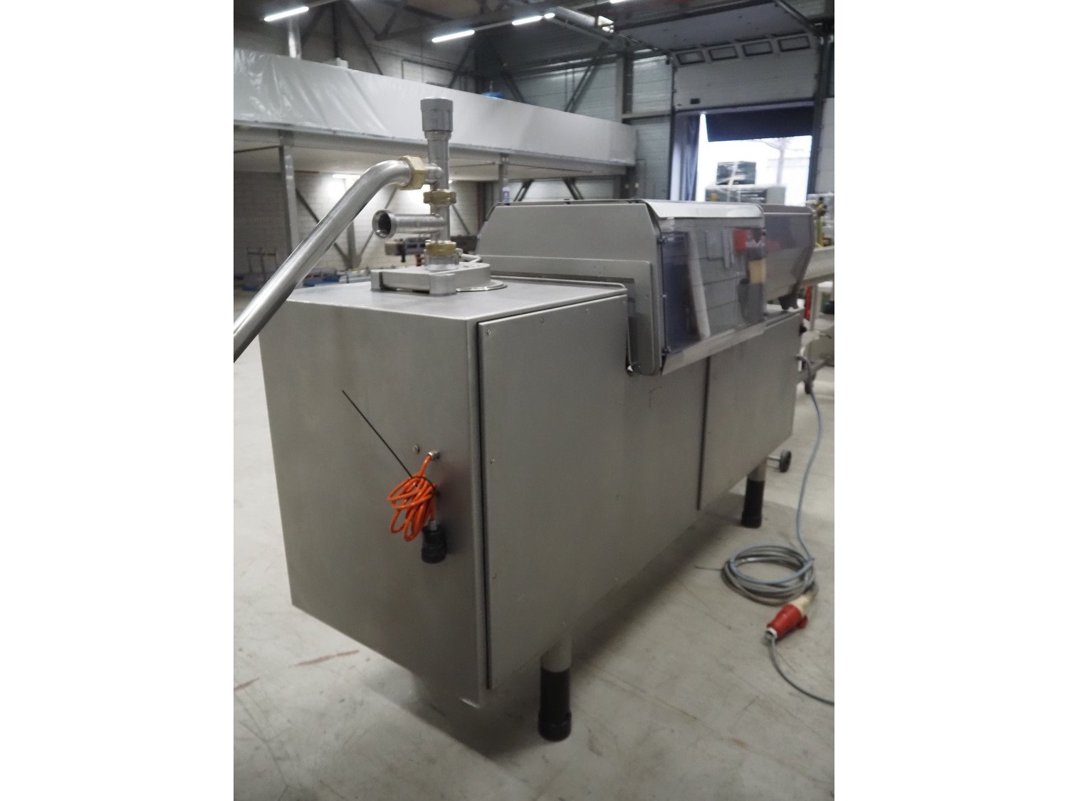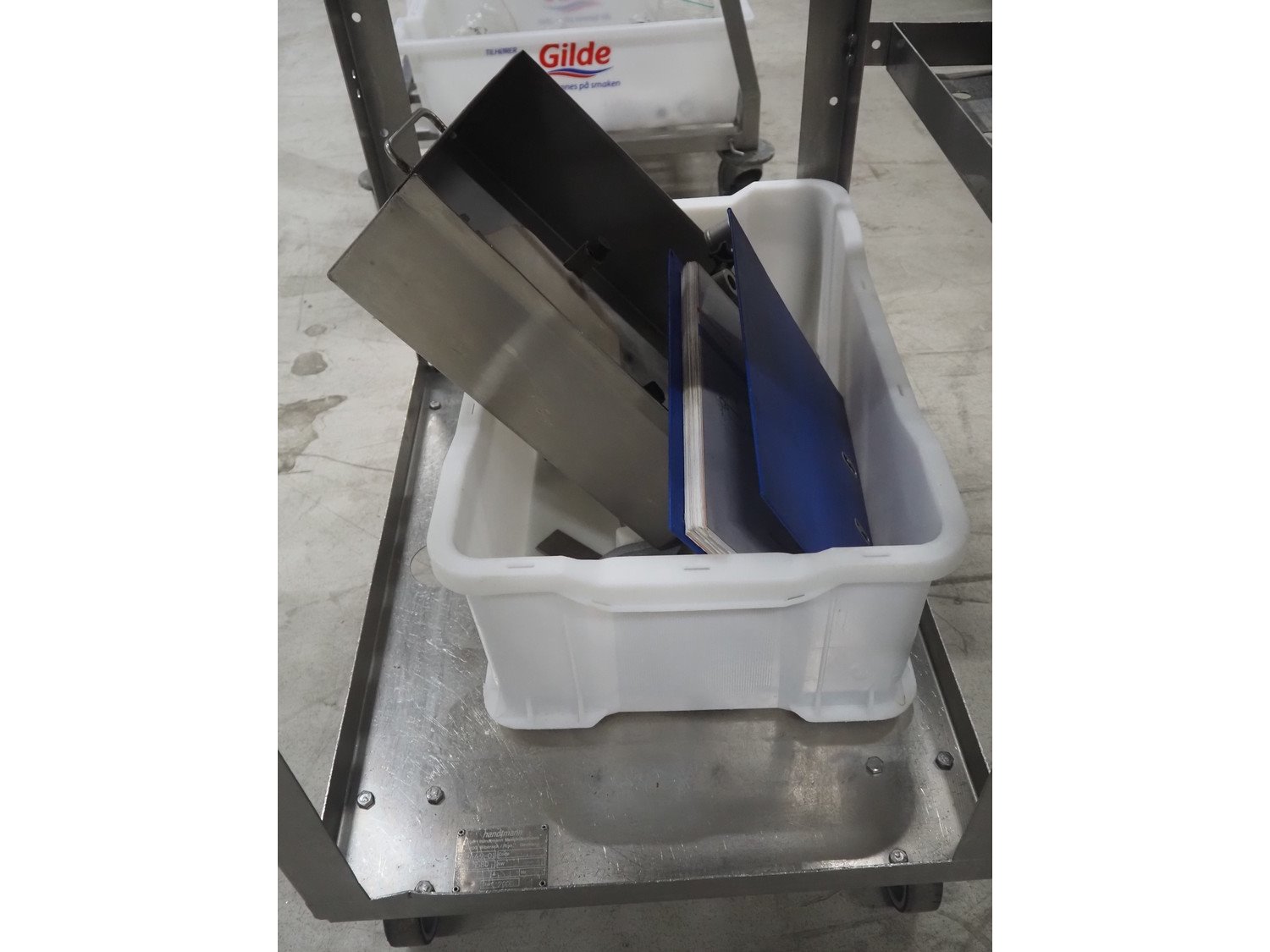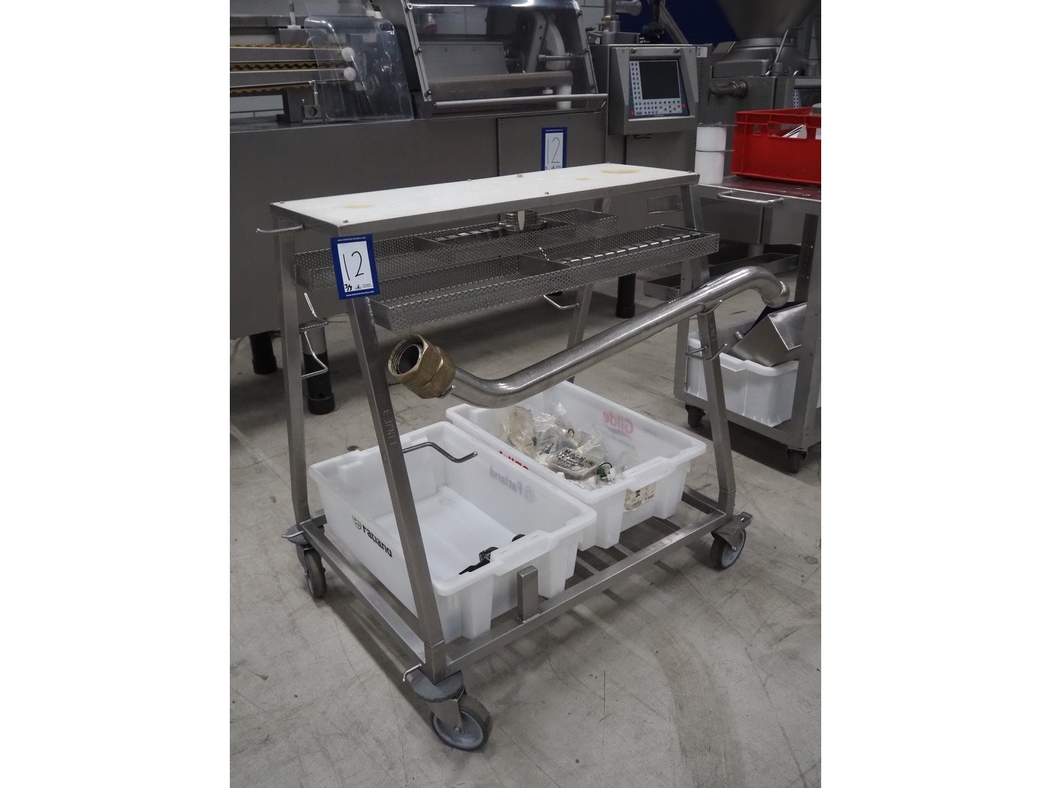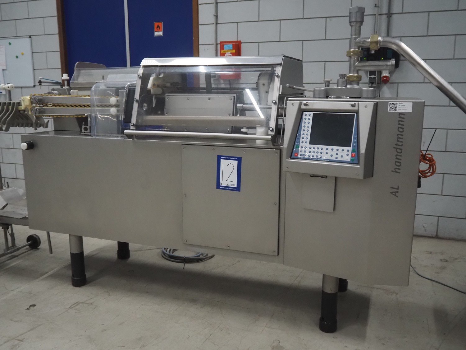 Handtmann mobile portioning and linking machine, type: 242-01, number: 501, year of construction: 2004, 400 V, 3 Ph, 50 Hz, 15 A, 10 kW, dimensions: 2600 mm x 880 mm x 1780 mm. Including 2 tool trolleys, dimensions trolleys: 1050 mm x 750 mm x 1000 mm and 900 mm x 860 mm x 880 mm.