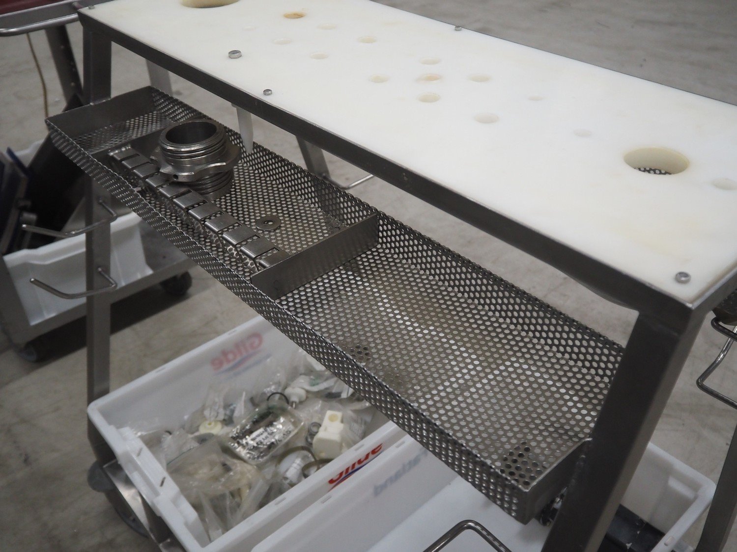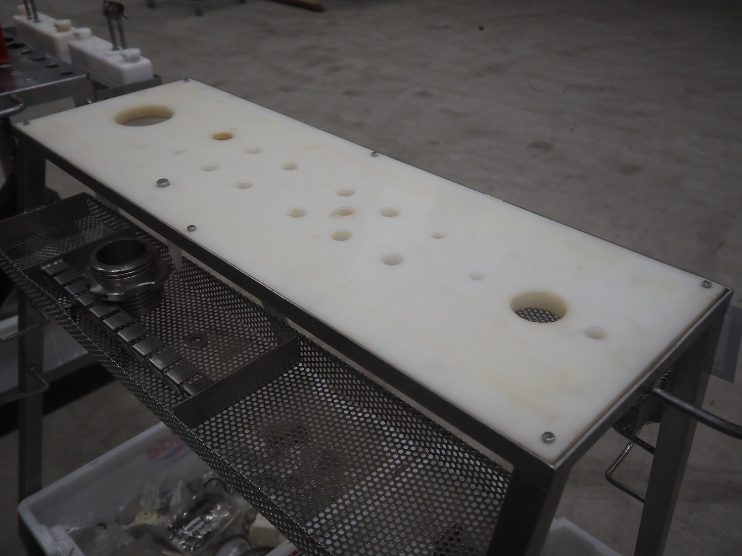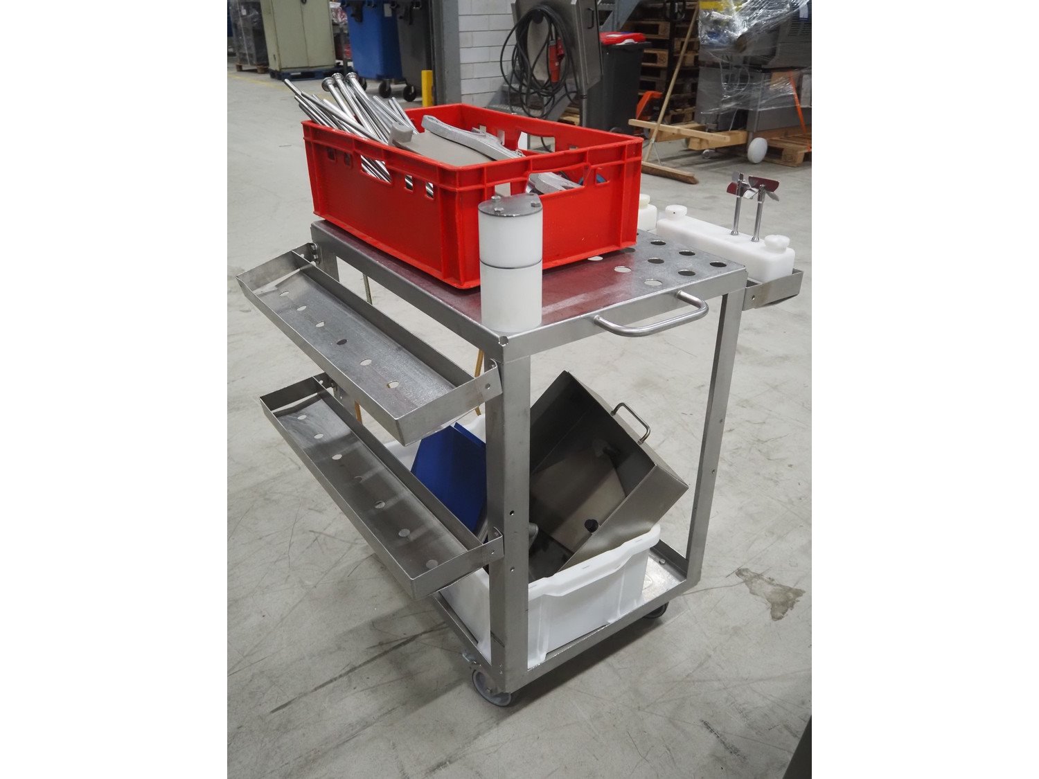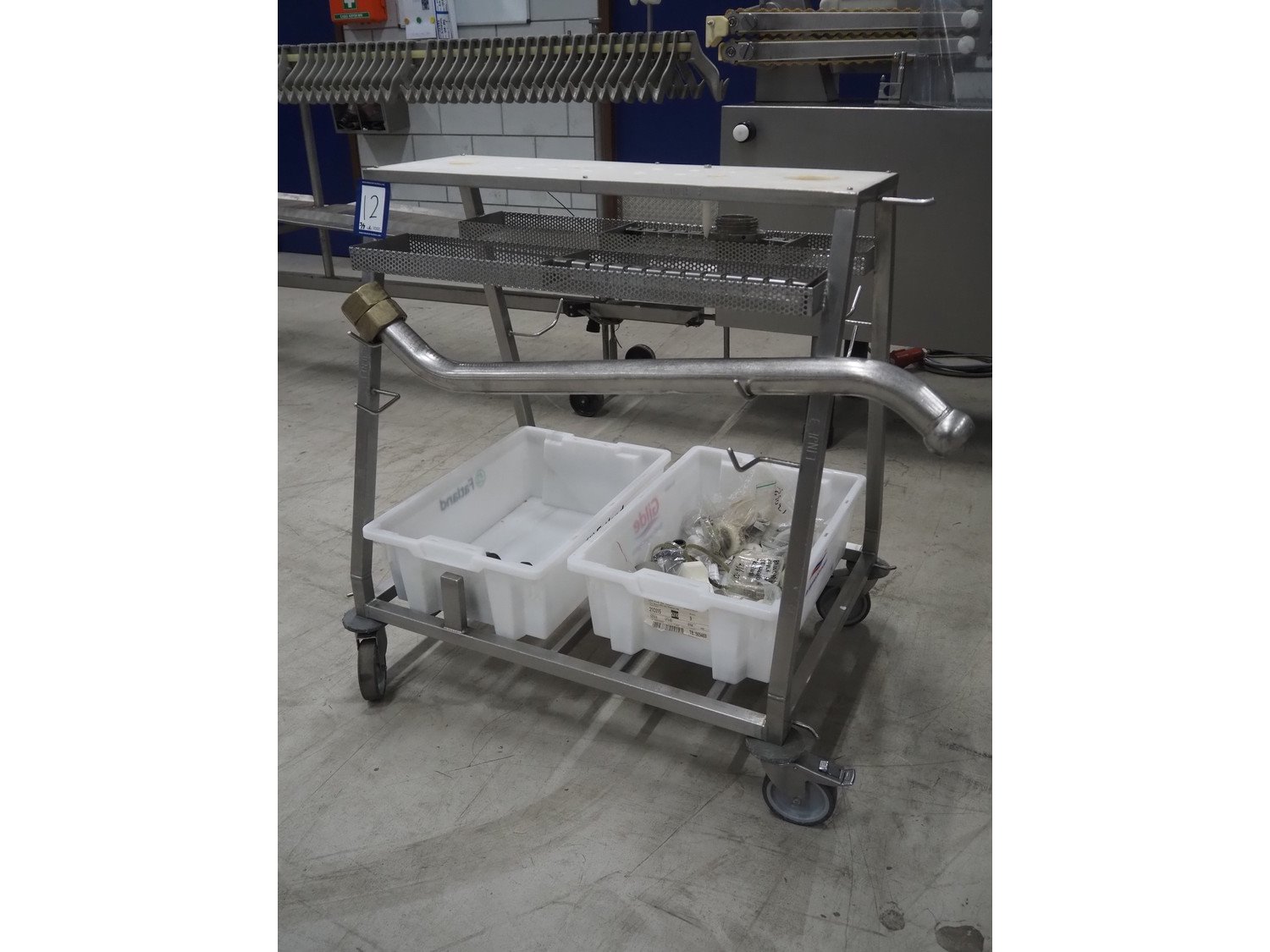 Handtmann mobile portioning and linking machine, type: 242-01, number: 501, year of construction: 2004, 400 V, 3 Ph, 50 Hz, 15 A, 10 kW, dimensions: 2600 mm x 880 mm x 1780 mm. Including 2 tool trolleys, dimensions trolleys: 1050 mm x 750 mm x 1000 mm and 900 mm x 860 mm x 880 mm.