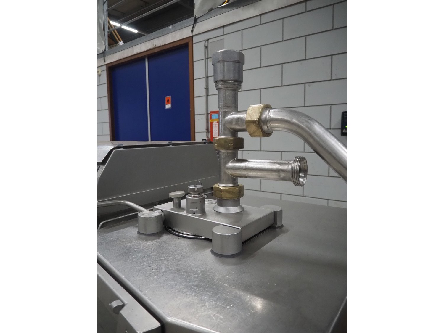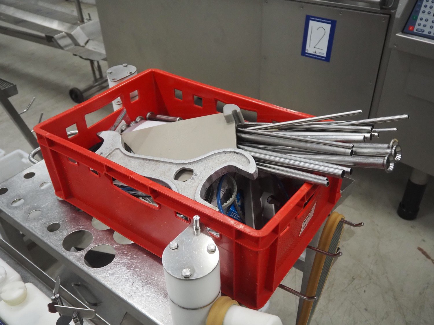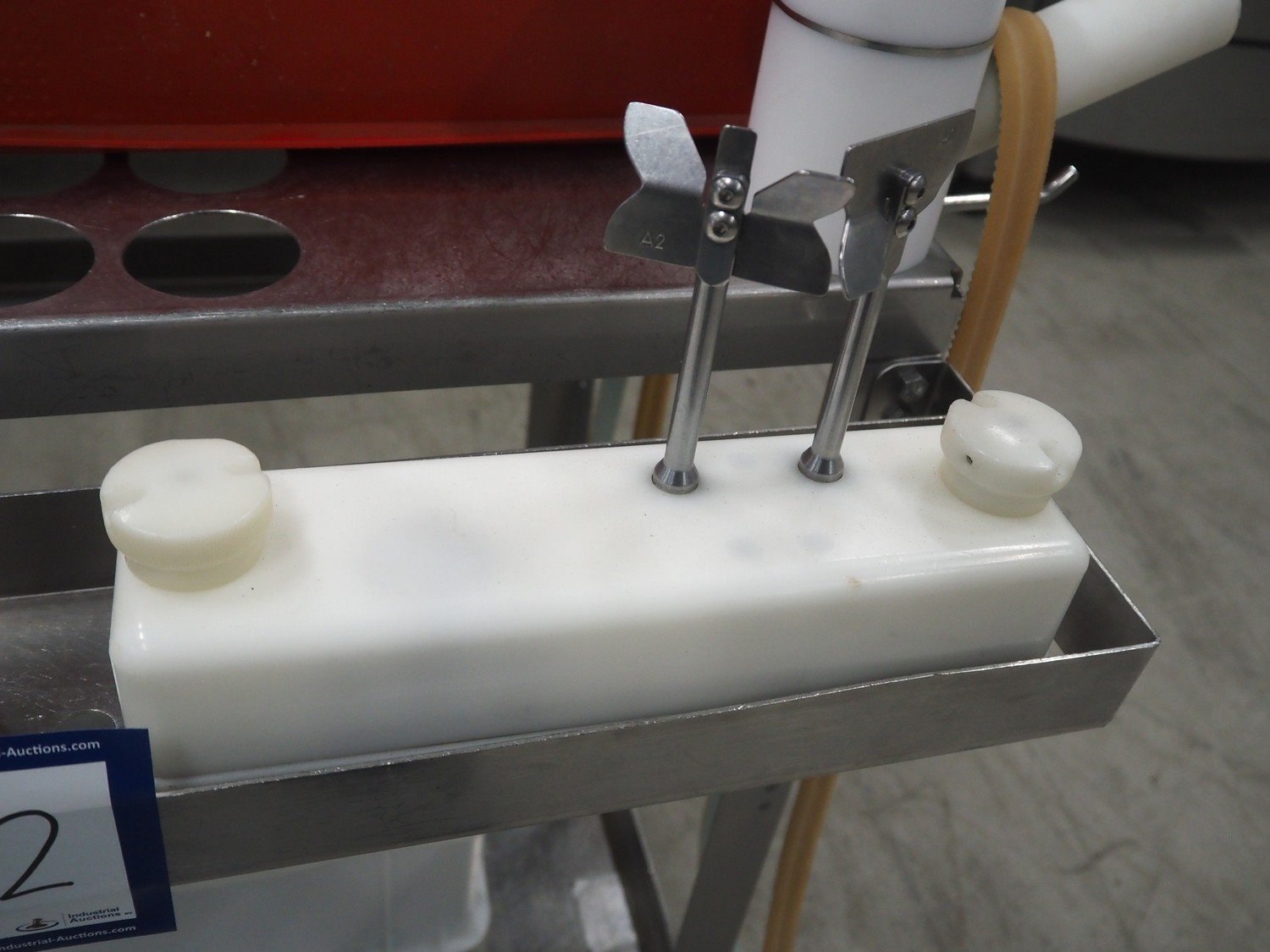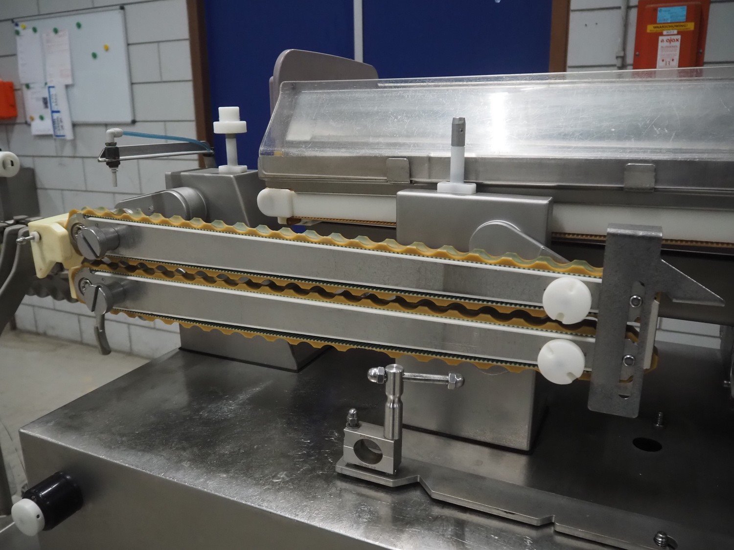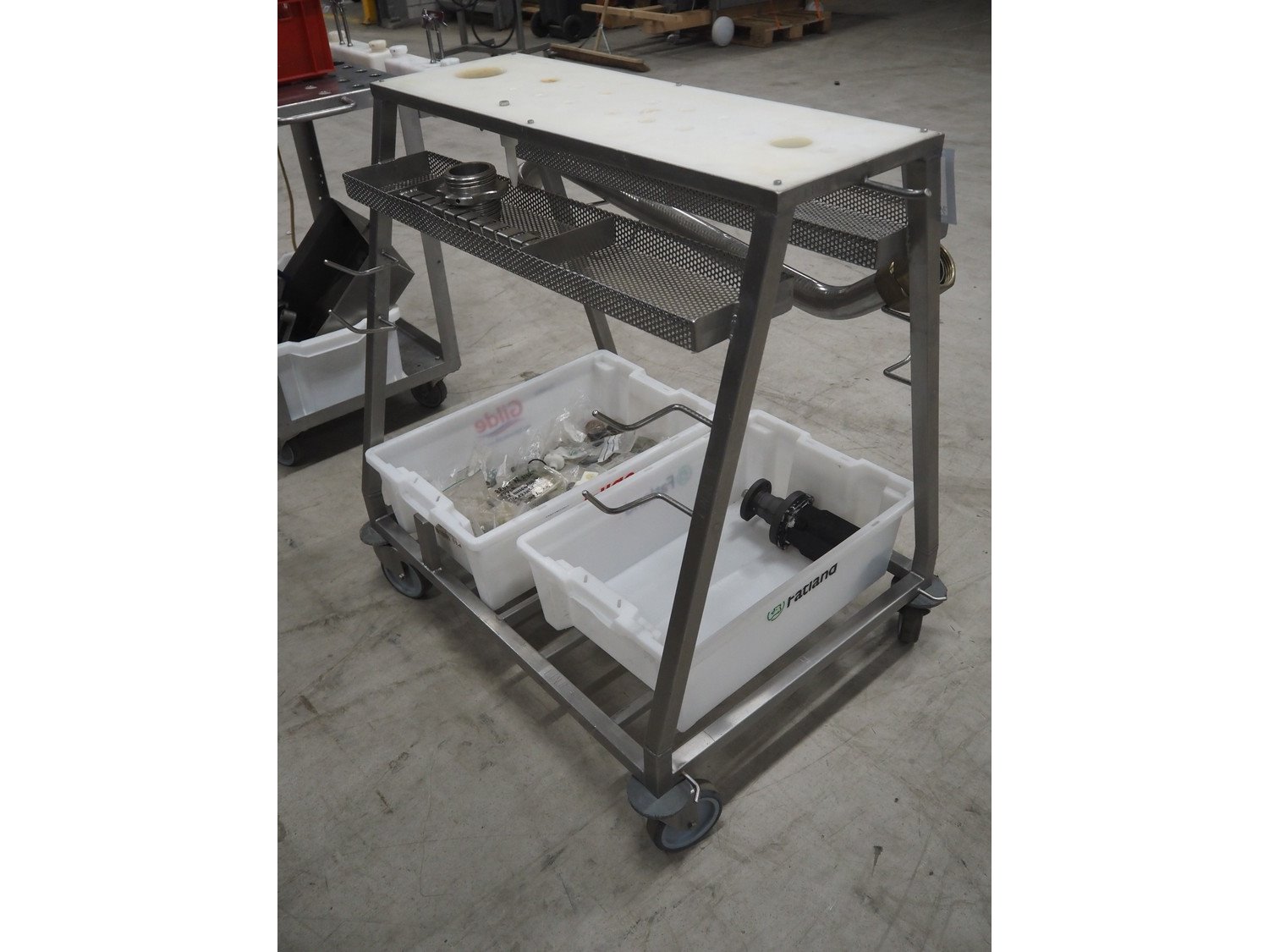Handtmann mobile portioning and linking machine, type: 242-01, number: 501, year of construction: 2004, 400 V, 3 Ph, 50 Hz, 15 A, 10 kW, dimensions: 2600 mm x 880 mm x 1780 mm. Including 2 tool trolleys, dimensions trolleys: 1050 mm x 750 mm x 1000 mm and 900 mm x 860 mm x 880 mm.